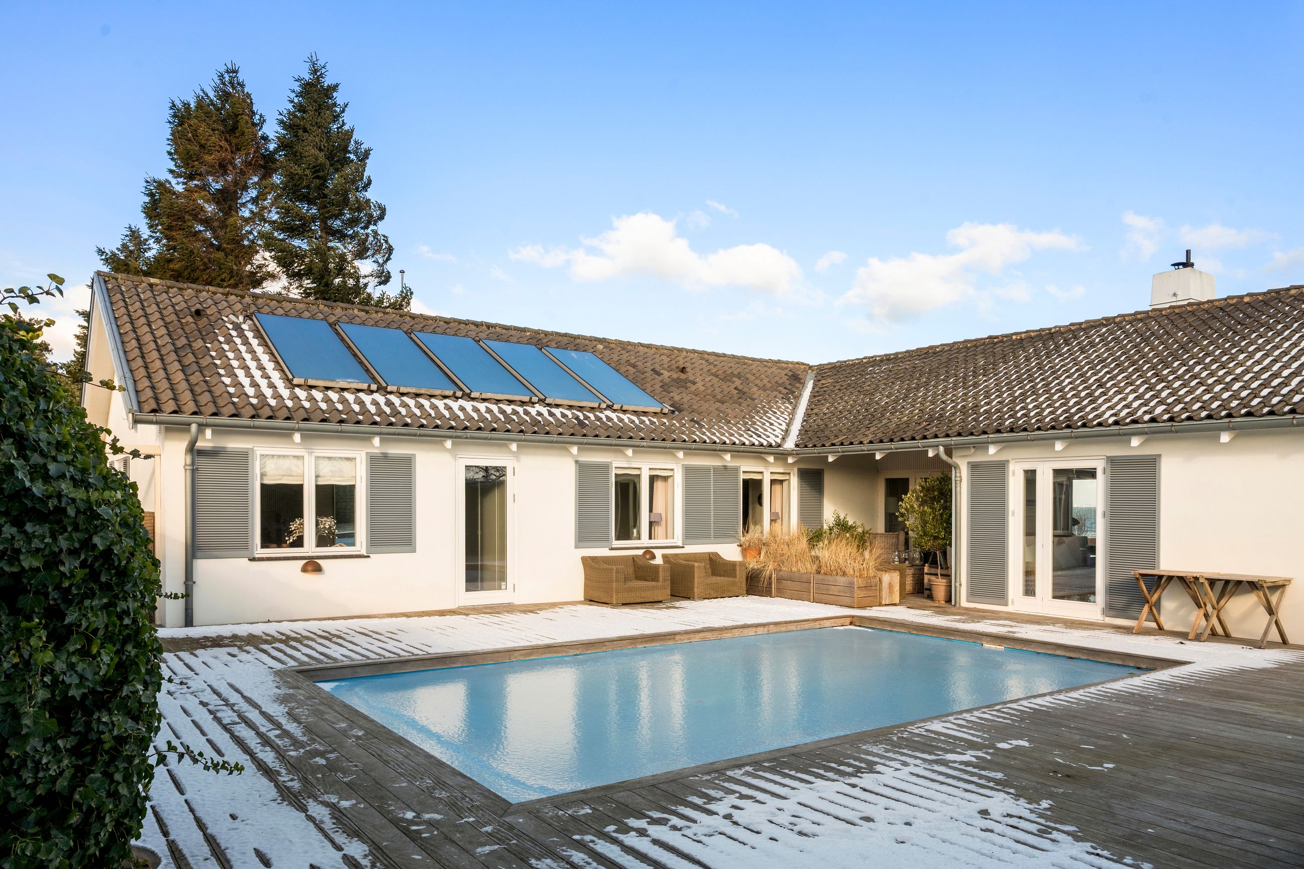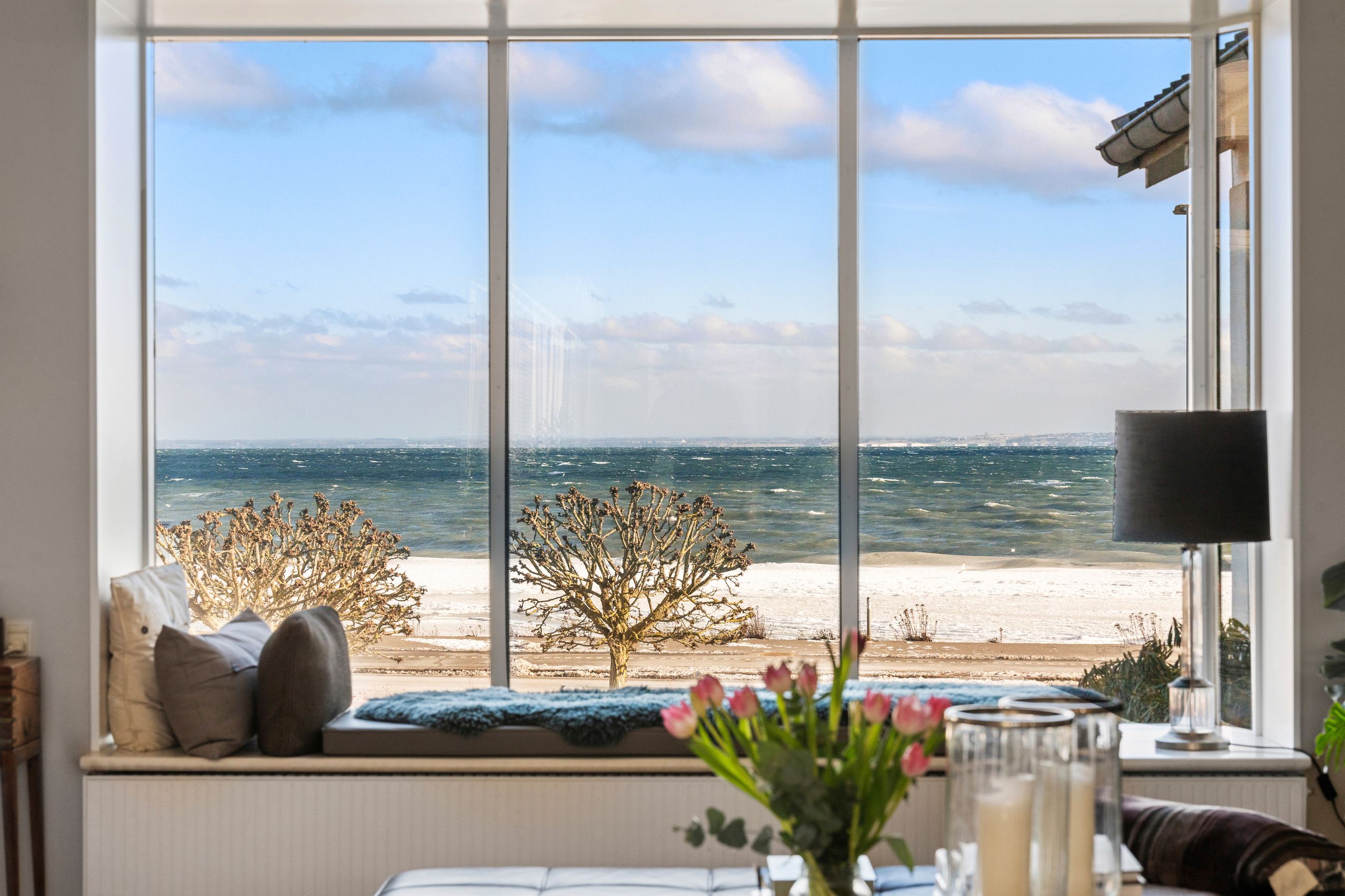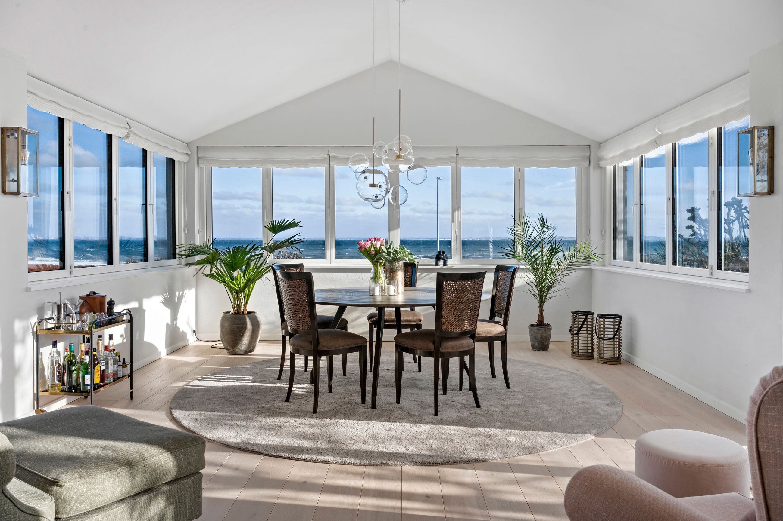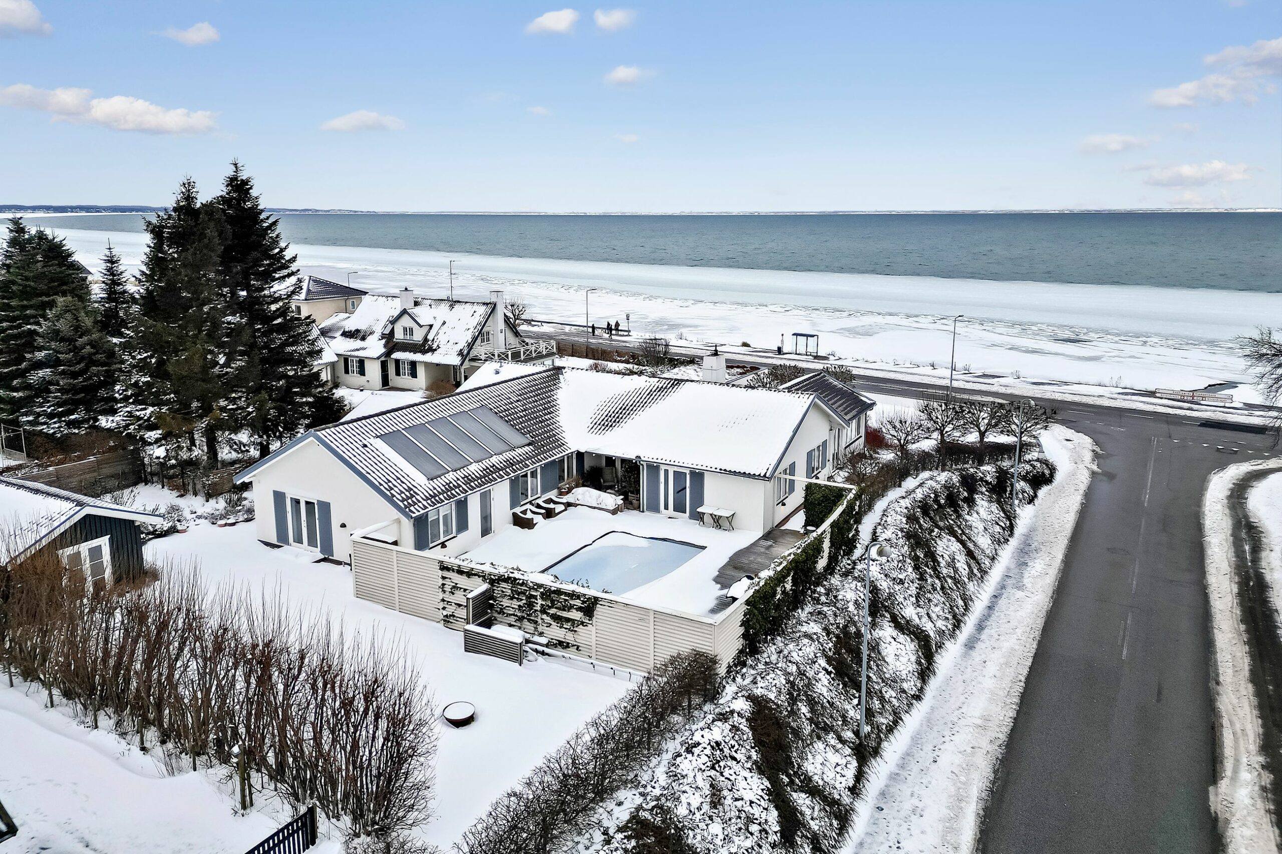 Ejendommen på Rungsted Strandvej ligger i operaens intermezzo i 1. række til stranden og vandet i Øresund. Både matrikel og huset fra 1954 ligger højt i terrænet med en udsigt, som ikke behøver at blive talt op. Selv på en blåfrossen hverdag med klar himmel, og hvor vandet vugger dovent og fastfrosset i flager og spejle, ja, der prøver udsigten ikke at trøste. Næh, den viser, hvor smuk verden også kan være, når den er kold nok til at tale sandt. Så smuk, at man på sådan en dag sætter sig på den nærmeste stol ude eller inde og beskuer det hele. En time forsvinder hurtigt på 5 minutter. Huset er på 293 m2, altså et stort strandvejshus med den skønneste syd- og vestvendte pool i lukket, ugeneret have. Garage med plads til 4 biler, udenfor er der plads til 3 biler. Alt er lige til at flytte ind i. Grunden er stor, 1.938 m2 skrånende ned mod stranden med privat badebrolaug.