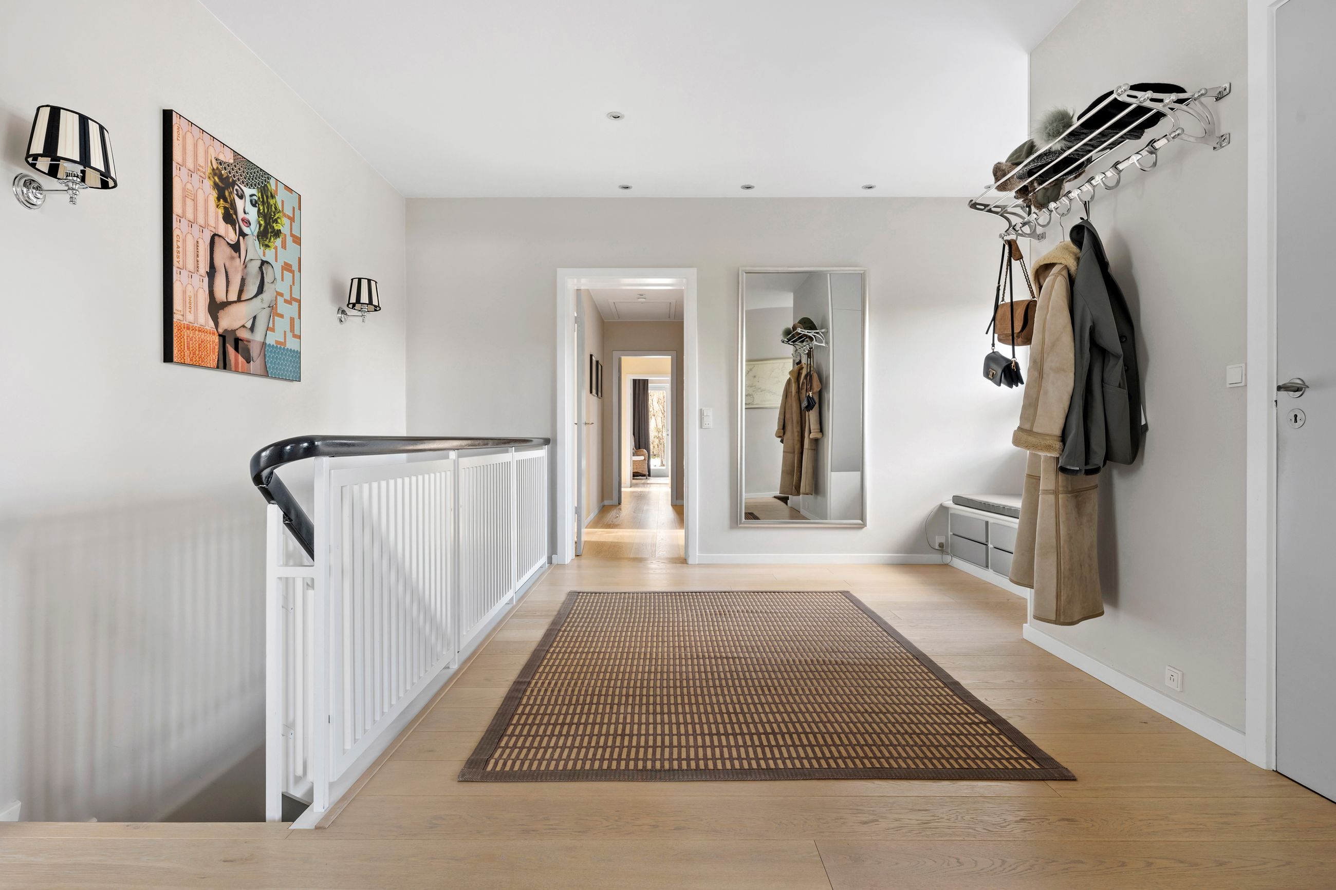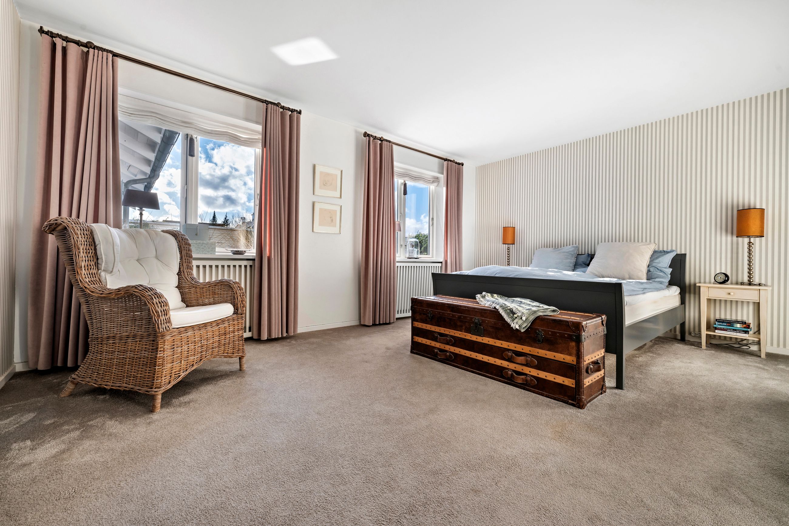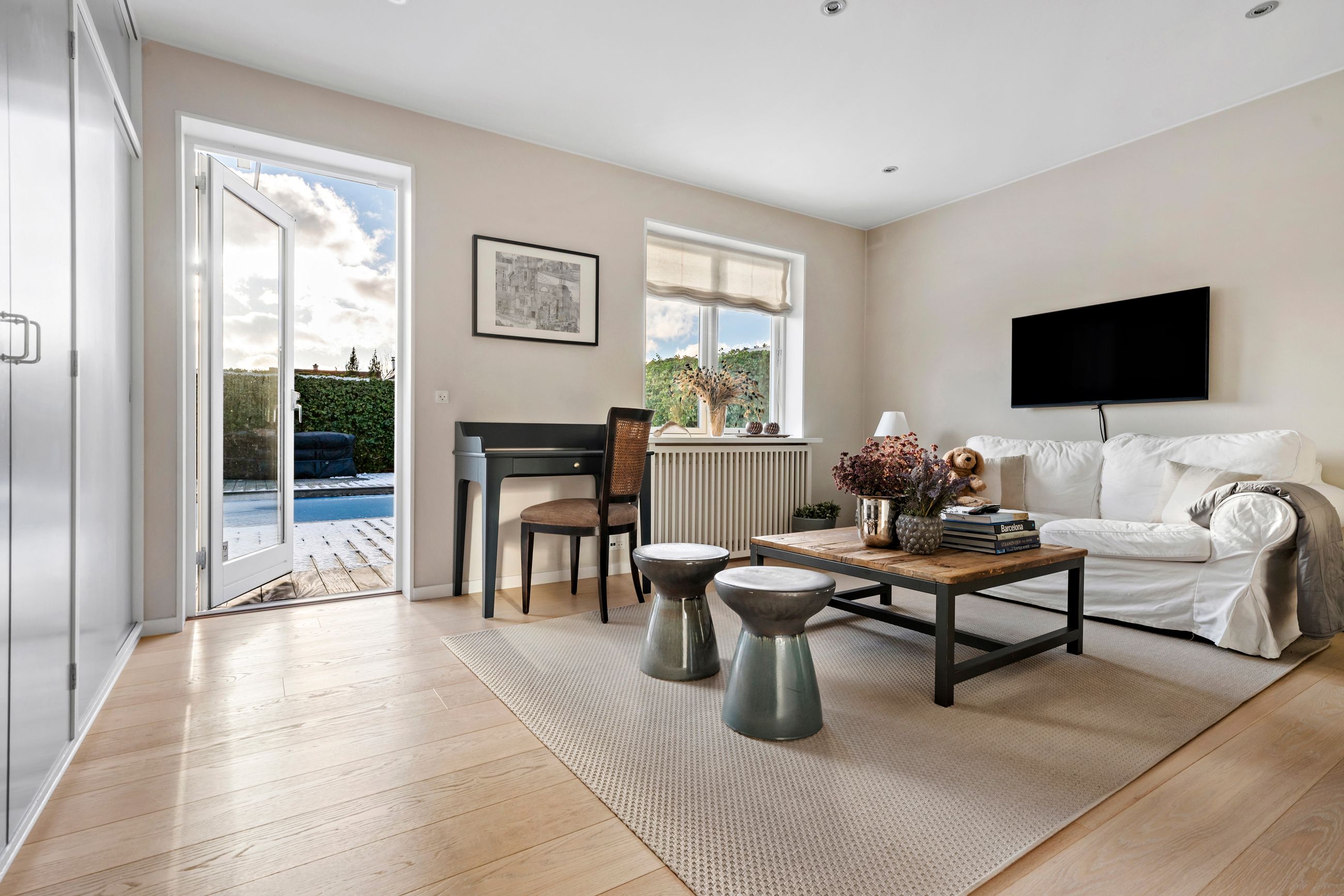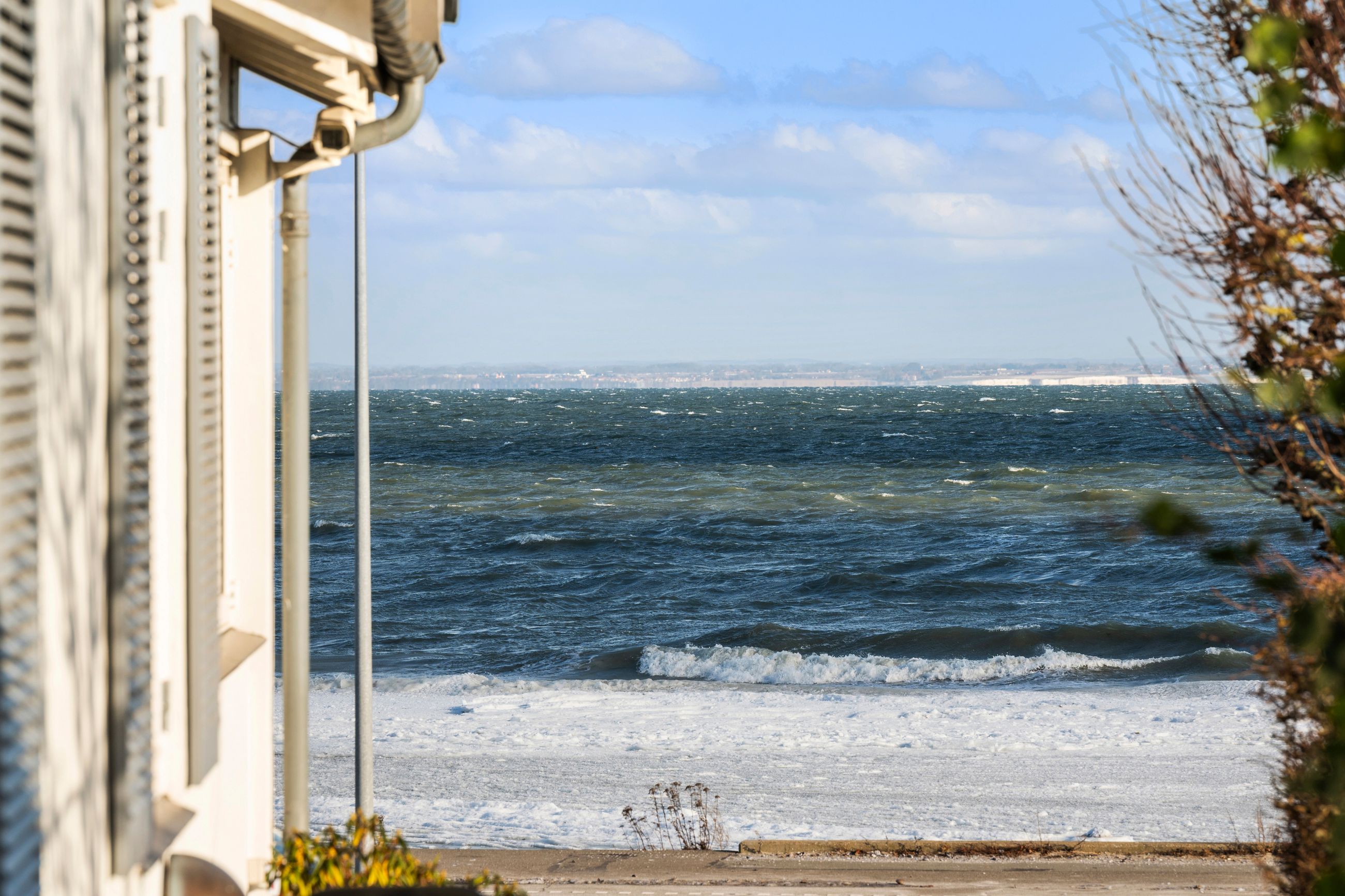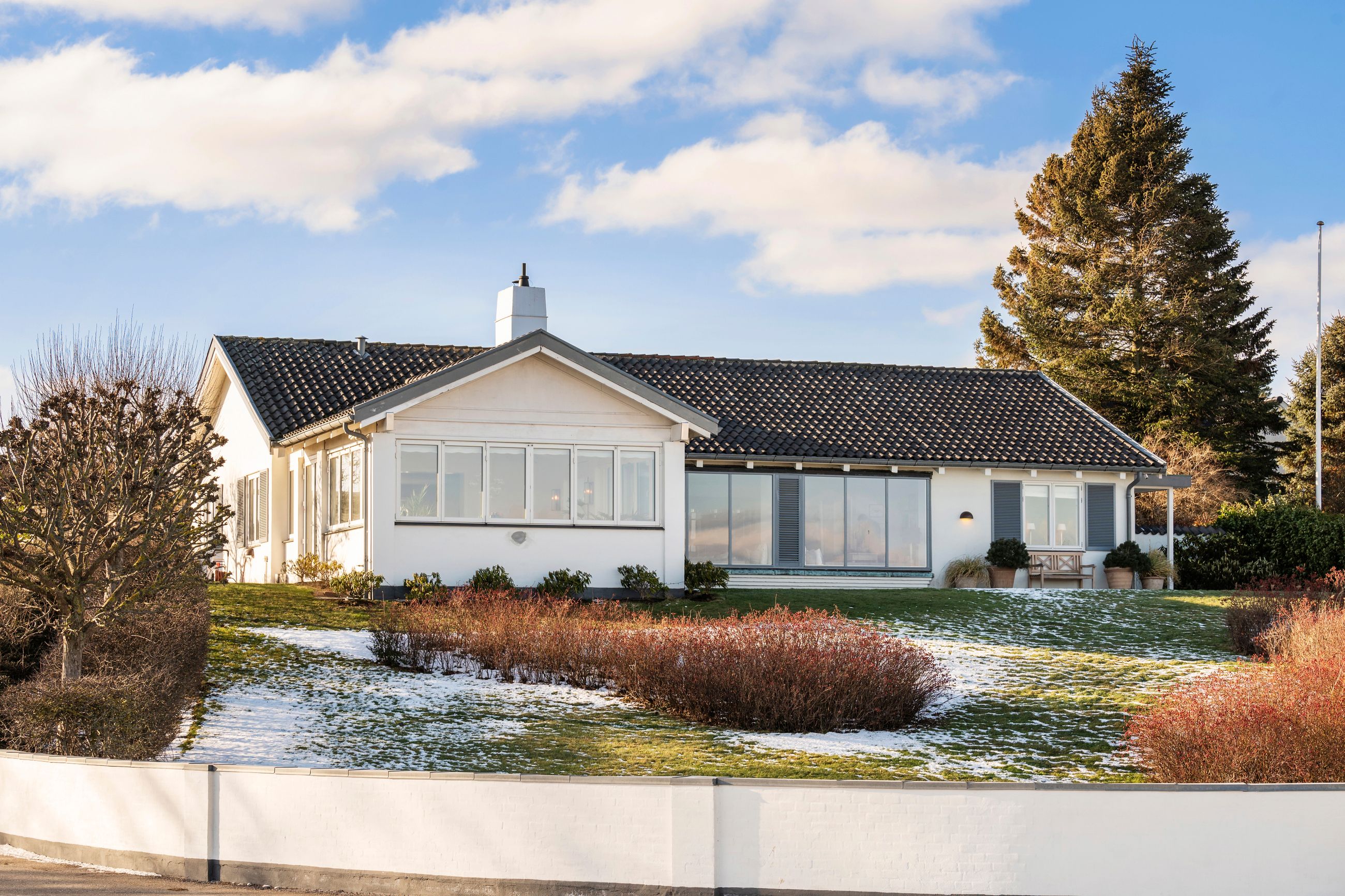 Ejendommen på Rungsted Strandvej ligger i operaens intermezzo i 1. række til stranden og vandet i Øresund. Både matrikel og huset fra 1954 ligger højt i terrænet med en udsigt, som ikke behøver at blive talt op. Selv på en blåfrossen hverdag med klar himmel, og hvor vandet vugger dovent og fastfrosset i flager og spejle, ja, der prøver udsigten ikke at trøste. Næh, den viser, hvor smuk verden også kan være, når den er kold nok til at tale sandt. Så smuk, at man på sådan en dag sætter sig på den nærmeste stol ude eller inde og beskuer det hele. En time forsvinder hurtigt på 5 minutter. Huset er på 293 m2, altså et stort strandvejshus med den skønneste syd- og vestvendte pool i lukket, ugeneret have. Garage med plads til 4 biler, udenfor er der plads til 3 biler. Alt er lige til at flytte ind i. Grunden er stor, 1.938 m2 skrånende ned mod stranden med privat badebrolaug.