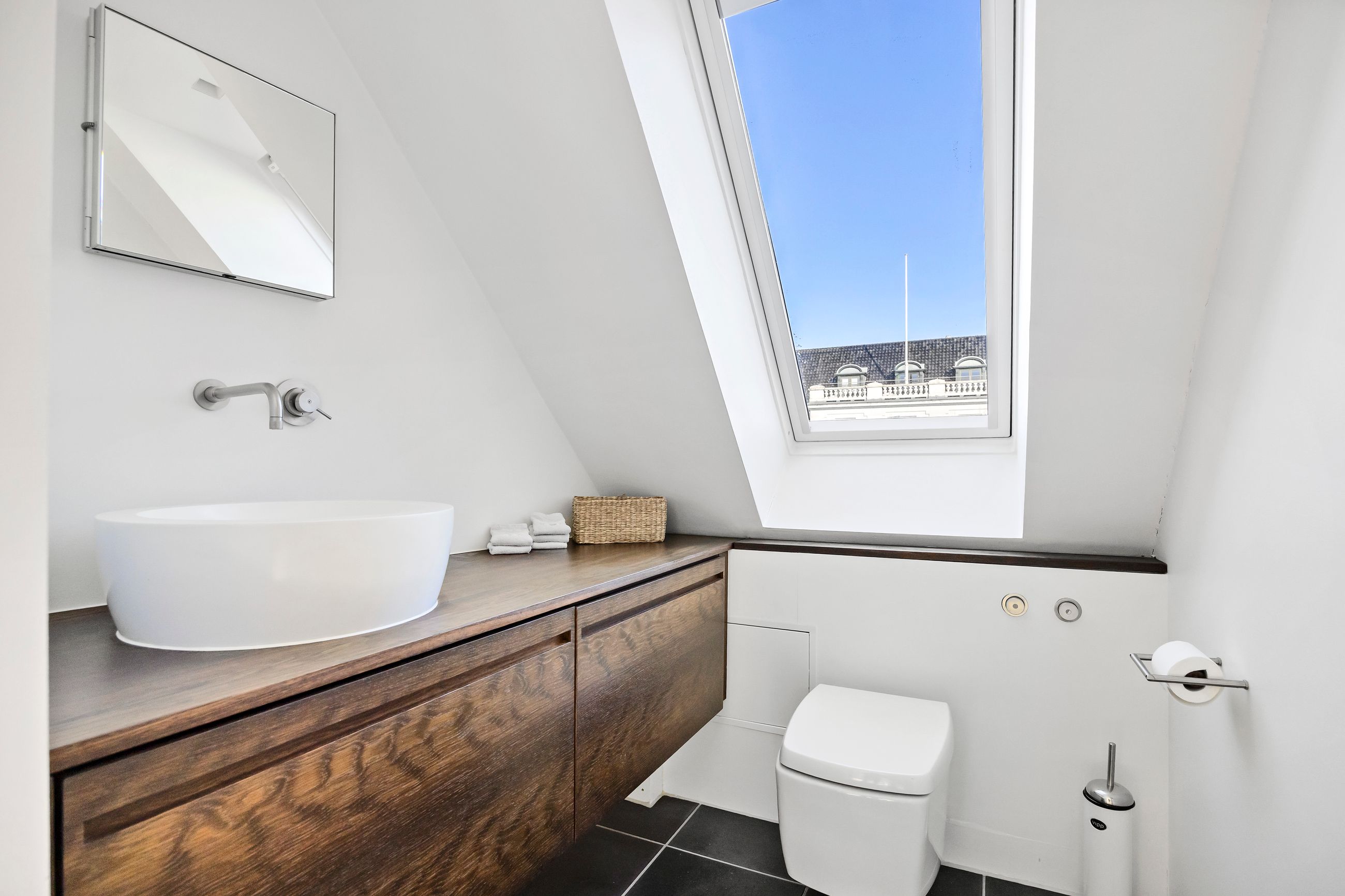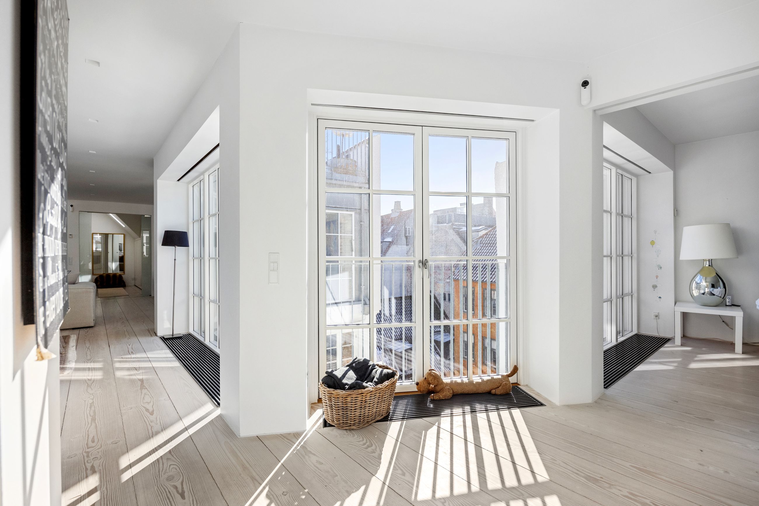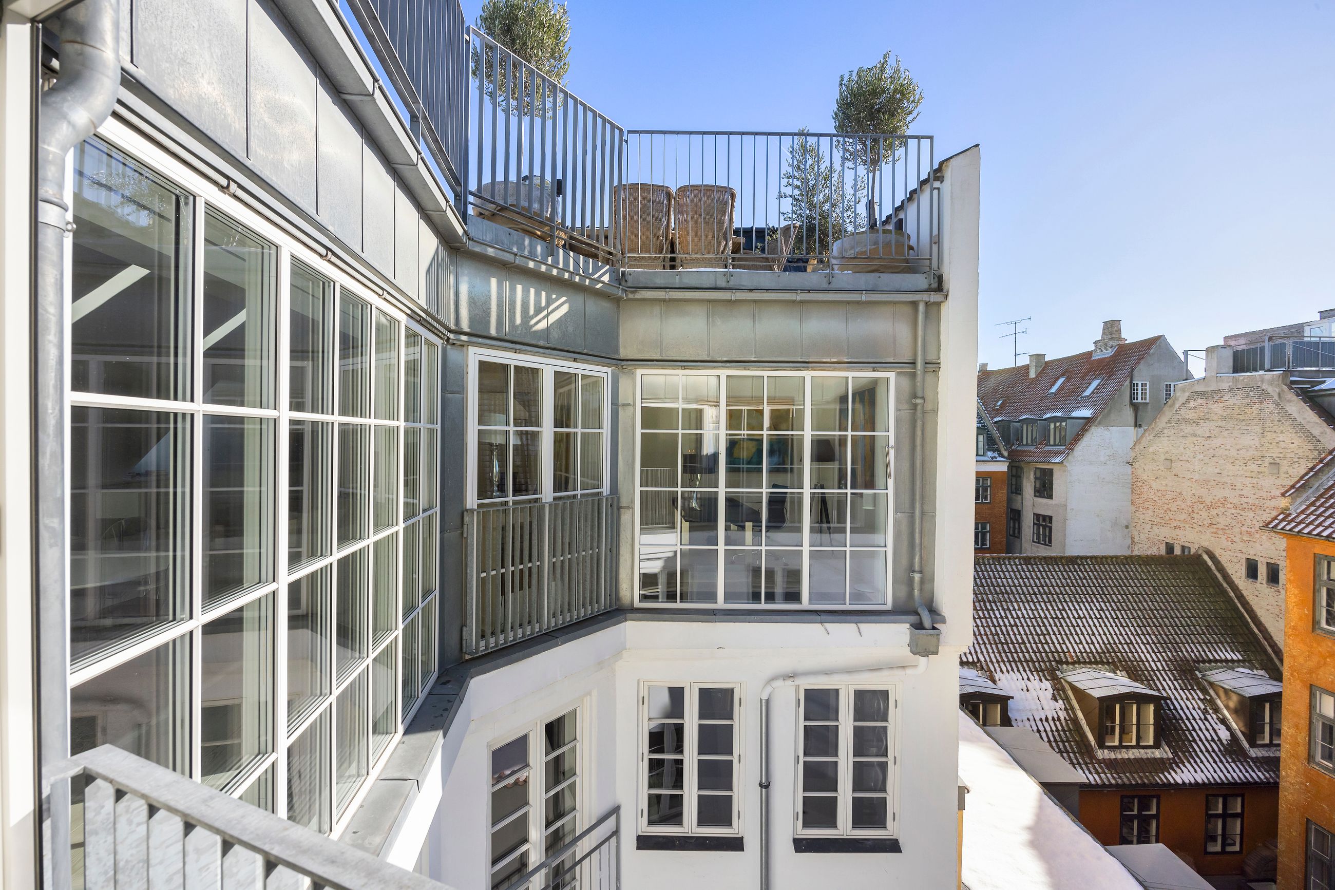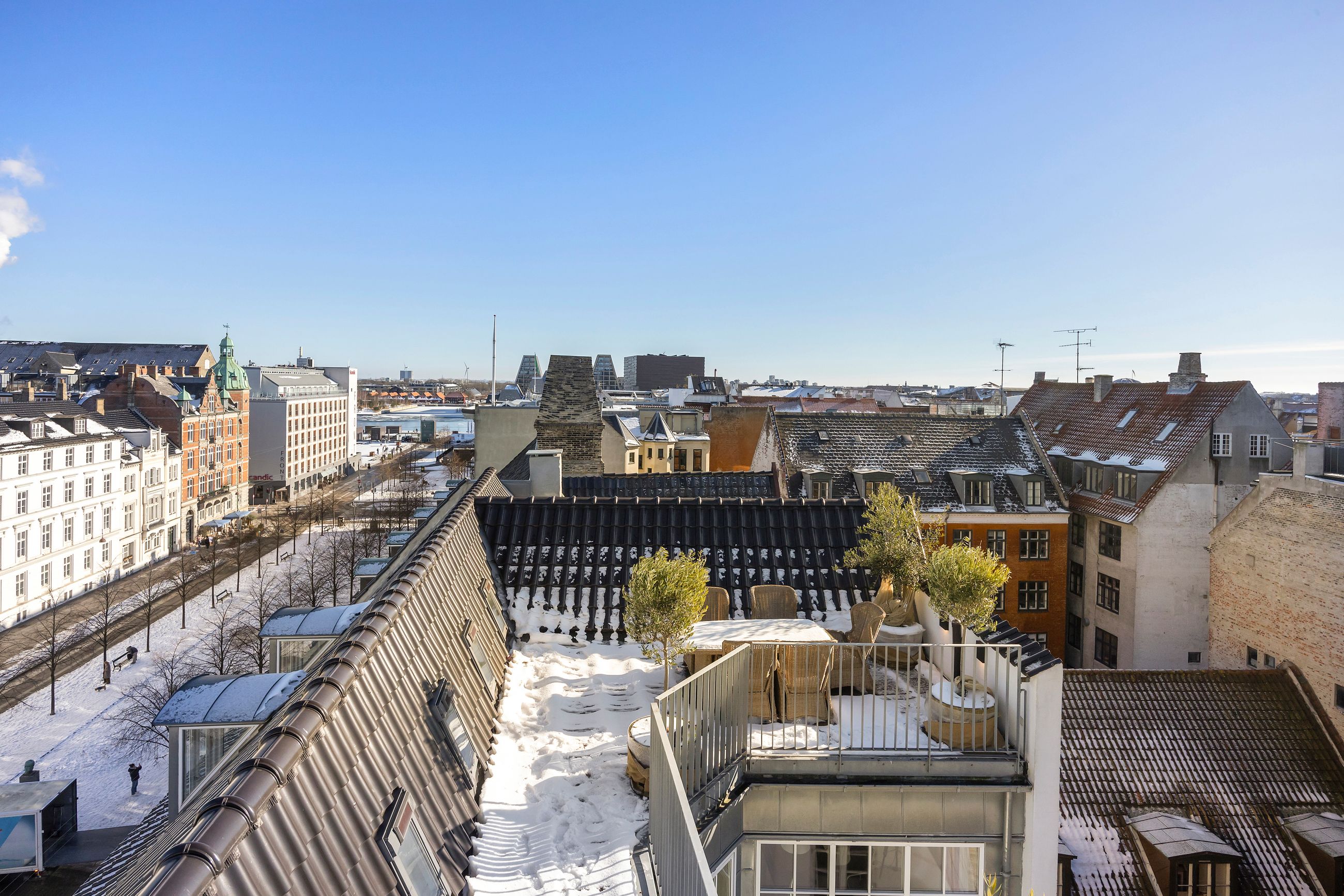 Og sikken plads. Kunne pladser vælge beliggenhed, ville de alle ligge, hvor Sankt Annæ Plads ligger. Ejendommen Sankt Annæ Plads 8 er fra slutningen af 1700-tallet, altså samme alder som oplysningstiden. Lejligheden på 4. sal er på 150 m2 med indvendig trappe op til privat tagterrasse på 45 m2. Sydvendt er terrassen, tusind tak, så her er der fred og ro, læ, pippende byfugle i luften og sol på maverne det meste af dagen. Uforskammet lækker er den, renoveret og lige til at flytte ind i. Den ligger solitært på etagen som sit eget, lille eventyr med gedigne, knastfrie, brede planker på gulvet, loft til kip, masser af lys, Gaggenau vinkøleskab, elektroniske Velux vinduer og 2 franske altaner. En hyggelig bonus er udsigten til Marmorkirkens kuppel og statuen af kirkemusikeren JPE Hartmann mod Bredgade.