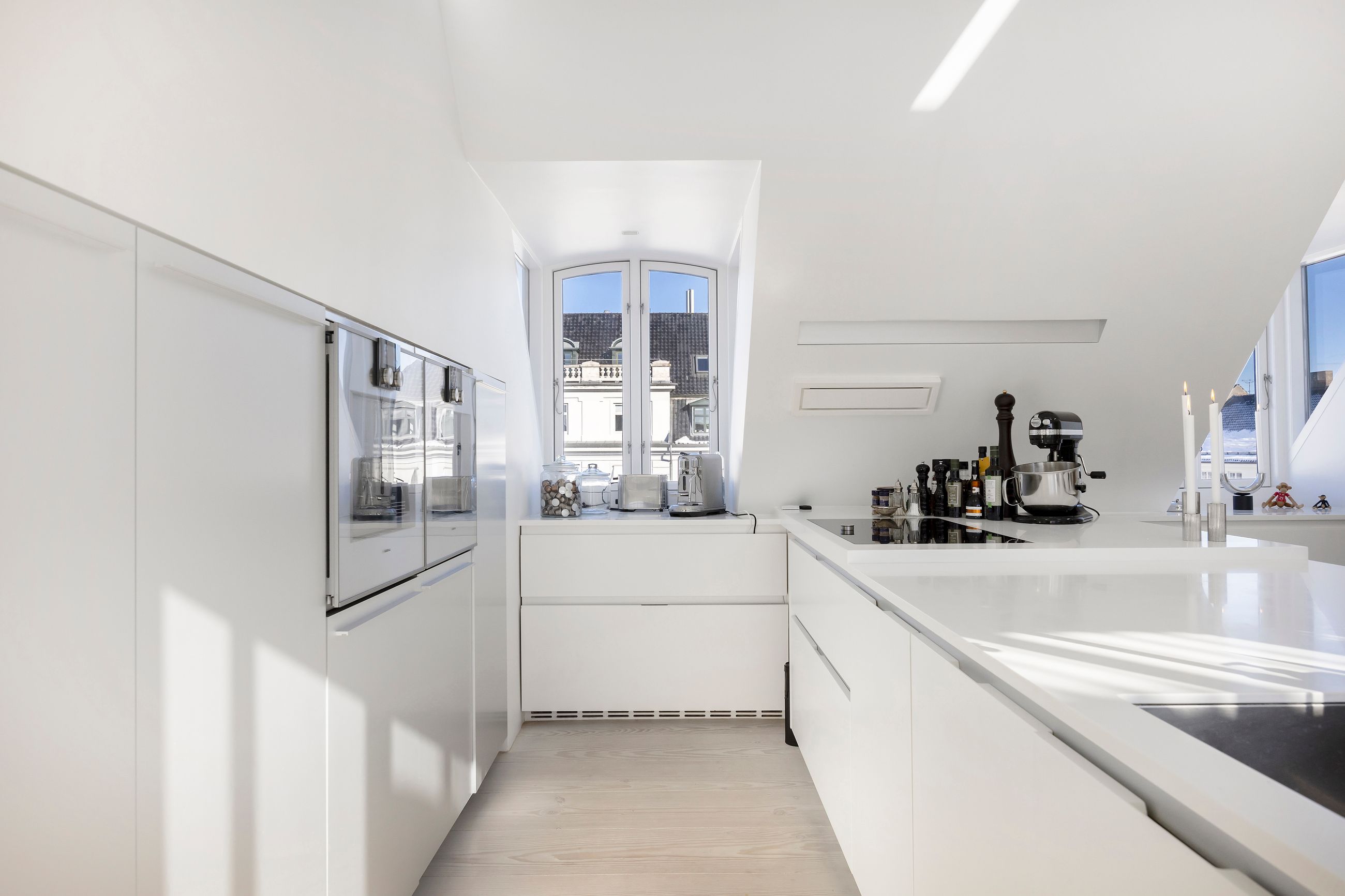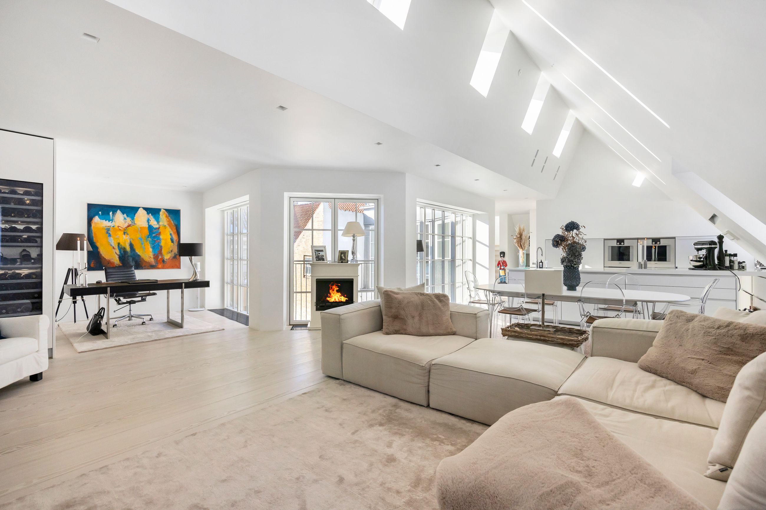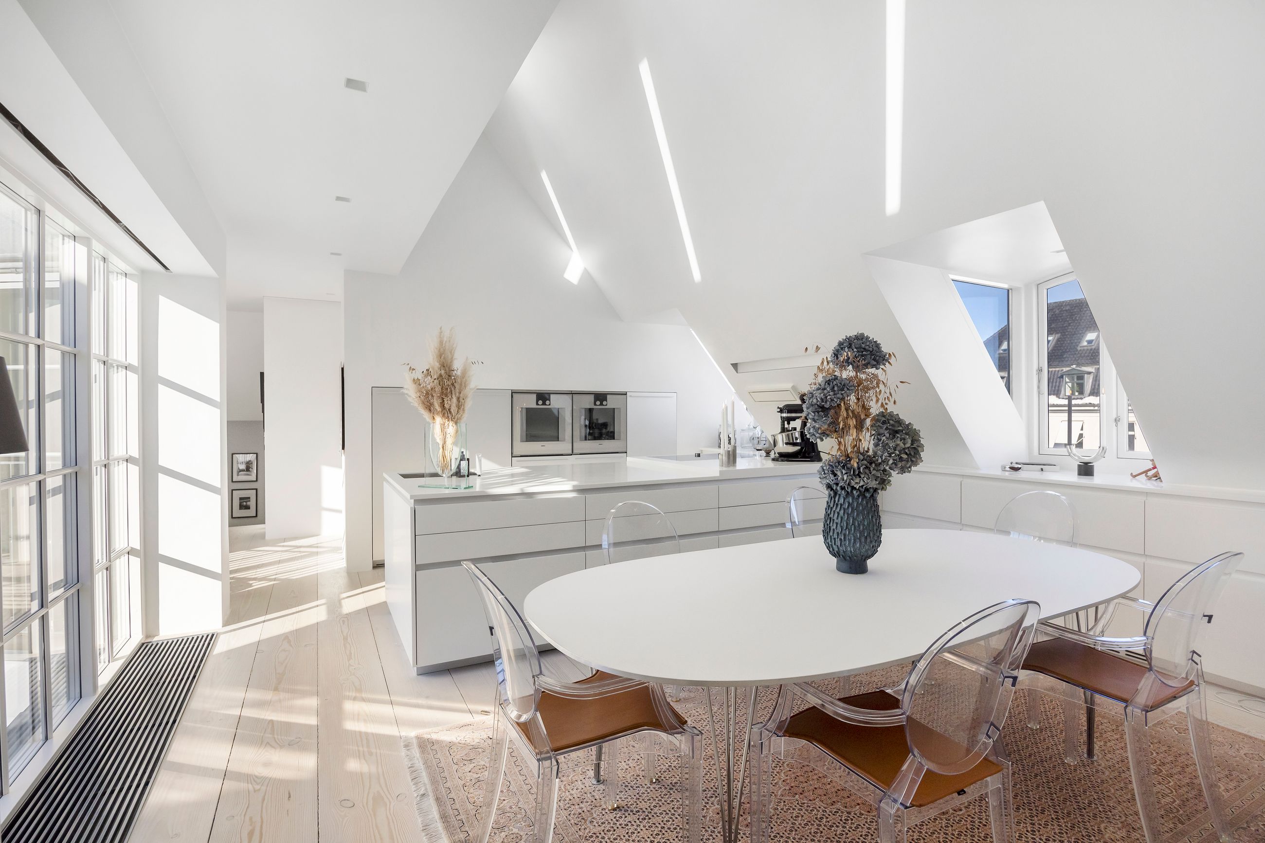 Og sikken plads. Kunne pladser vælge beliggenhed, ville de alle ligge, hvor Sankt Annæ Plads ligger. Ejendommen Sankt Annæ Plads 8 er fra slutningen af 1700-tallet, altså samme alder som oplysningstiden. Lejligheden på 4. sal er på 150 m2 med indvendig trappe op til privat tagterrasse på 45 m2. Sydvendt er terrassen, tusind tak, så her er der fred og ro, læ, pippende byfugle i luften og sol på maverne det meste af dagen. Uforskammet lækker er den, renoveret og lige til at flytte ind i. Den ligger solitært på etagen som sit eget, lille eventyr med gedigne, knastfrie, brede planker på gulvet, loft til kip, masser af lys, Gaggenau vinkøleskab, elektroniske Velux vinduer og 2 franske altaner. En hyggelig bonus er udsigten til Marmorkirkens kuppel og statuen af kirkemusikeren JPE Hartmann mod Bredgade.
