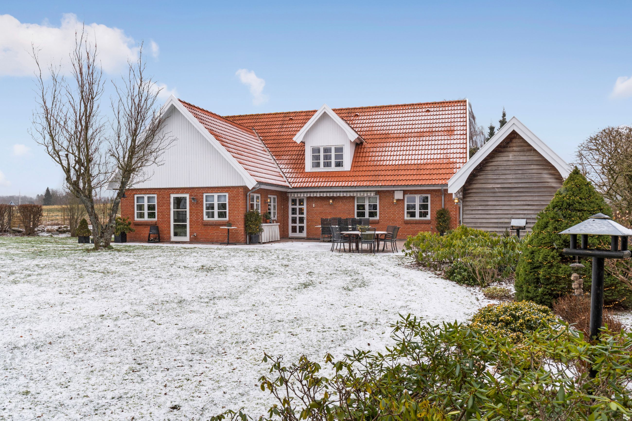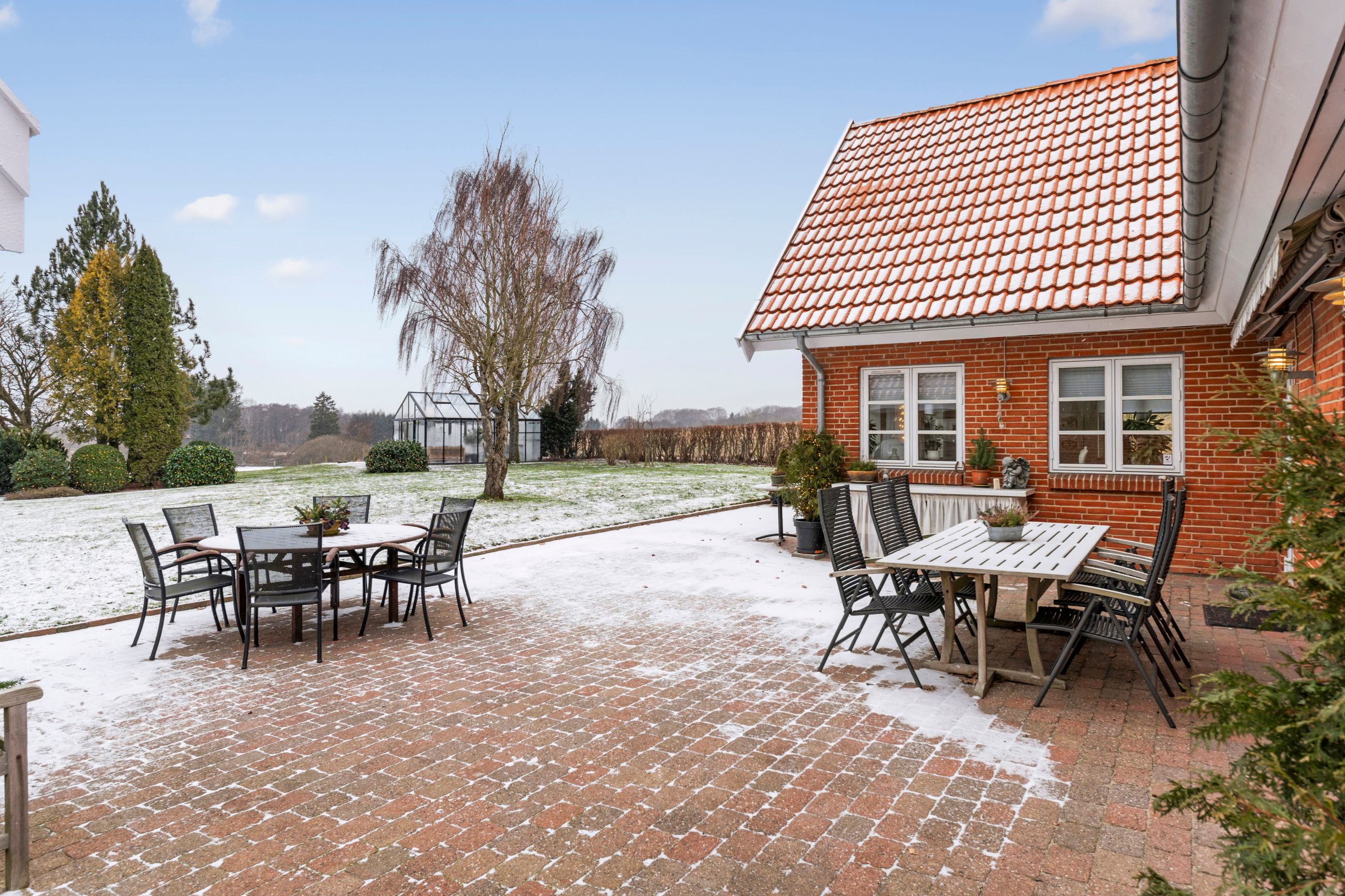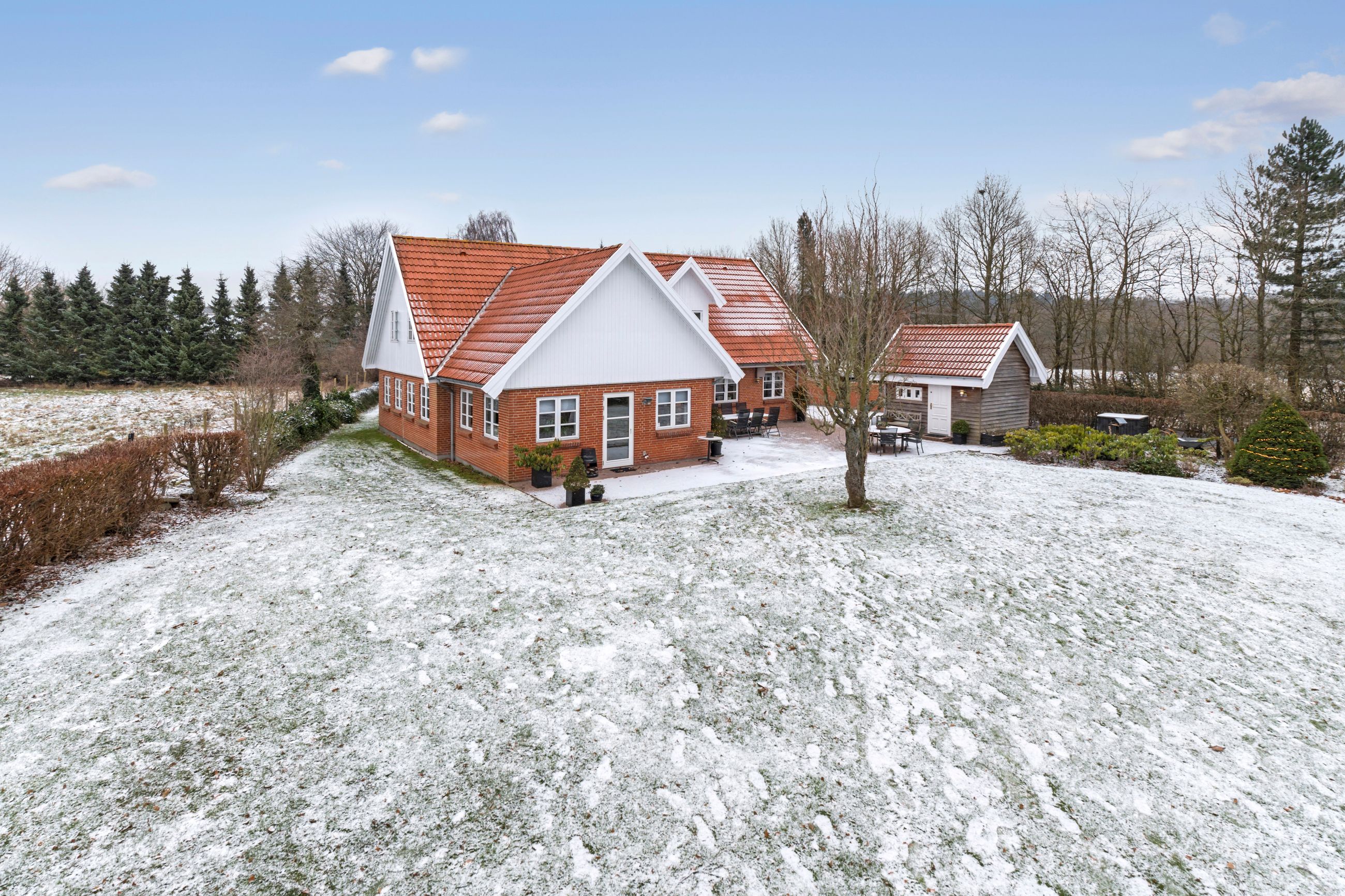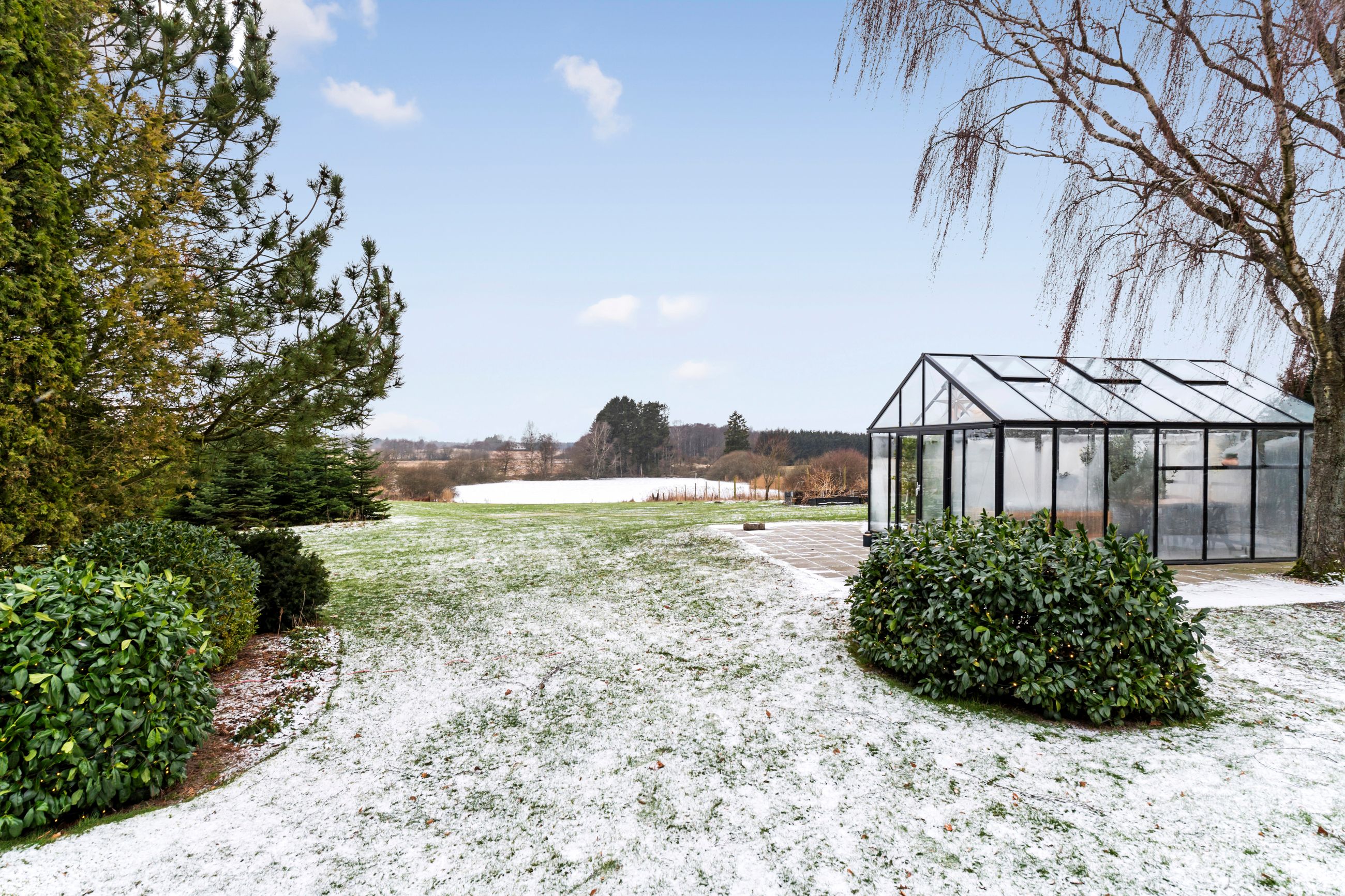 En lille granplantage mod syd, en smuk sø for enden af en let skrånende grund mod vest og bølgende marker mod nord er de skønne omgivelser, der omkranser den 6.600 m2 store grund. Huset ligger højt i terrænet, så der er udsigt over hele området, og solen har de allerbedste betingelser dagen igennem. Orangeriet er smukt placeret i midten af idyllen, her kan man nyde freden og stilheden, læse en god bog, spise middag med venner eller familie, også uden for højsæsonen. Gårdspladsen bag huset har plads til parkering af flere biler, og den store terrasse foran huset ligger i læ og er nærmest solbeskinnet hele dagen.
