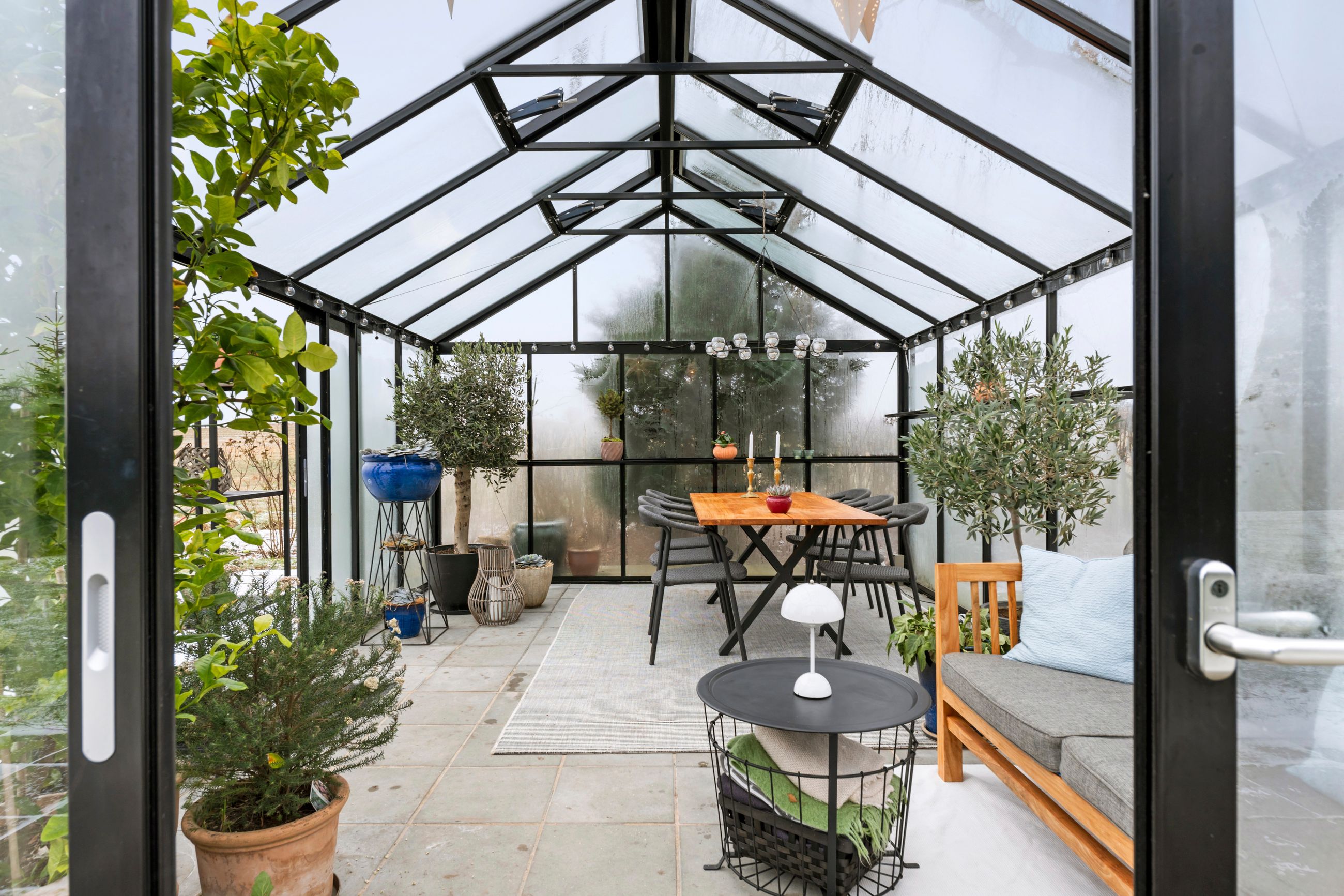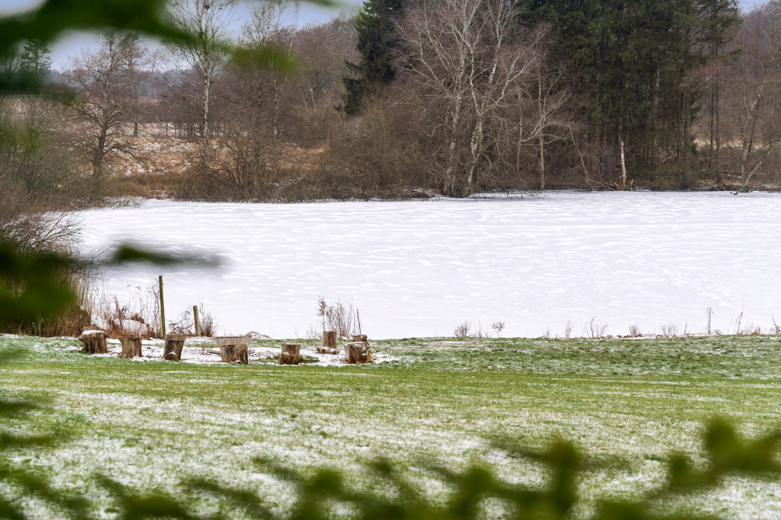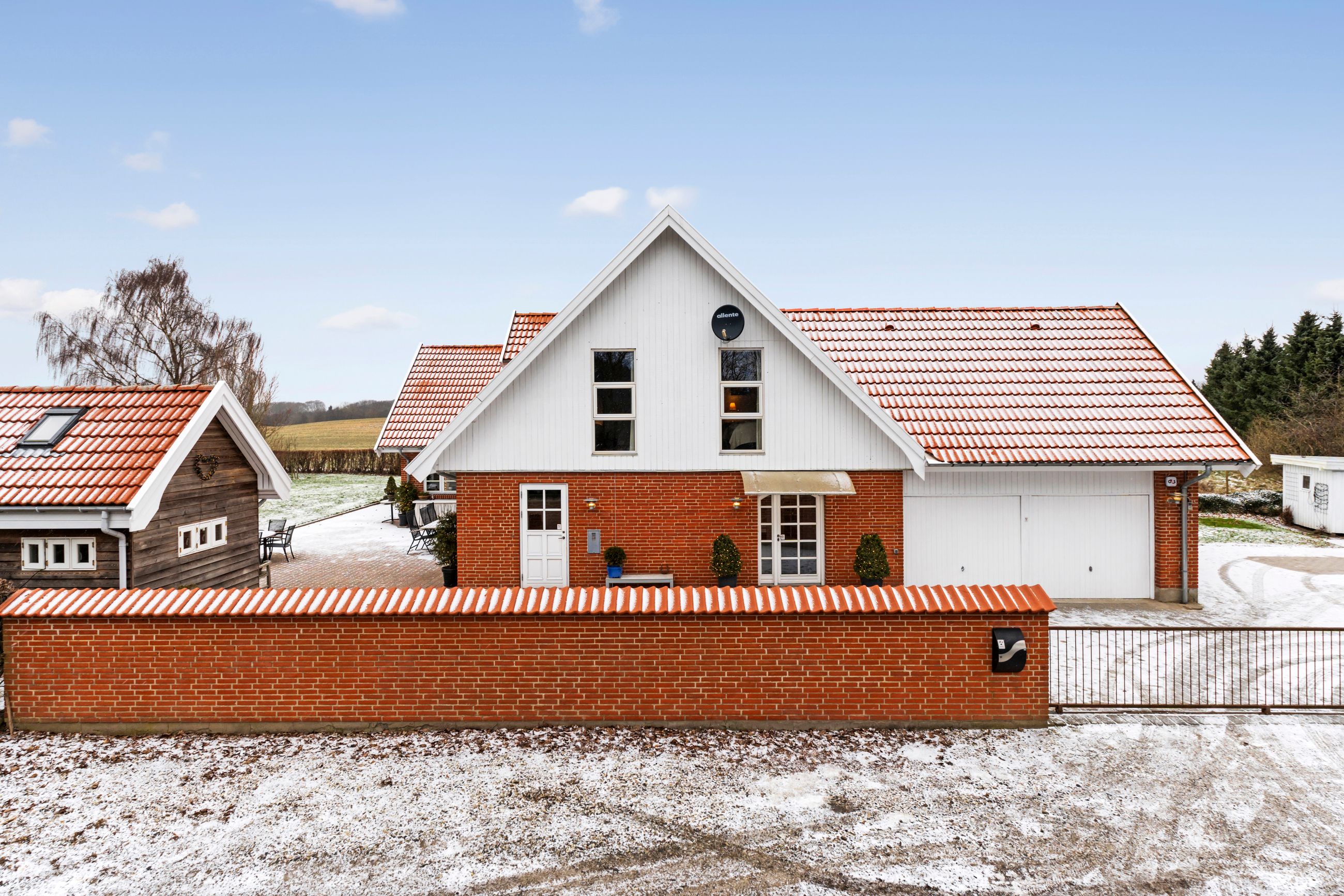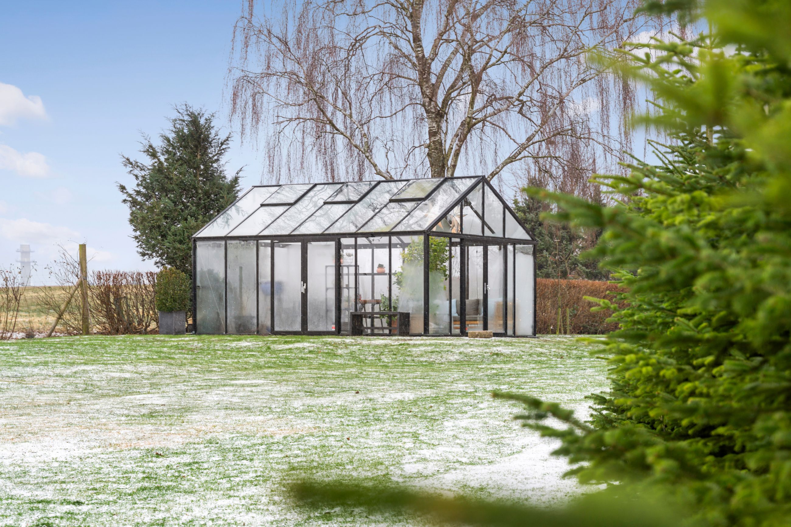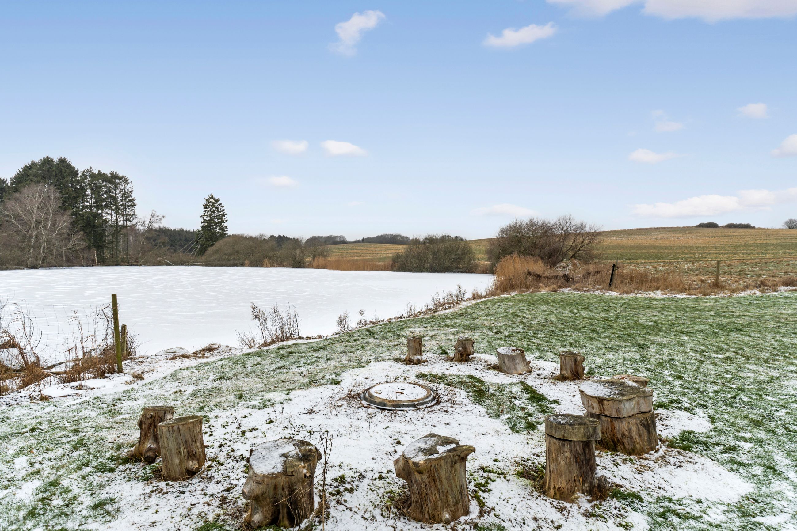 En lille granplantage mod syd, en smuk sø for enden af en let skrånende grund mod vest og bølgende marker mod nord er de skønne omgivelser, der omkranser den 6.600 m2 store grund. Huset ligger højt i terrænet, så der er udsigt over hele området, og solen har de allerbedste betingelser dagen igennem. Orangeriet er smukt placeret i midten af idyllen, her kan man nyde freden og stilheden, læse en god bog, spise middag med venner eller familie, også uden for højsæsonen. Gårdspladsen bag huset har plads til parkering af flere biler, og den store terrasse foran huset ligger i læ og er nærmest solbeskinnet hele dagen.