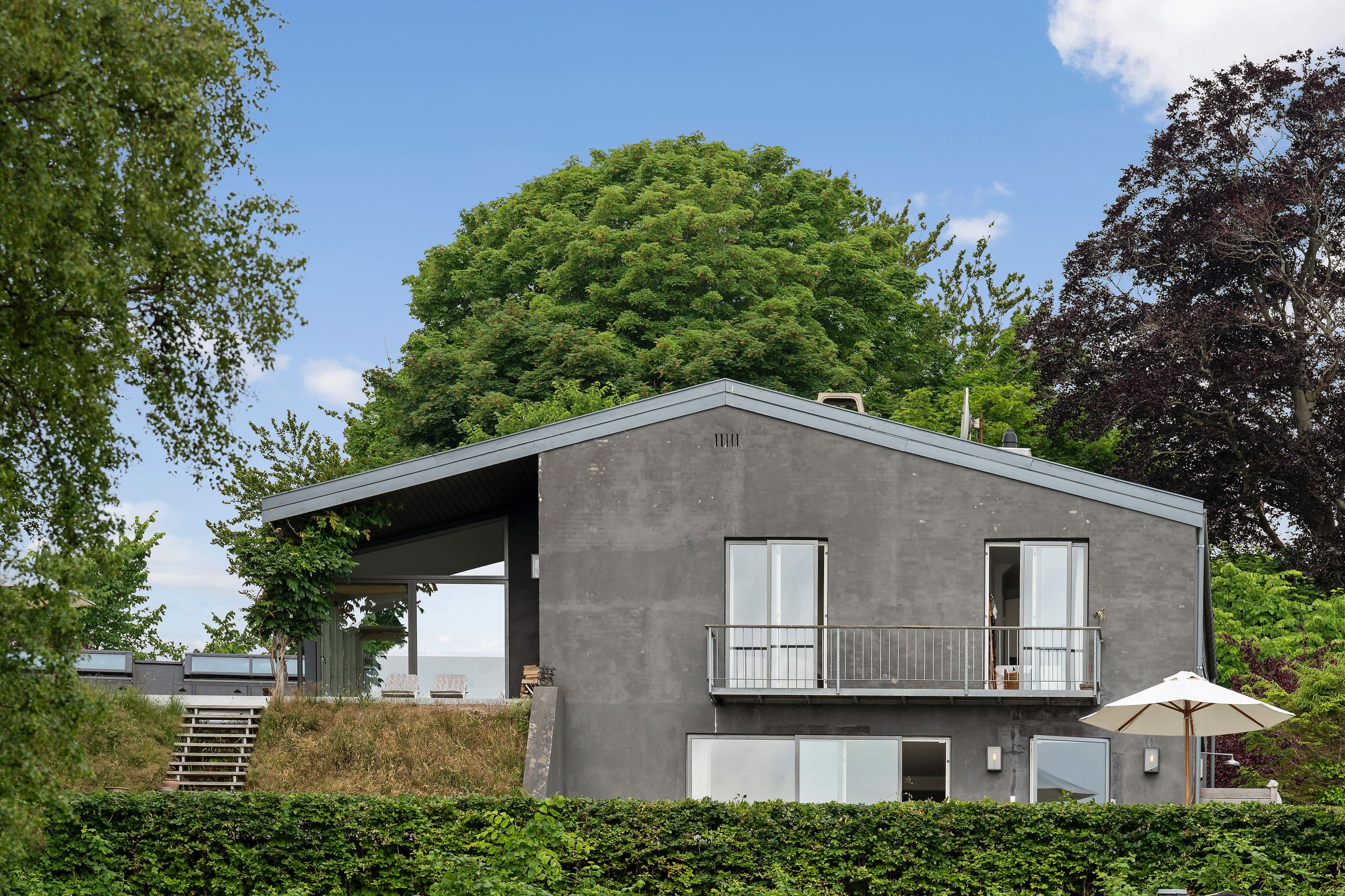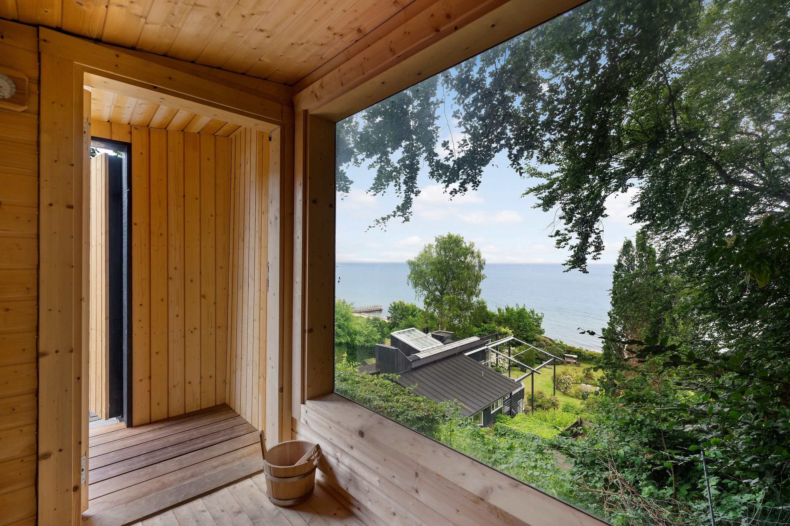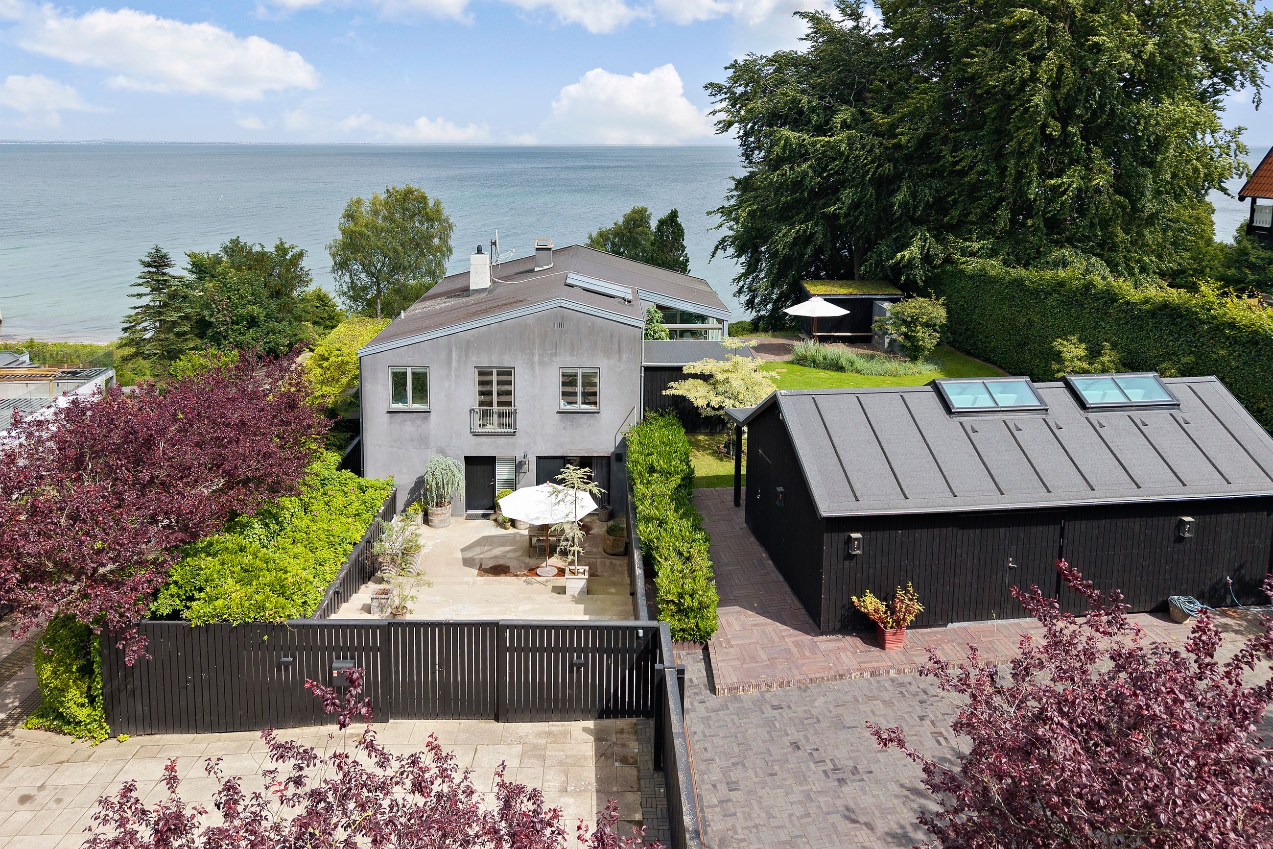 En af de få matrikler er er Skodsborg Strandvej 270. Det skimtes svagt fra Strandvejen, men hvad man slet ikke kan se, er, at alt i huset er orienteret mod vandet. Ja, man hører kun vandet, især når det viser tænder, som sammen med den svenske kyst fylder huset med en udsigt, der ikke er mange af i Nordsjælland. For huset ligger højt i terrænet, omkring 25 meter. Højt betyder dyb horisont, og det er der her på skrænten ned til den private strand. Grunden er kuperet, og huset følger terrænet. Haven ligger derfor på 1. sal, det samme gør saunaen. Alt ligger ugeneret, kun fuglene pifter til liggestolene på terrassen, når de flyver forbi.