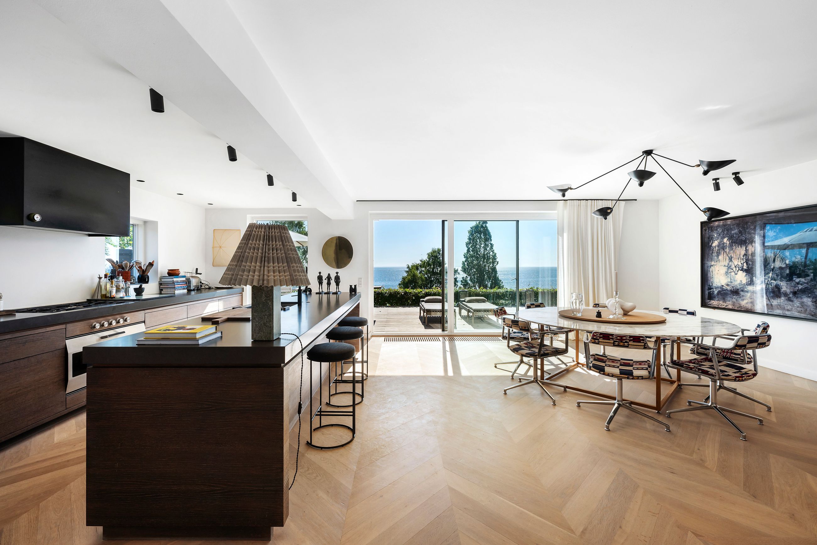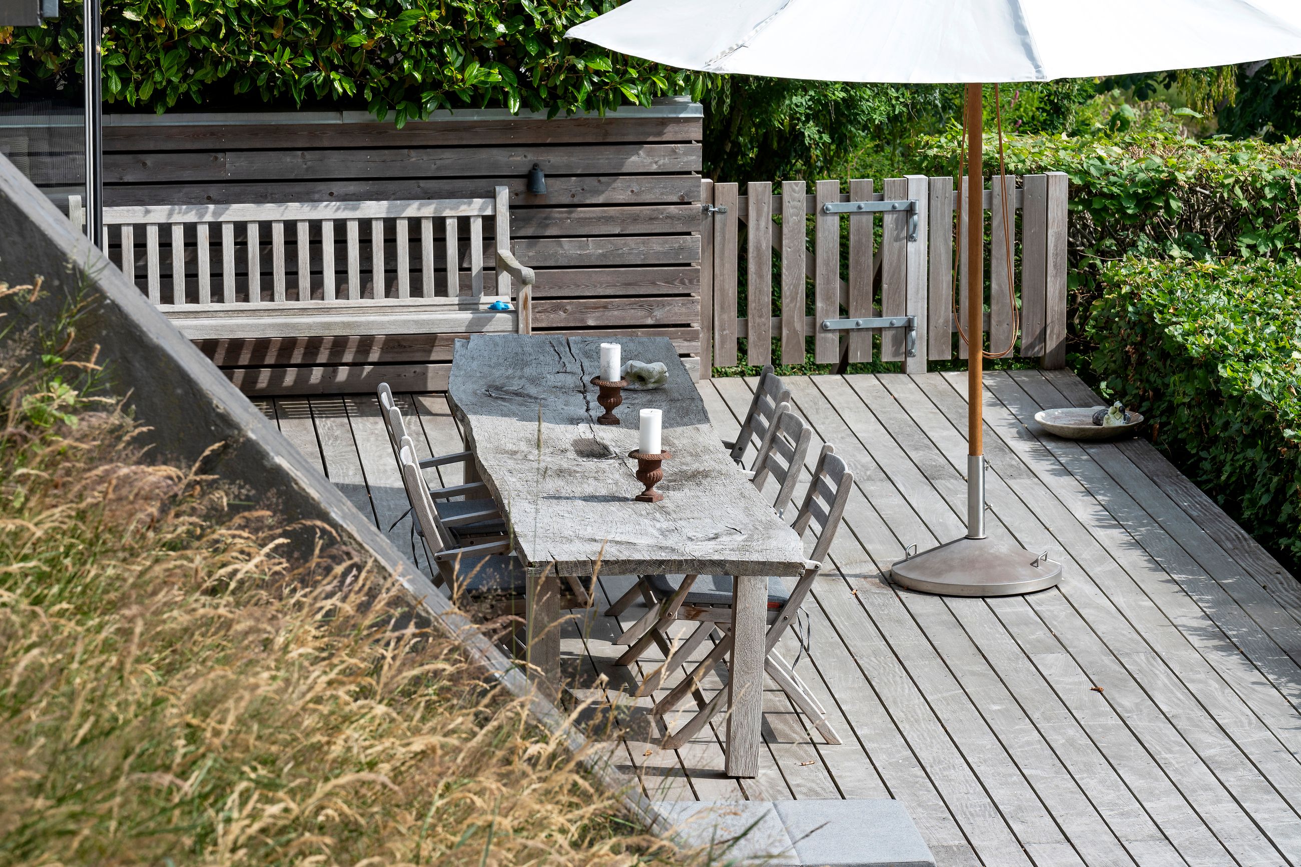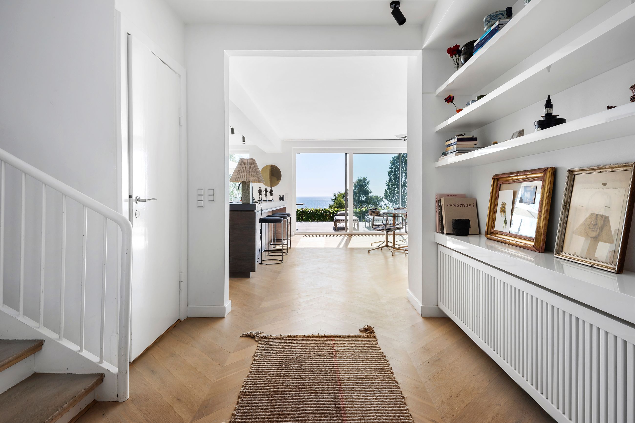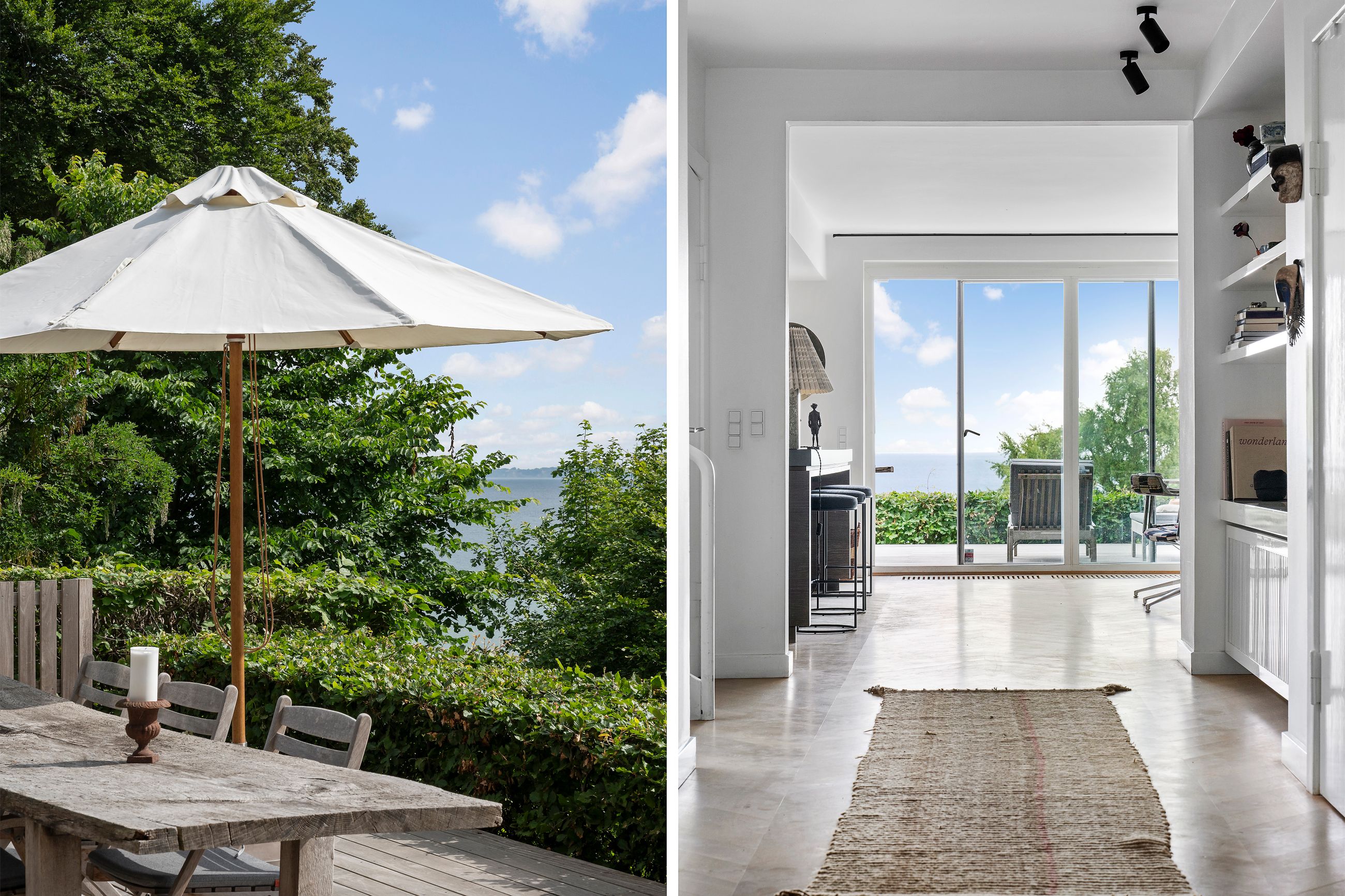 En af de få matrikler er er Skodsborg Strandvej 270. Det skimtes svagt fra Strandvejen, men hvad man slet ikke kan se, er, at alt i huset er orienteret mod vandet. Ja, man hører kun vandet, især når det viser tænder, som sammen med den svenske kyst fylder huset med en udsigt, der ikke er mange af i Nordsjælland. For huset ligger højt i terrænet, omkring 25 meter. Højt betyder dyb horisont, og det er der her på skrænten ned til den private strand. Grunden er kuperet, og huset følger terrænet. Haven ligger derfor på 1. sal, det samme gør saunaen. Alt ligger ugeneret, kun fuglene pifter til liggestolene på terrassen, når de flyver forbi.