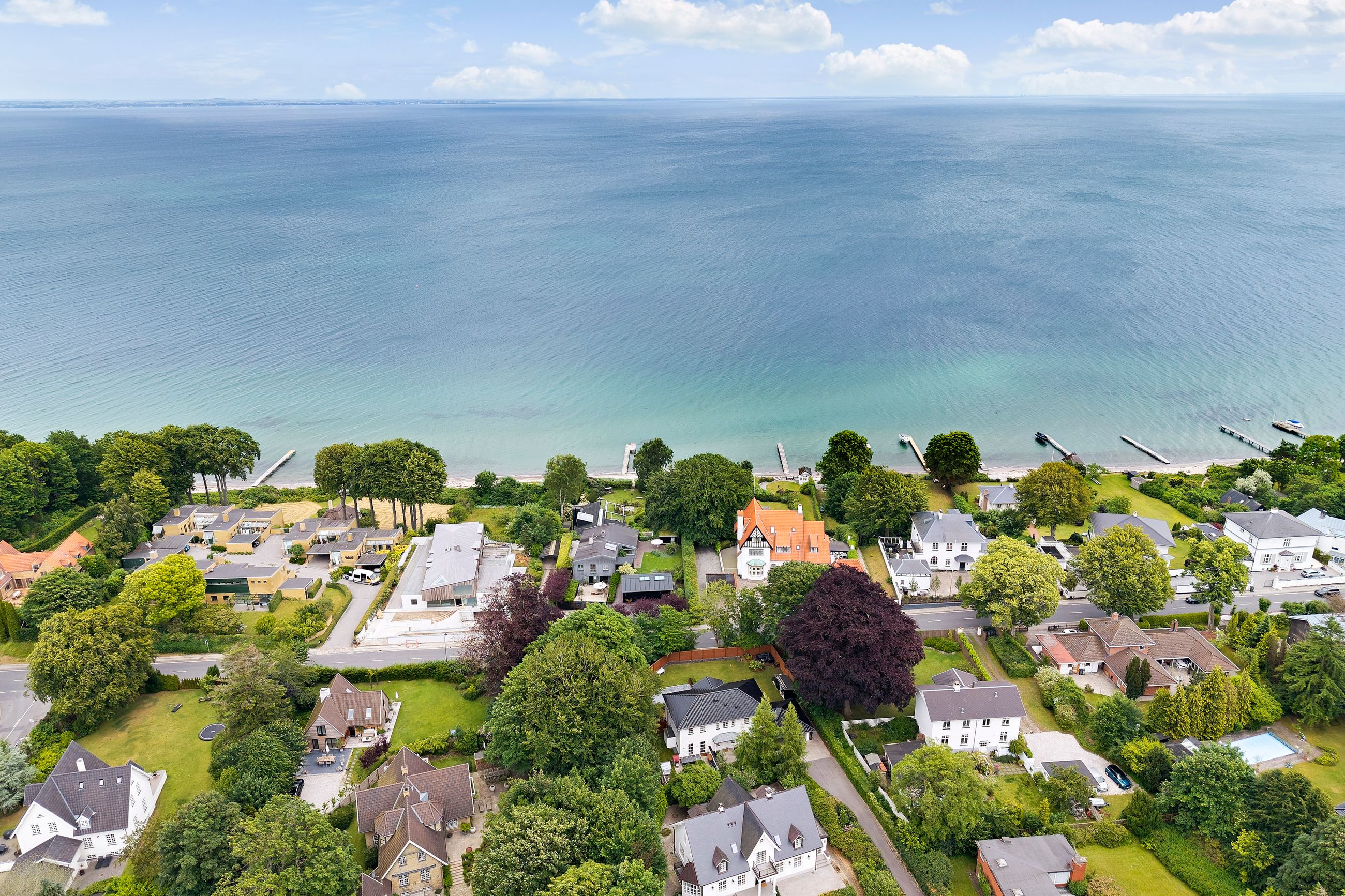 Skodsborg Strandvej er vejen mellem havet og skoven, mellem vandet i Øresund og dyrene i Jægersborg Hegn og Dyrehaven. Derfor er der ikke så mange ejendomme i Skodsborg, for byen er det smalle, smalle kystbælte mellem Vedbæk og Tårbæk. Men altså, at være klemt inde mellem vand, strand og skov, det er nu heller ikke så ringe endda, som de siger i Jylland. Ejendommene på vandsiden er privilegerede, de har deres egne strande, deres egne mageløse udsigter og nogle få matrikler, man kun finder oppe på Nordkysten mellem Kikhavn og Gilleleje.