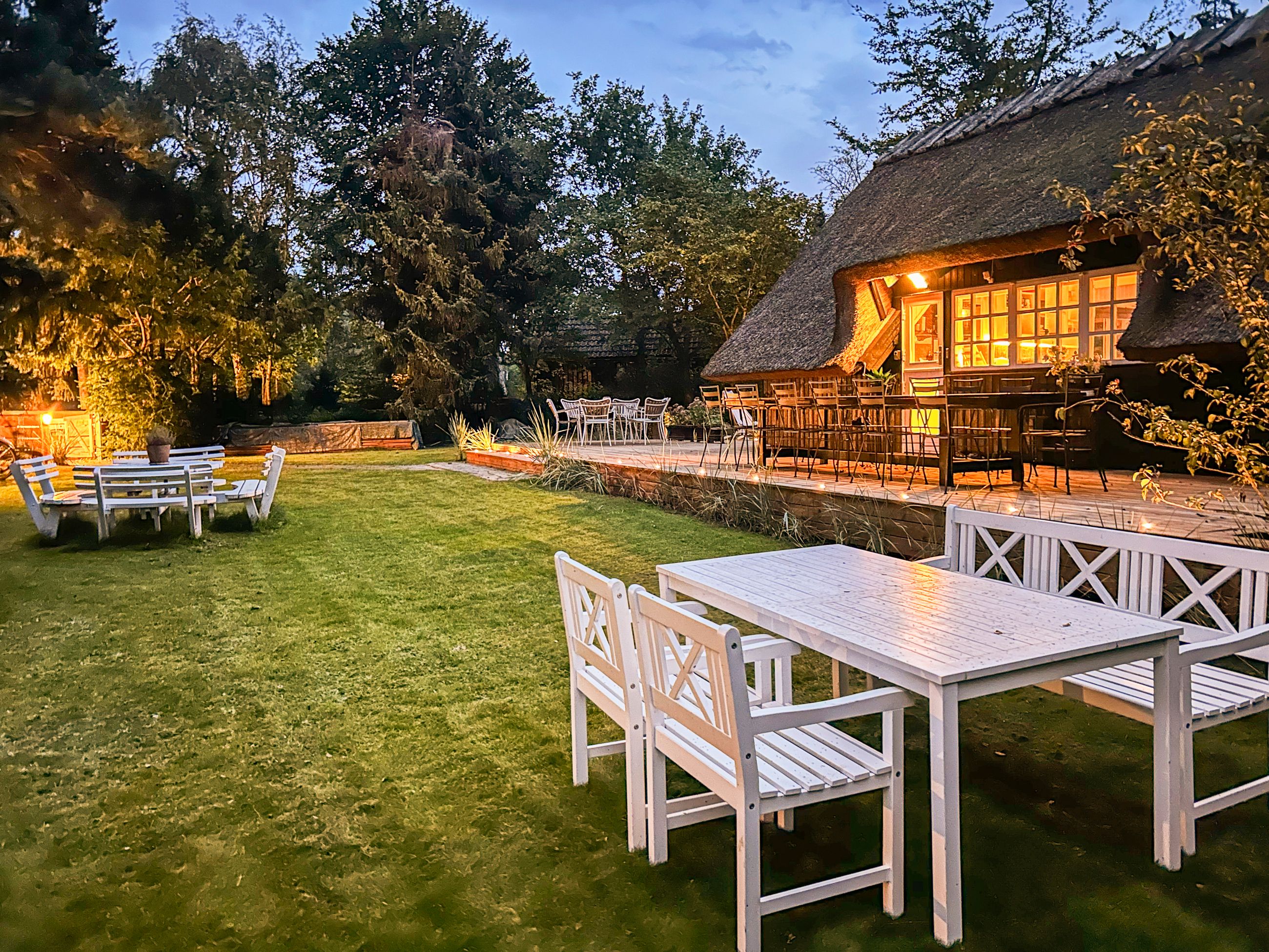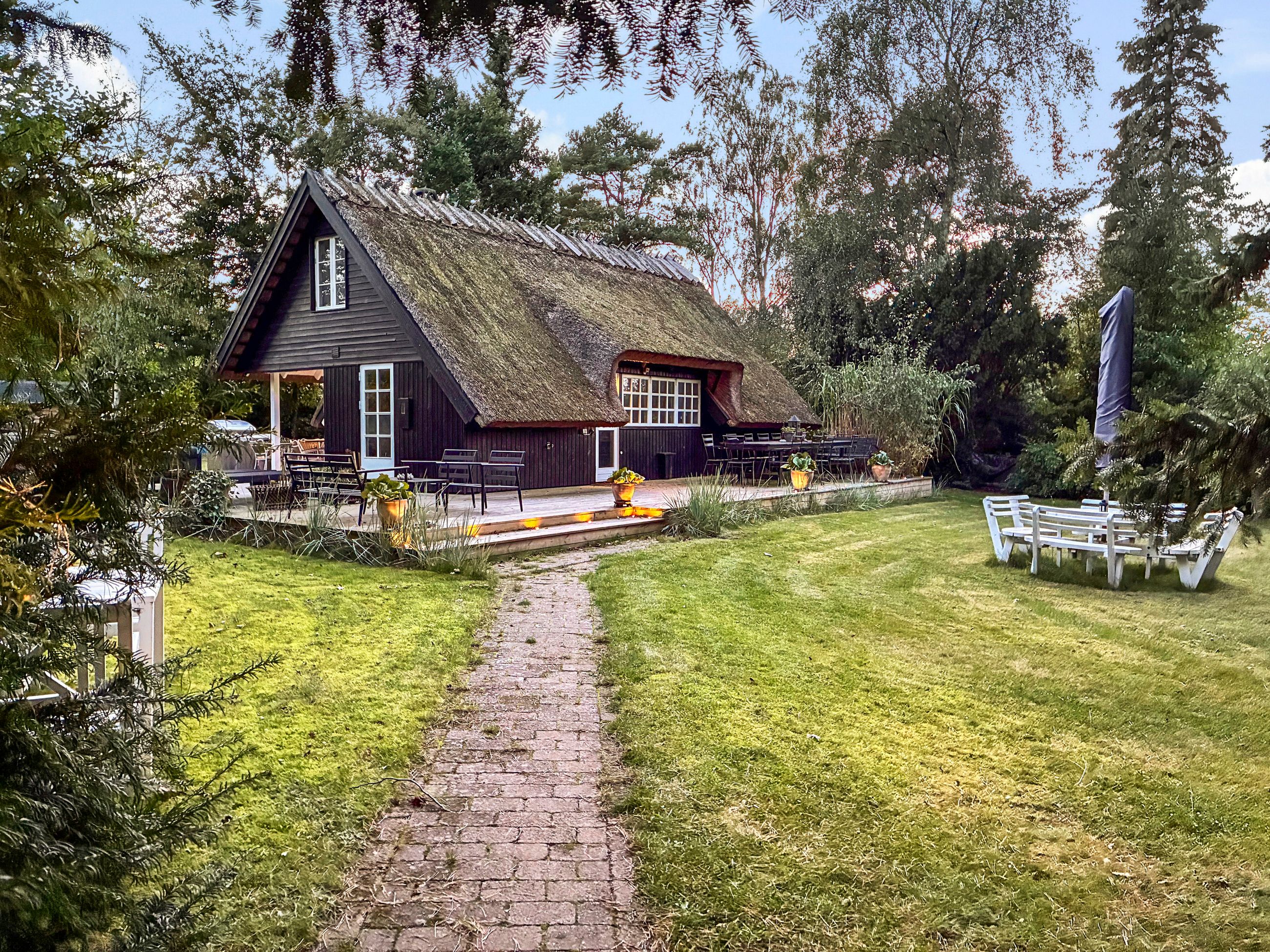 Sådan et stråtækt hus står der på Skolke-Ager 5 i Gilleleje. Her har det stået siden 1981. Med 52 godt indrettede m2 og 2 hemse er venner altid velkomne til at blive natten over. Det er nymalet med nyt køkken, ny elinstallation fra i år, ny terrasse fra 2023 og ny pejs fra 2022. Det er verdens hyggeligste sommerhus, et rigtigt Hobbithus med en markant granitskorsten, vi ikke har set før. Terrassen er mere end dobbelt så stor som huset, den er sydvendt med sol hele dagen. Her kan man ligge i læ med en krimi på maven uden at genere andre end himlens fugle, der flyver forbi. Grunden er på 1.210 m2 med en have beplantet med stedsegrønne planter. Alt er velholdt, alt er lige til at flytte ind i. Kom hele året, huset er bygget til det.
