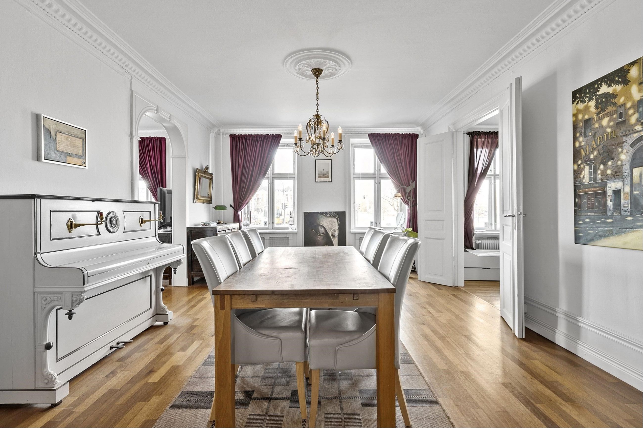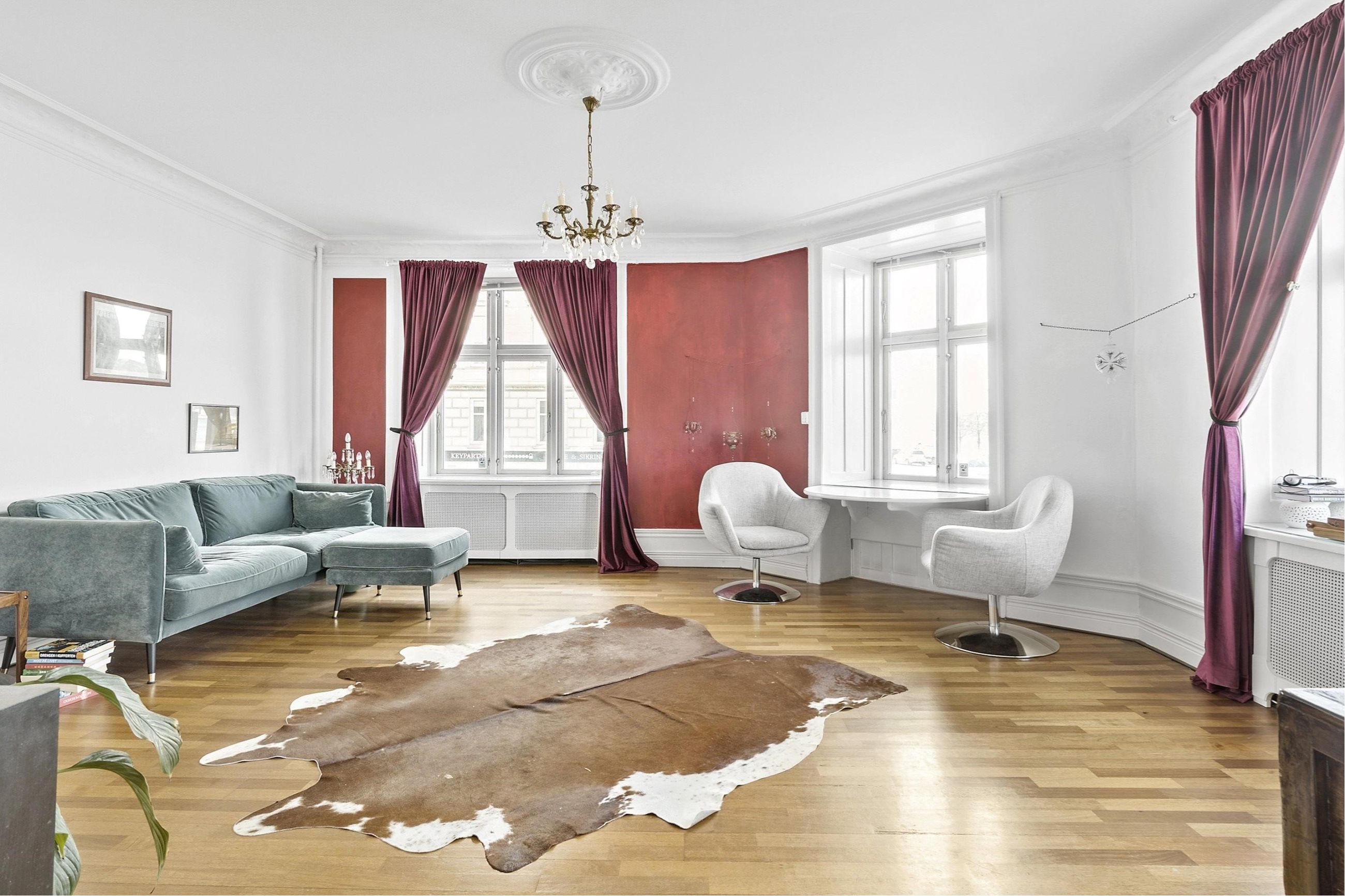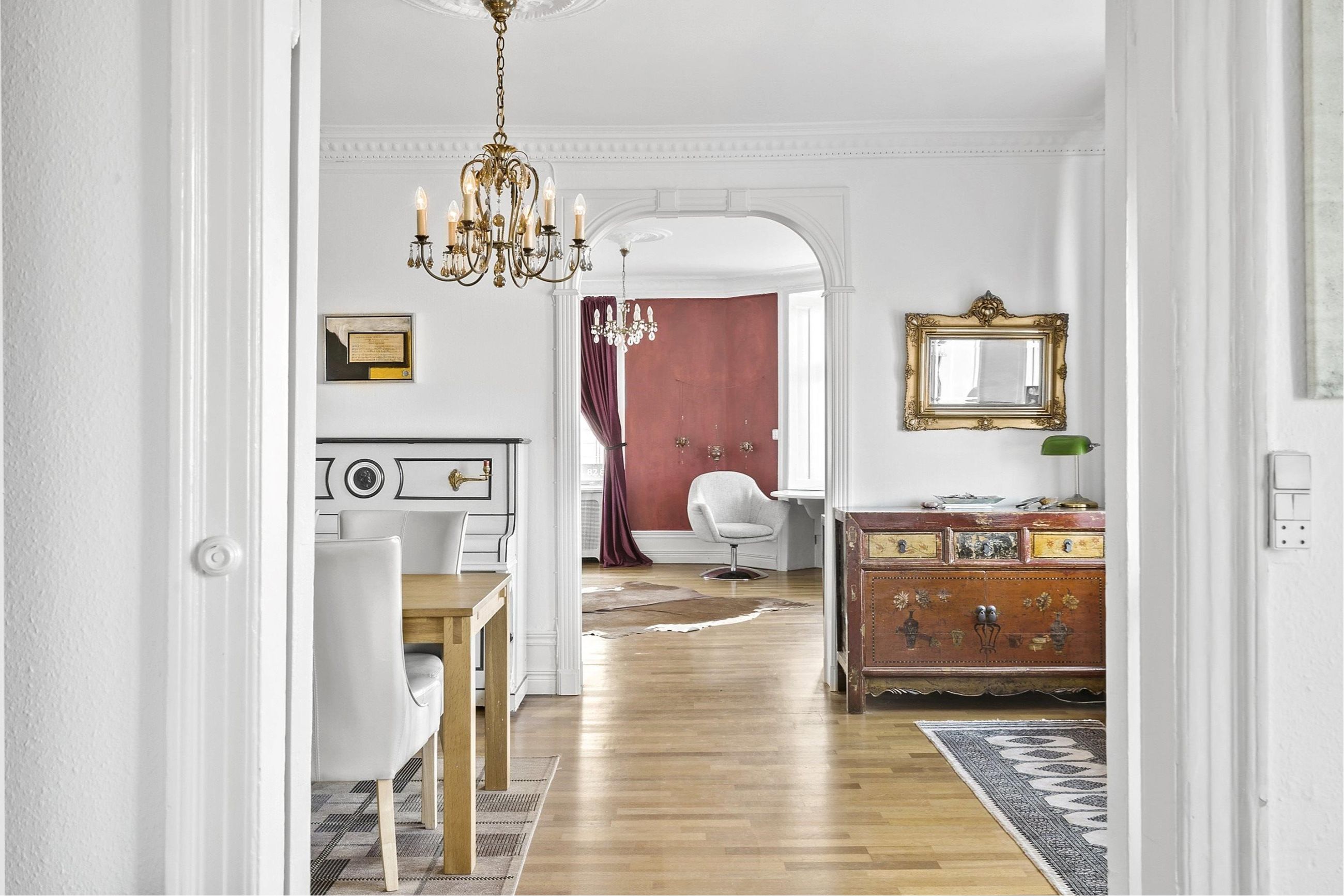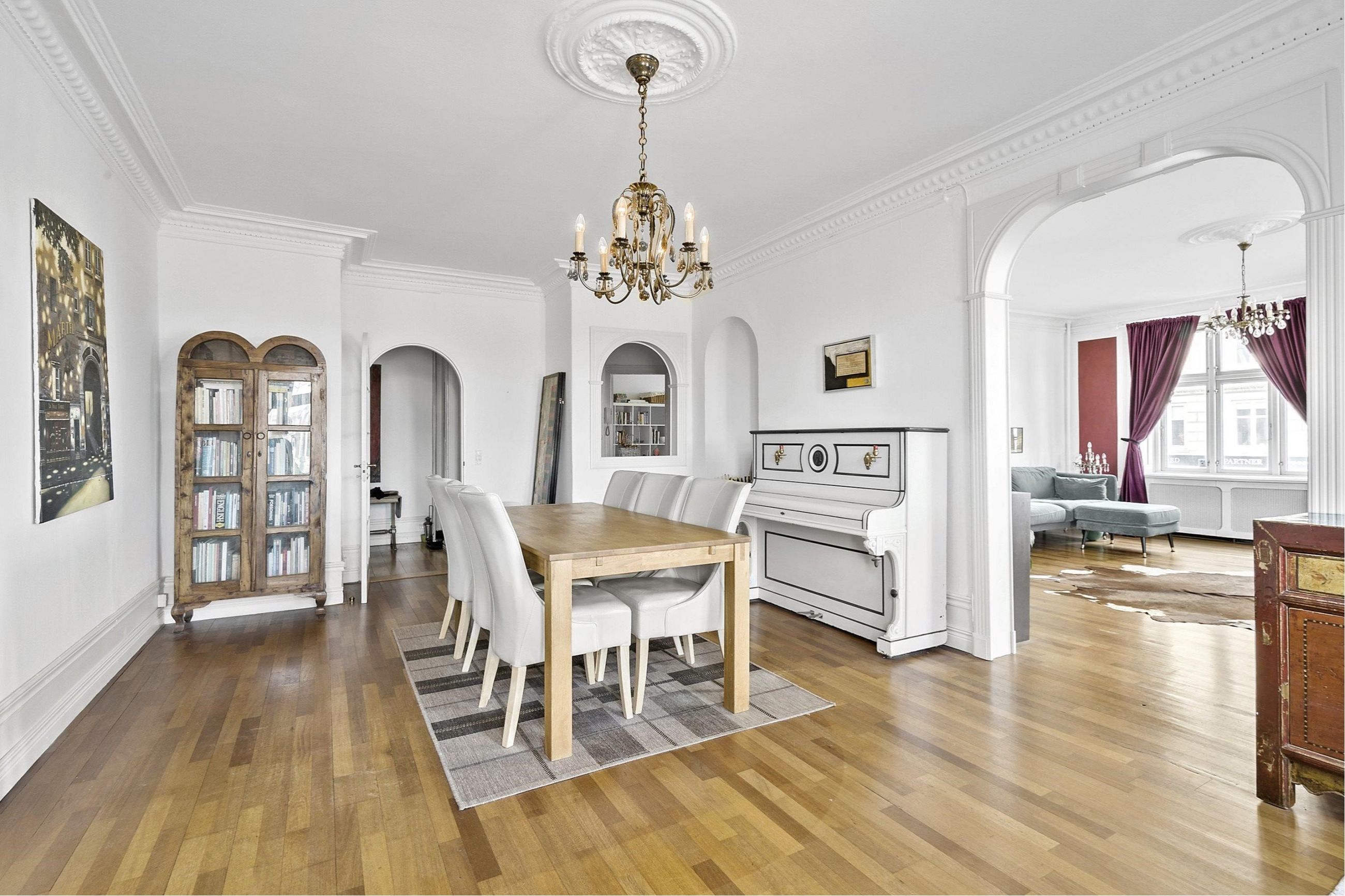 Mezzaninlejligheden i Sølvgade 104 er en af de store herskabslejligheder i København. Den er en hjørnelejlighed, og hjørneligheder har som bekendt den største udsigt og et lys, der drysser ind fra flere verdenshjørner. Her er højt til loftet i mere end én forstand. Ildsted, stuer en suite, masser af værelser, høje paneler, stuk, rosetter og tunge fyldningsdøre. En lækker lejlighed for familien med børn, men også for det modne par, som er storforbruger af kulturen i København.