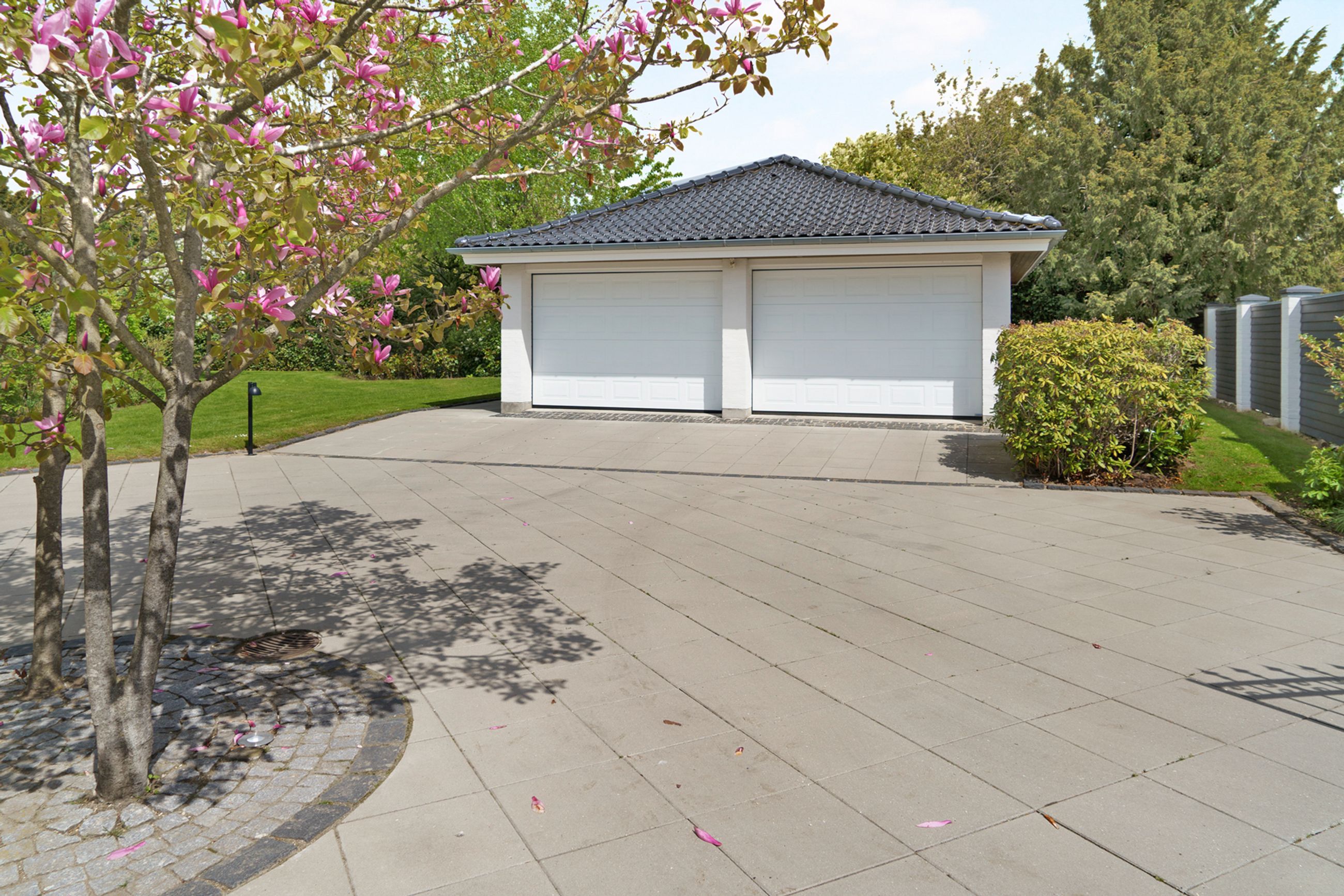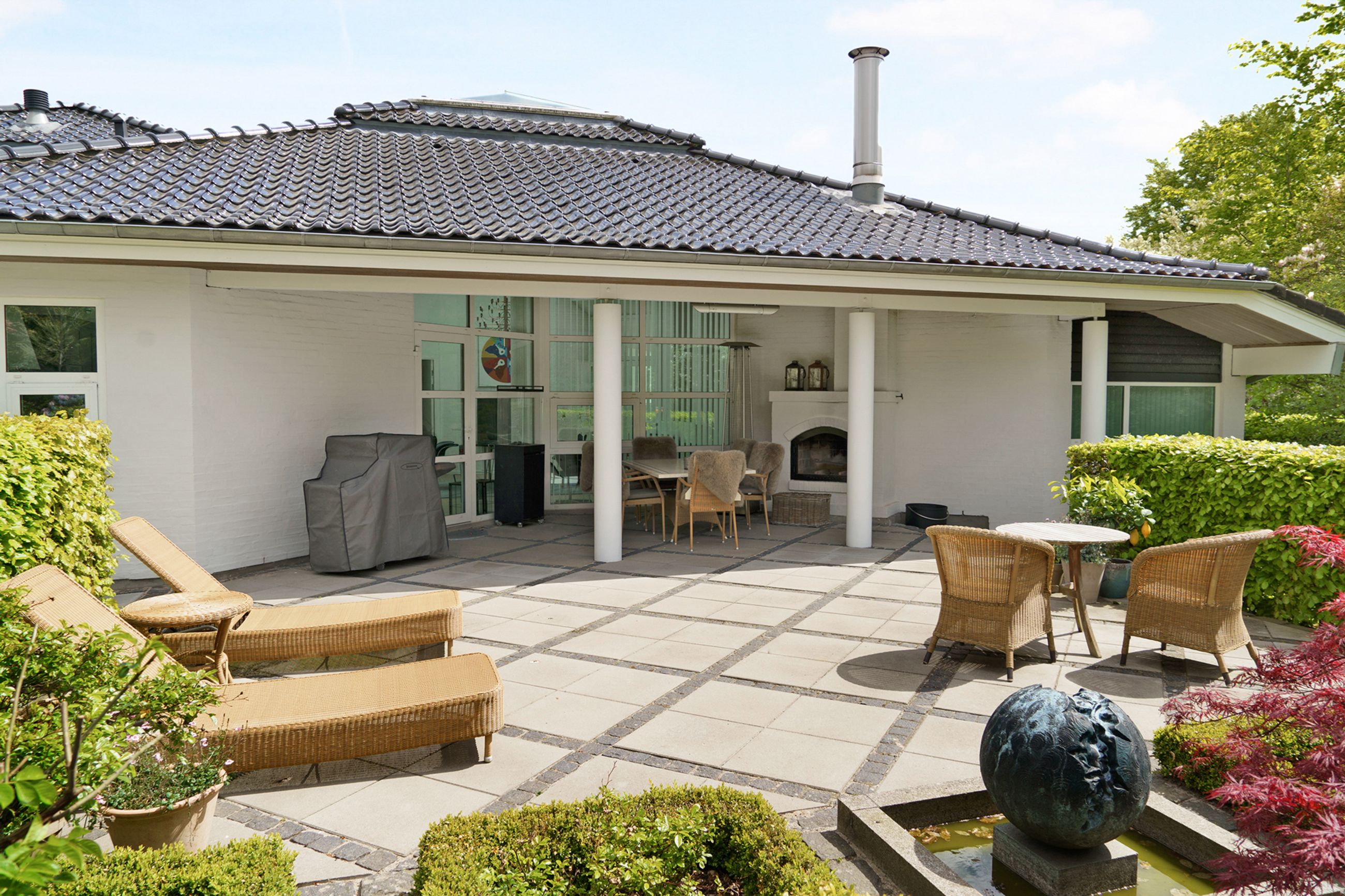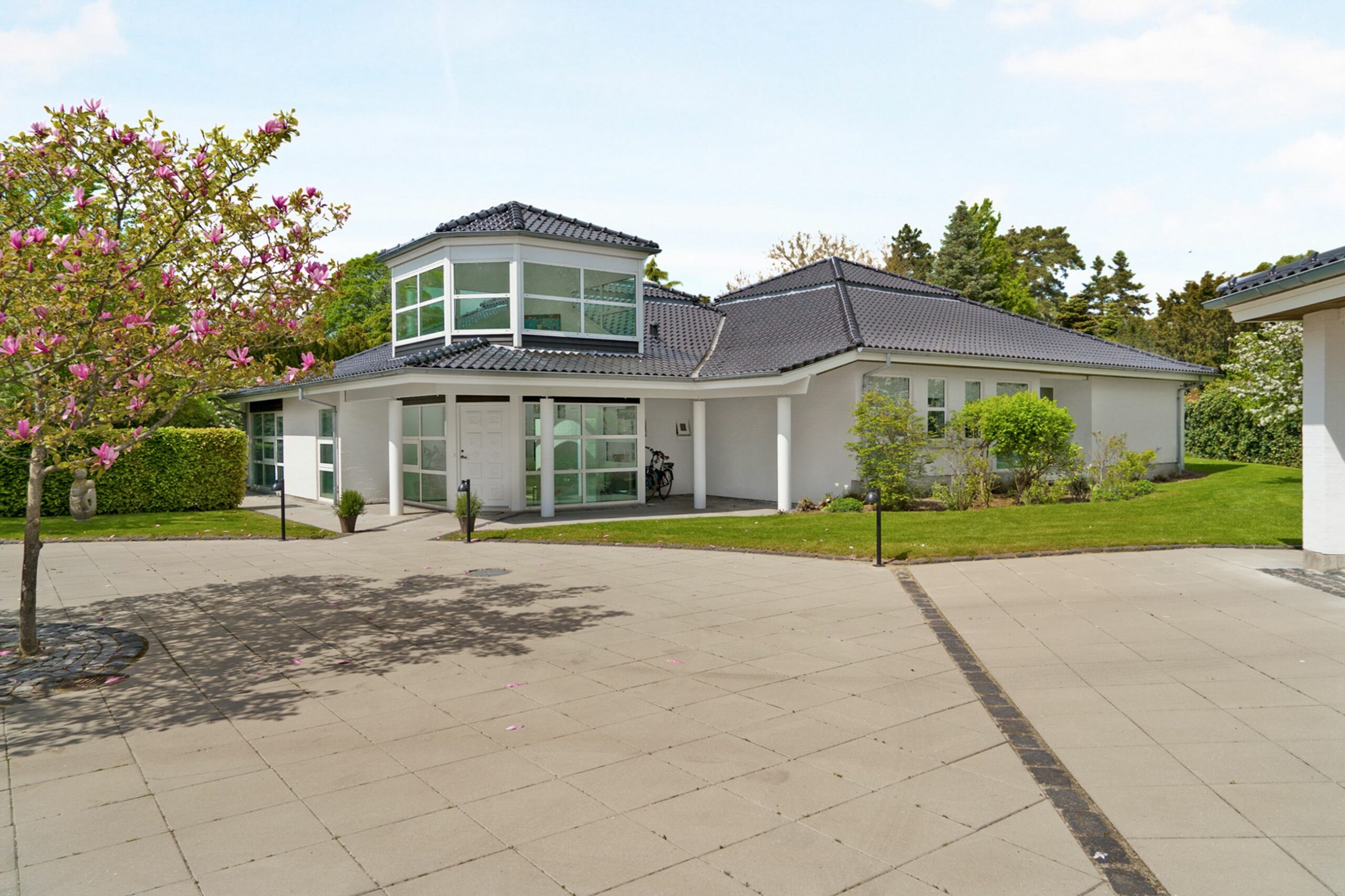 Træernes gamle brede kroner og de store, tætte evigt grønne buske beskytter huset mod både lyd og indkig. Helt skjult, og alligevel helt tæt på Strandvejen i Vedbæk, ligger parkhaven på 2000 m2, der elegant er anlagt og indrettet med skulpturer af danske billedhuggere. Beplantningen er så støjisolerende tæt, at man slet ikke kan høre hverdagens myldretidstrafik, ja, ikke engang et udrykningskøretøj. Vi er også i den gamle stille del af Vedbæk, nord for havnen, hvor husene gemmer sig bag det grønne, og er placeret tilbagetrukket med ryggen til vejen, og fronten forventningsfuldt vendt mod vandet.