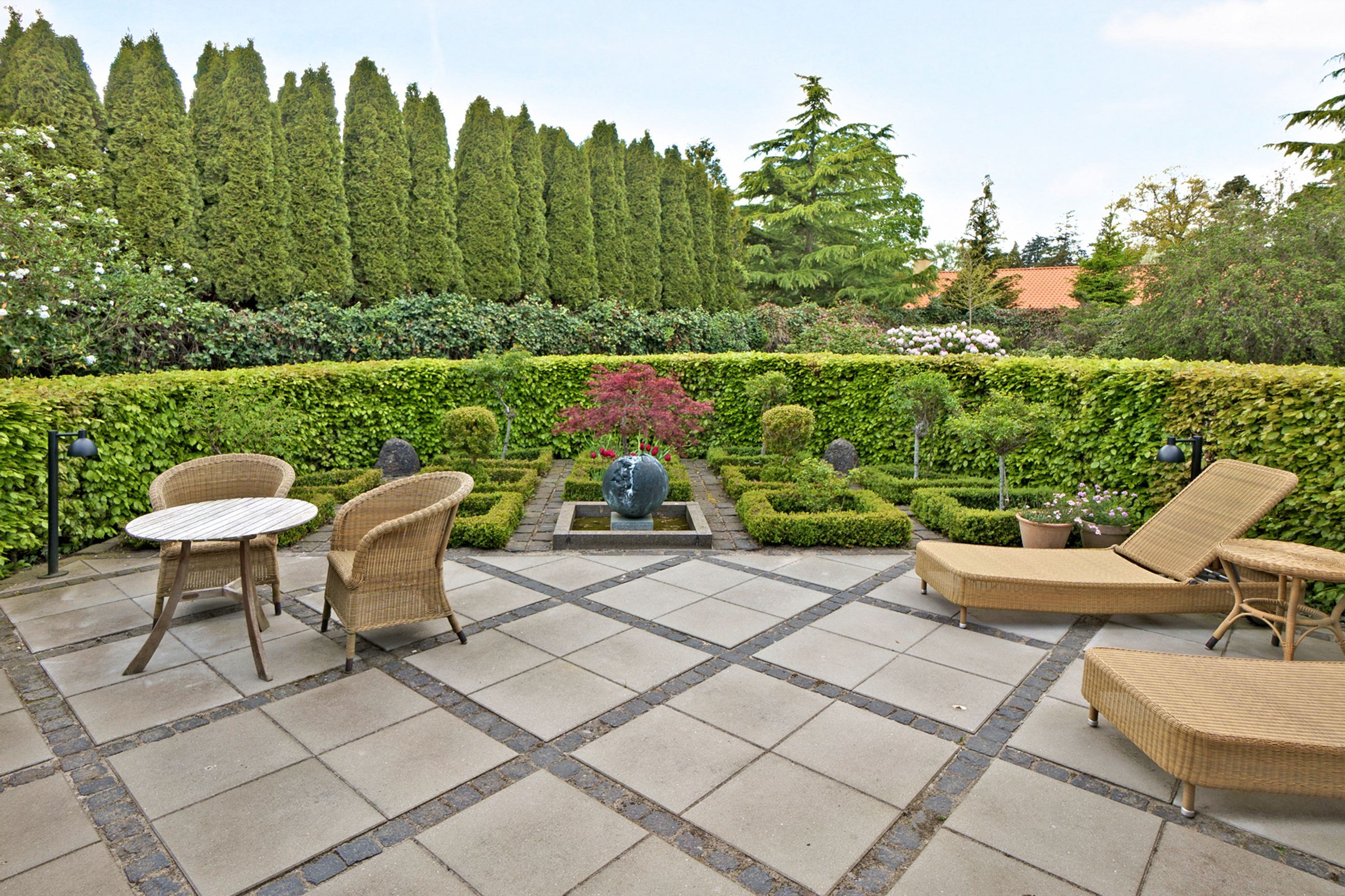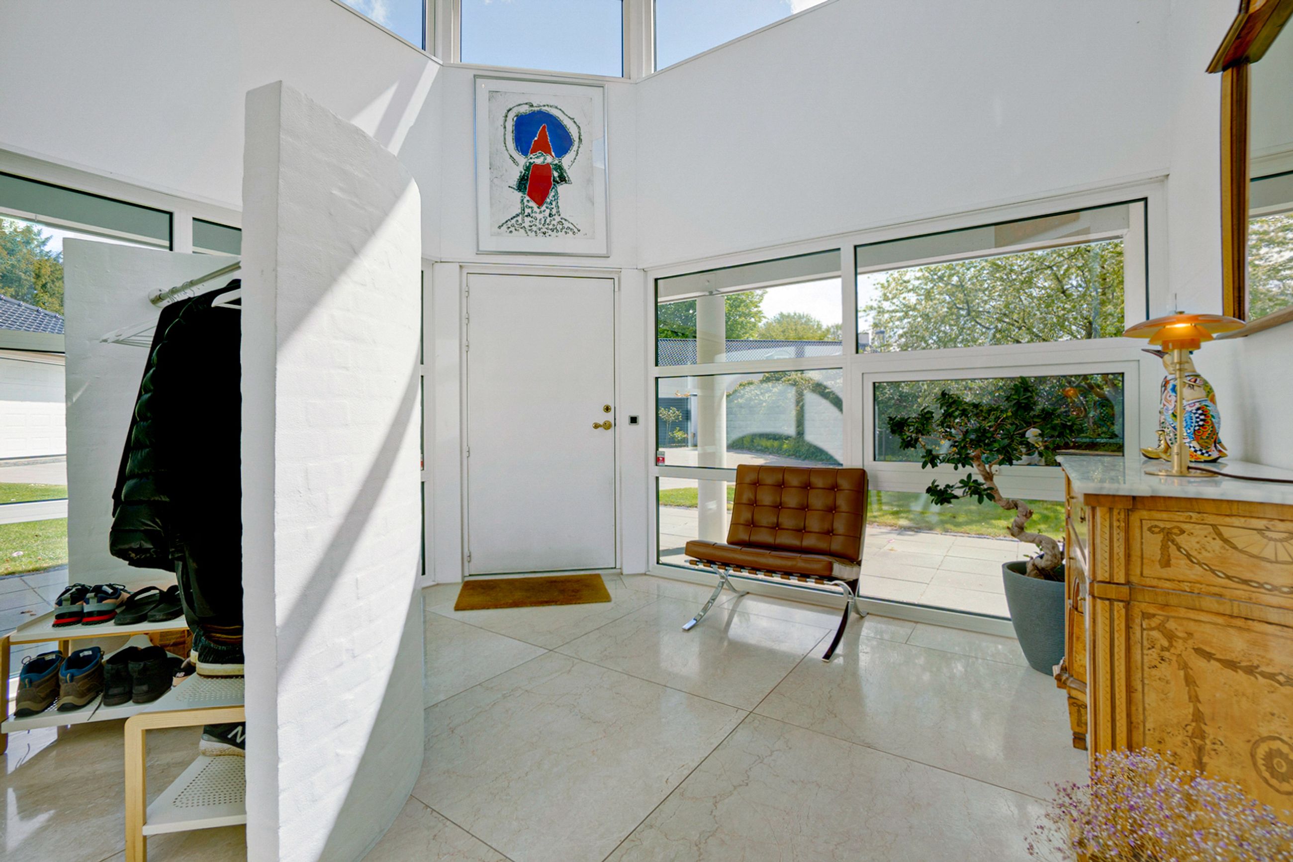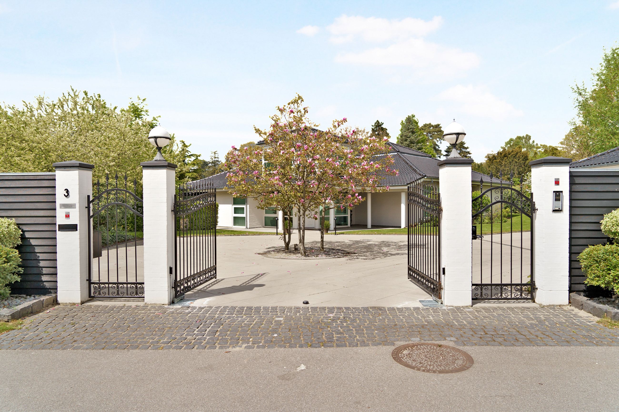 Træernes gamle brede kroner og de store, tætte evigt grønne buske beskytter huset mod både lyd og indkig. Helt skjult, og alligevel helt tæt på Strandvejen i Vedbæk, ligger parkhaven på 2000 m2, der elegant er anlagt og indrettet med skulpturer af danske billedhuggere. Beplantningen er så støjisolerende tæt, at man slet ikke kan høre hverdagens myldretidstrafik, ja, ikke engang et udrykningskøretøj. Vi er også i den gamle stille del af Vedbæk, nord for havnen, hvor husene gemmer sig bag det grønne, og er placeret tilbagetrukket med ryggen til vejen, og fronten forventningsfuldt vendt mod vandet.