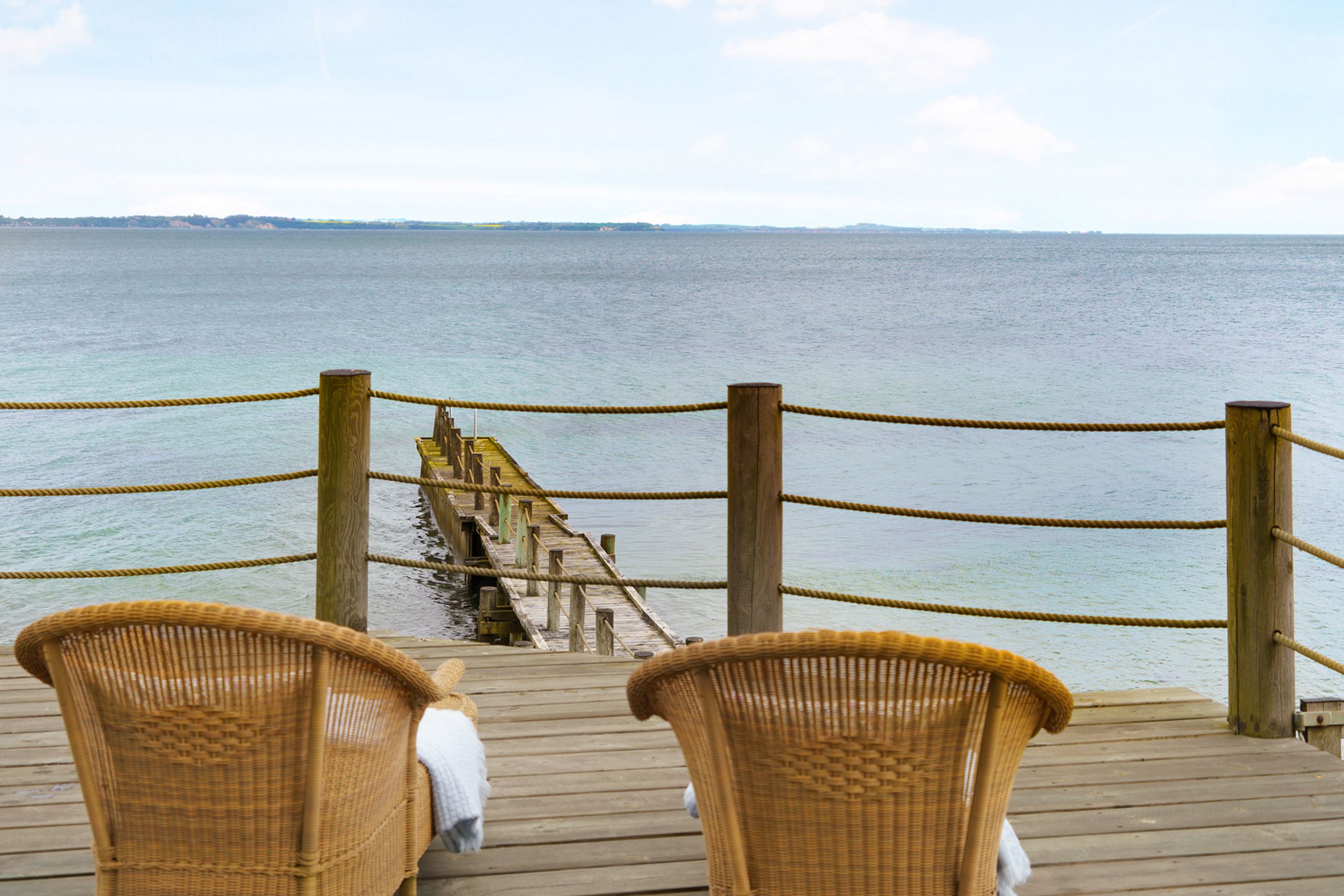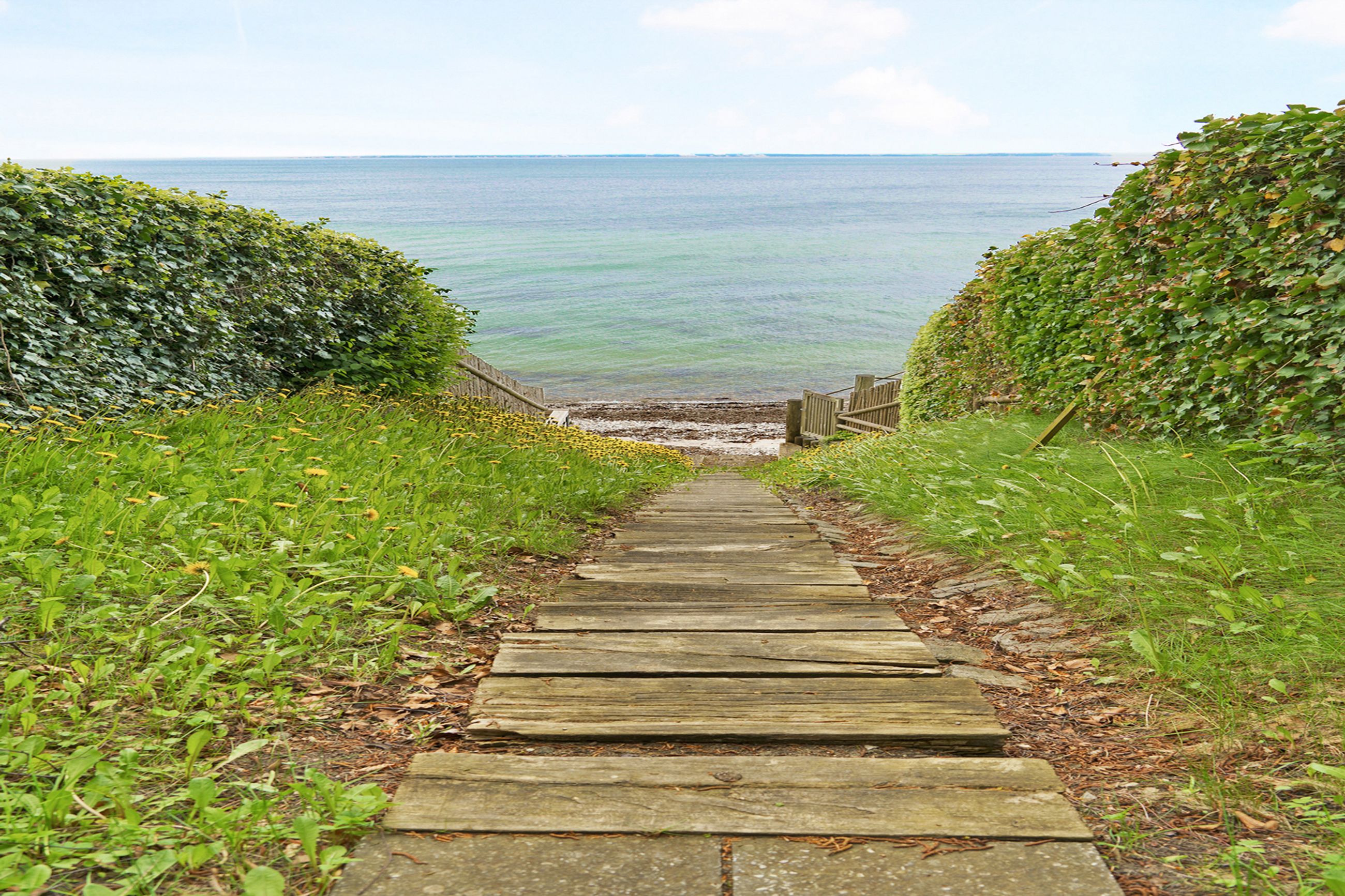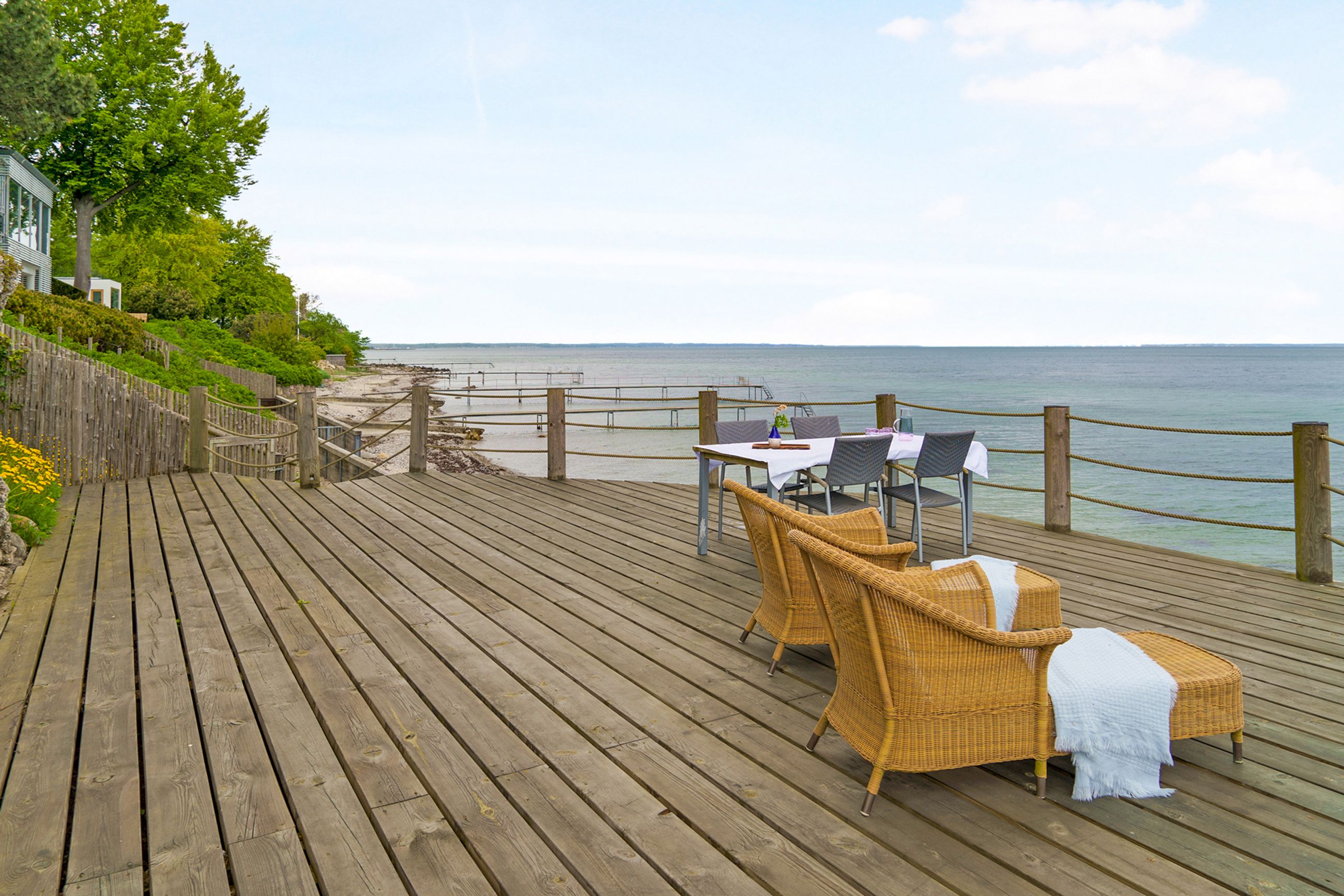 Med tre gode naboer deles man venligt og fredeligt om en fælles privat badebro med privat strandret. Broen nås gennem en hemmelig overdækket sti fra haven mod den aflåste trædør. Derfra er der blot 100 meter ad en lukket privat vej ned til Øresunds blide bølger, og badebroen på stranden. Oplagt til en lille picnic eller et glas bobler ved vandkanten.