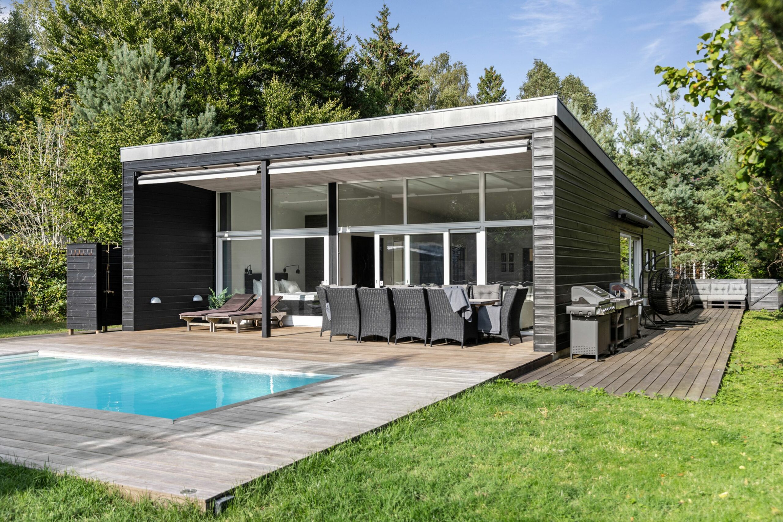 Nuvel, sommerhuset på Soldalen 23 i Nakke er bygget i 2012 som et fristed, en sydlandsk stemning på en sydhavsø om sommeren, og som et fransk chalet om vinteren. Der er godt nok ikke mange bjerge i kvarteret, men det er bygget, så man også kan være her om vinteren, med gulvvarme i hele huset. Med 4 soveværelser er det et sommerhus med masser af plads til børnefamilien og venner på besøg. Poolen er opvarmet, så det er ikke gys og gåsehud, man møder i vandet. Vinduerne mod poolen i vest går fra gulv til loft, så der er masser af lys hele året. Det er bygget af lækre materialer, lærketræ på gulvet, ikke helt almindeligt, og hårdt træ på terrassen, som stort set omfavner hele huset. Vi er i skoven i den gamle sandflugtsplantage, så selvfølgelig er her rådyr. Vejen er lukket, ikke meget trafik her. Grunden er på 916 m2.