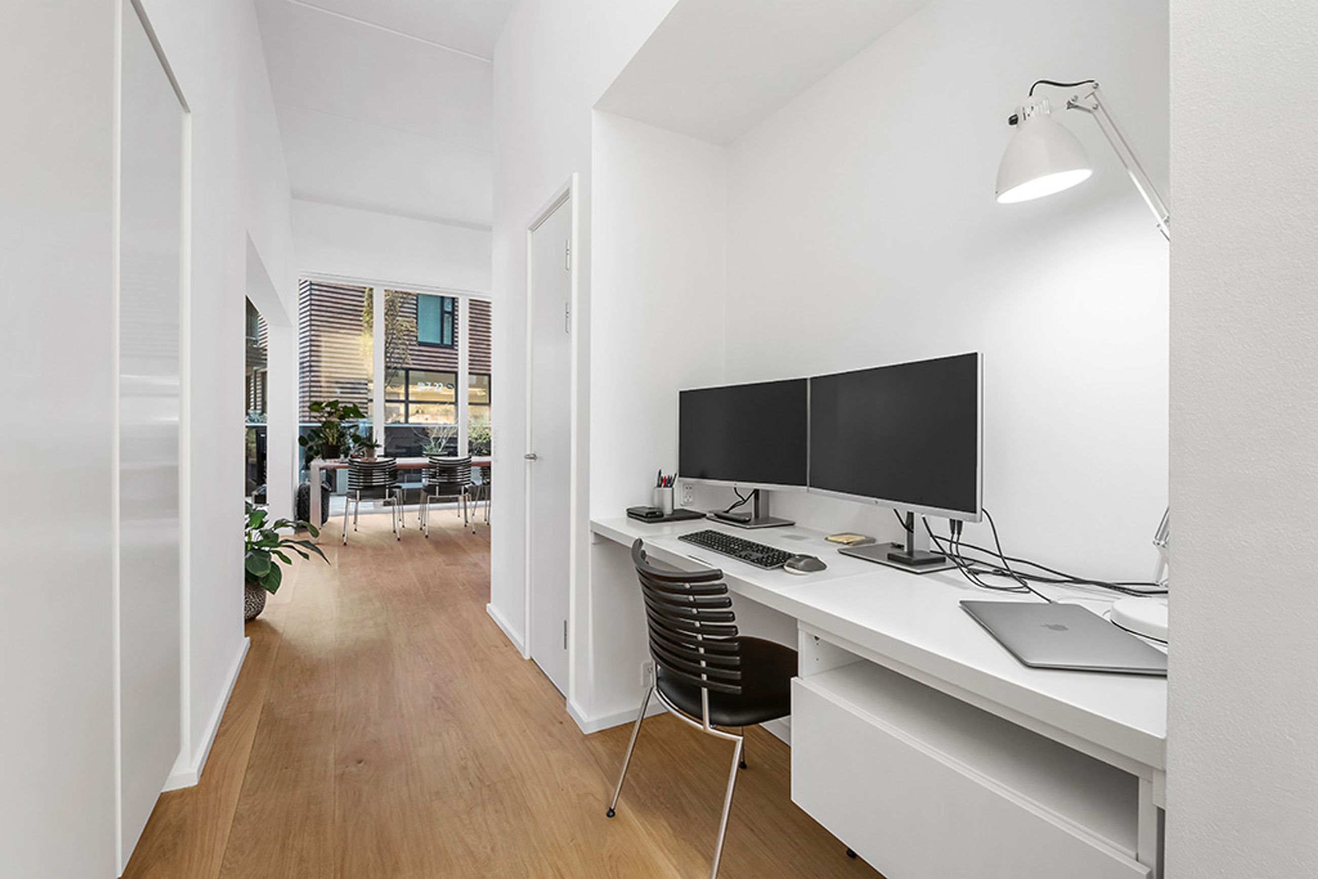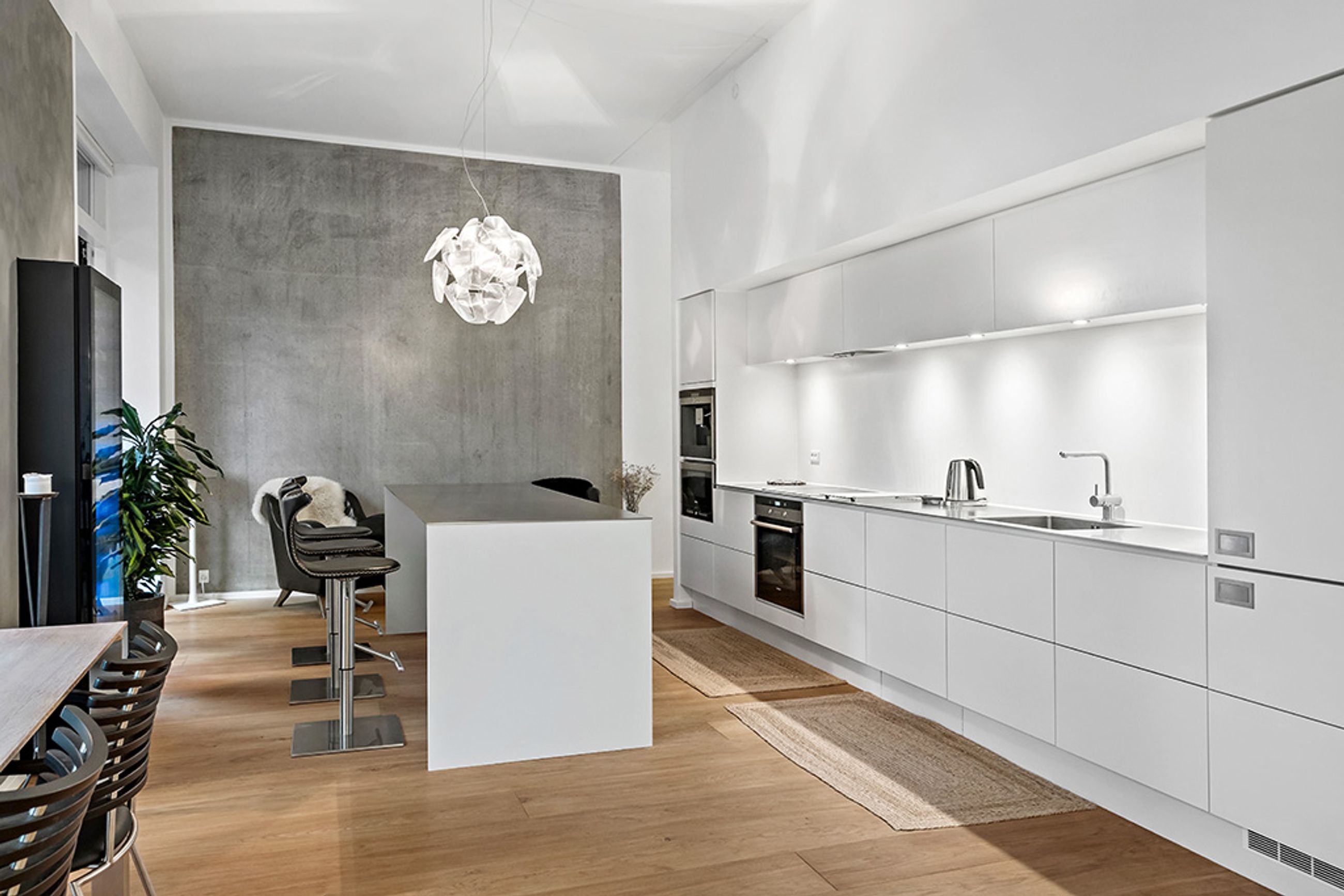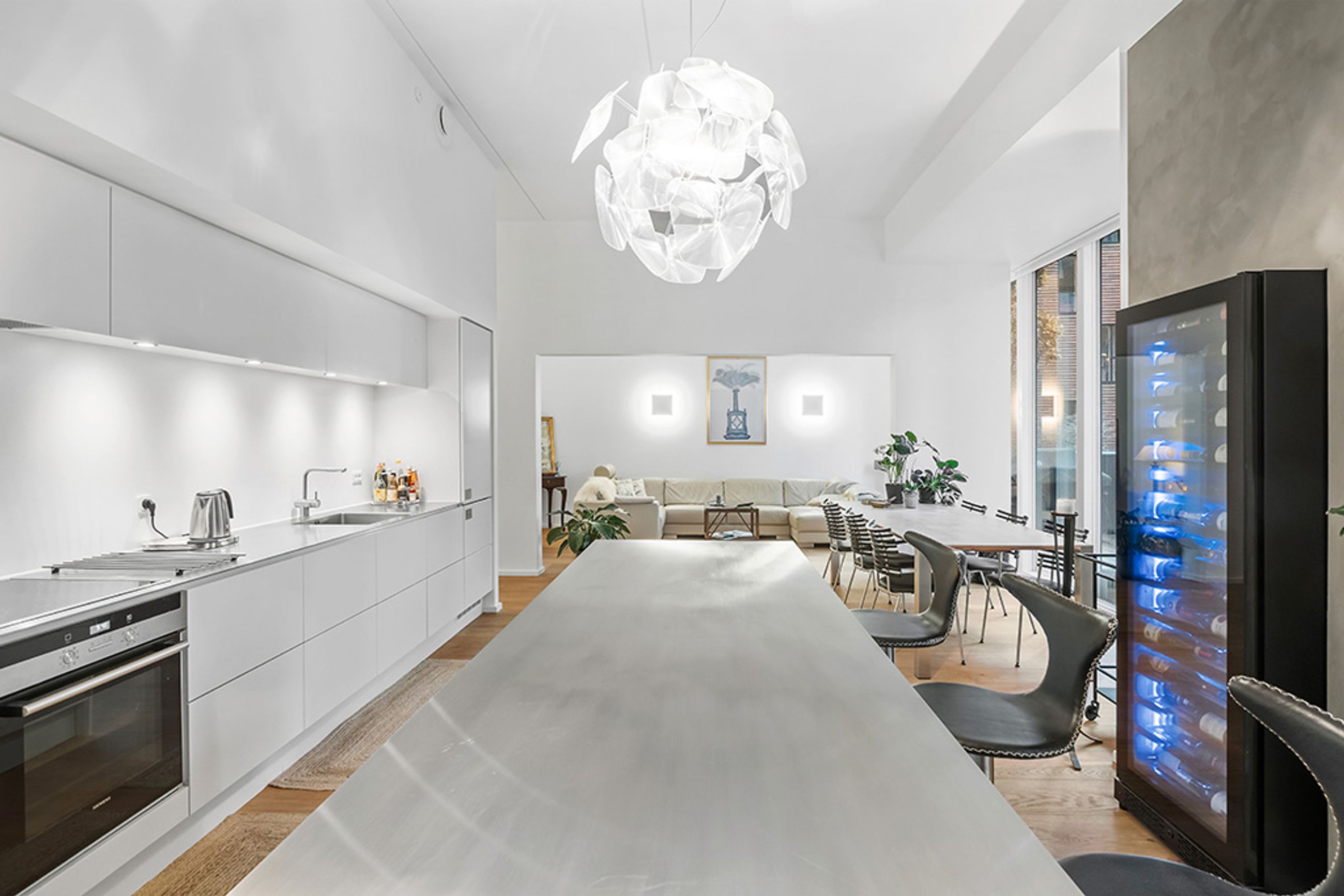 Lejligheden er på 138 m² og fremstår lys og rummelig. Den indeholder to soveværelser, stor opholdsstue med åbent designerkøkken. Fra stuen er der udgang til en stor vestvendt terrasse, med kig til Københavns Havn. Her kan aftensolen nydes uforstyrret. På badeværelset er der både vaskemaskine og tørretumbler.