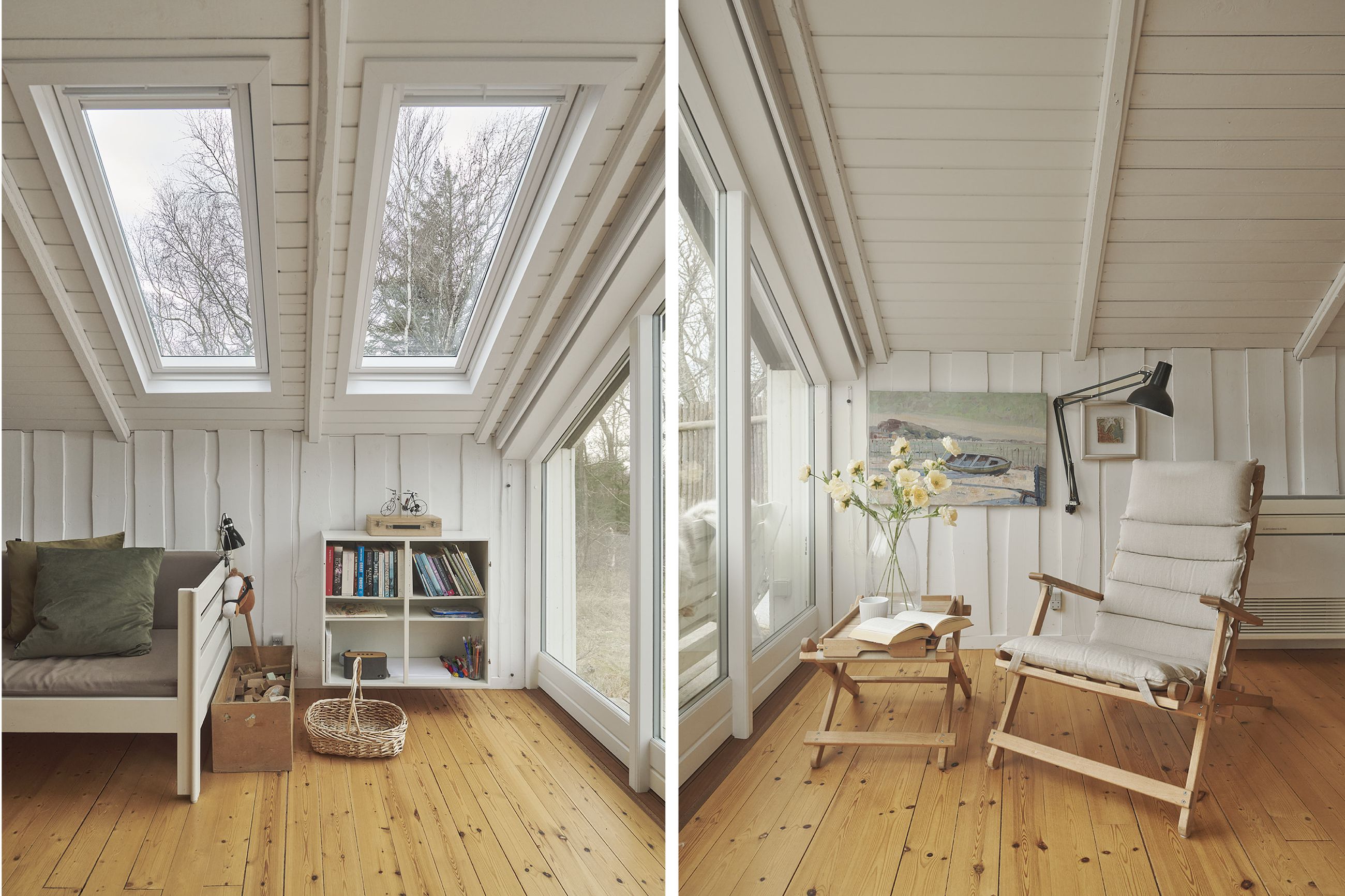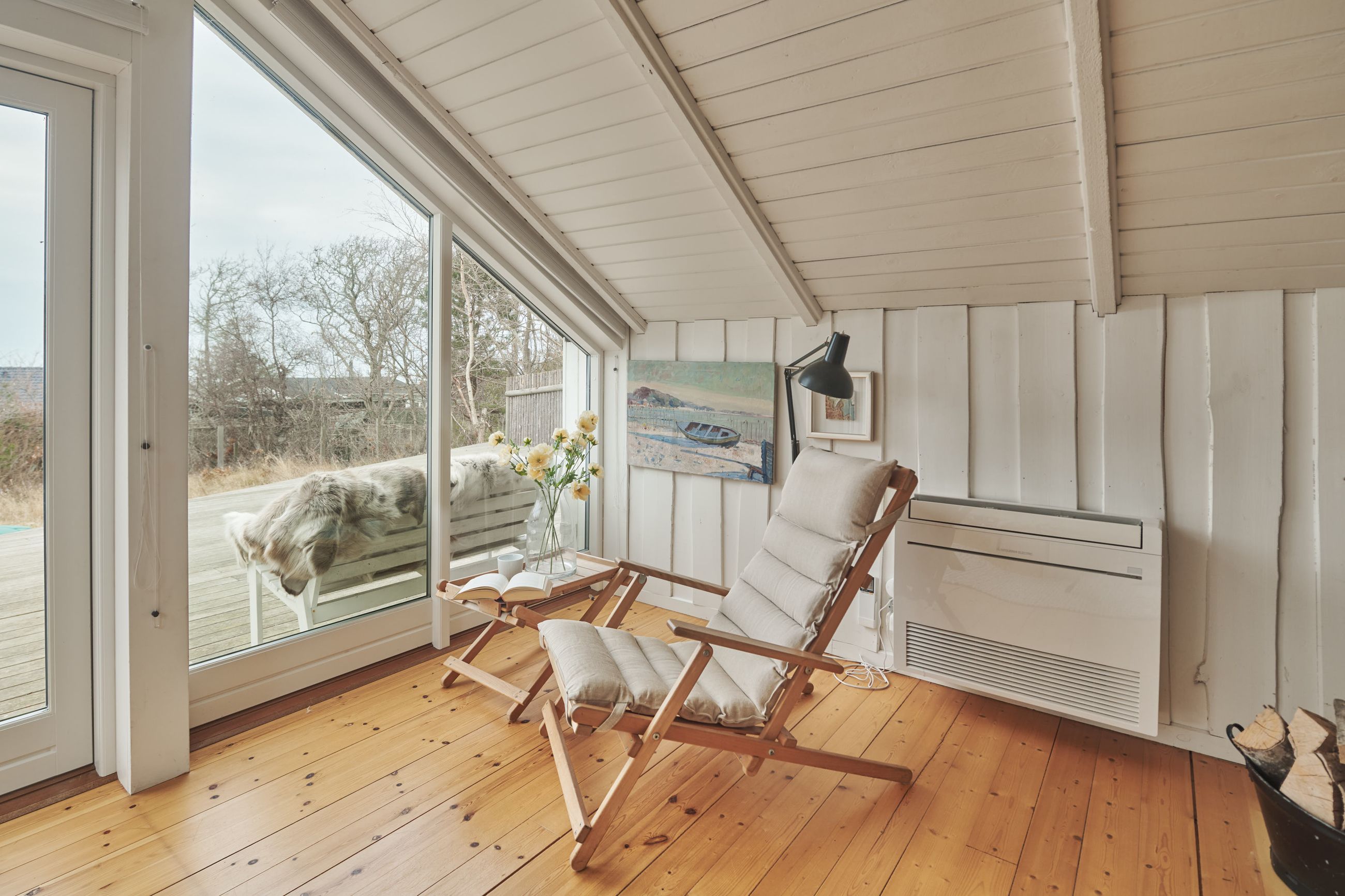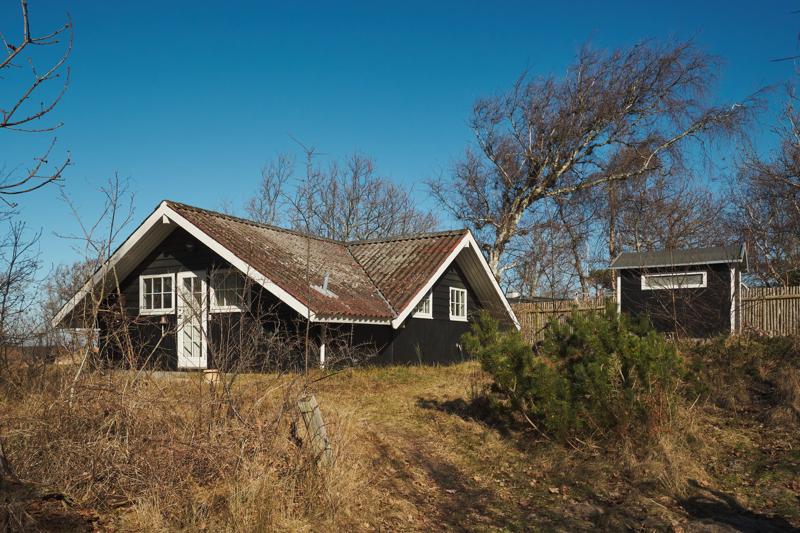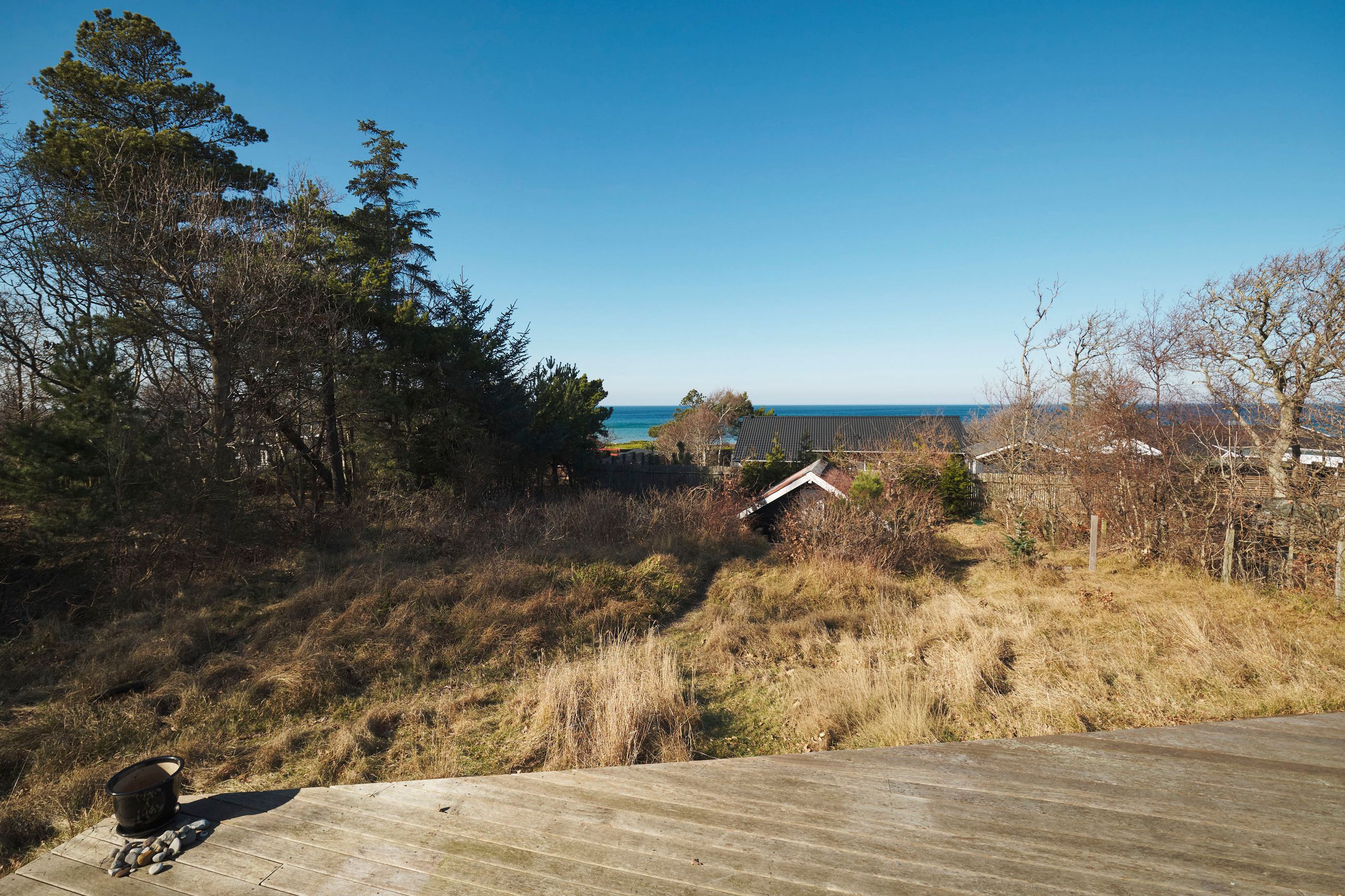 Huset er et Kalmarhus bygget i 1973 som et strandhus, et havudsigtshus, et diskret hus. Det ligger så naturligt på grunden, som var det vokset op af lyngen. Et Kalmarhus er et svensk træhus og opleves i dag som klassiske, modernistiske træhuse. Der er masser af charme masseret ind i de 60 m2. Og de er eftertragtede, Kalmarhusene, for arkitekturen passer godt ind i tidens appetit for lys, træ og enkle linjer. Og så ligger Kalmarhuse lavt og vandret på deres matrikel. Her er store vinduer mod Kattegat, tak for det, sikken udsigt, sikken glæde det må være at opleve havets evige bevægelse og himlens spejlinger i vandet. Huset står ugeneret og helt rigtigt på den 788 m2 store grund.