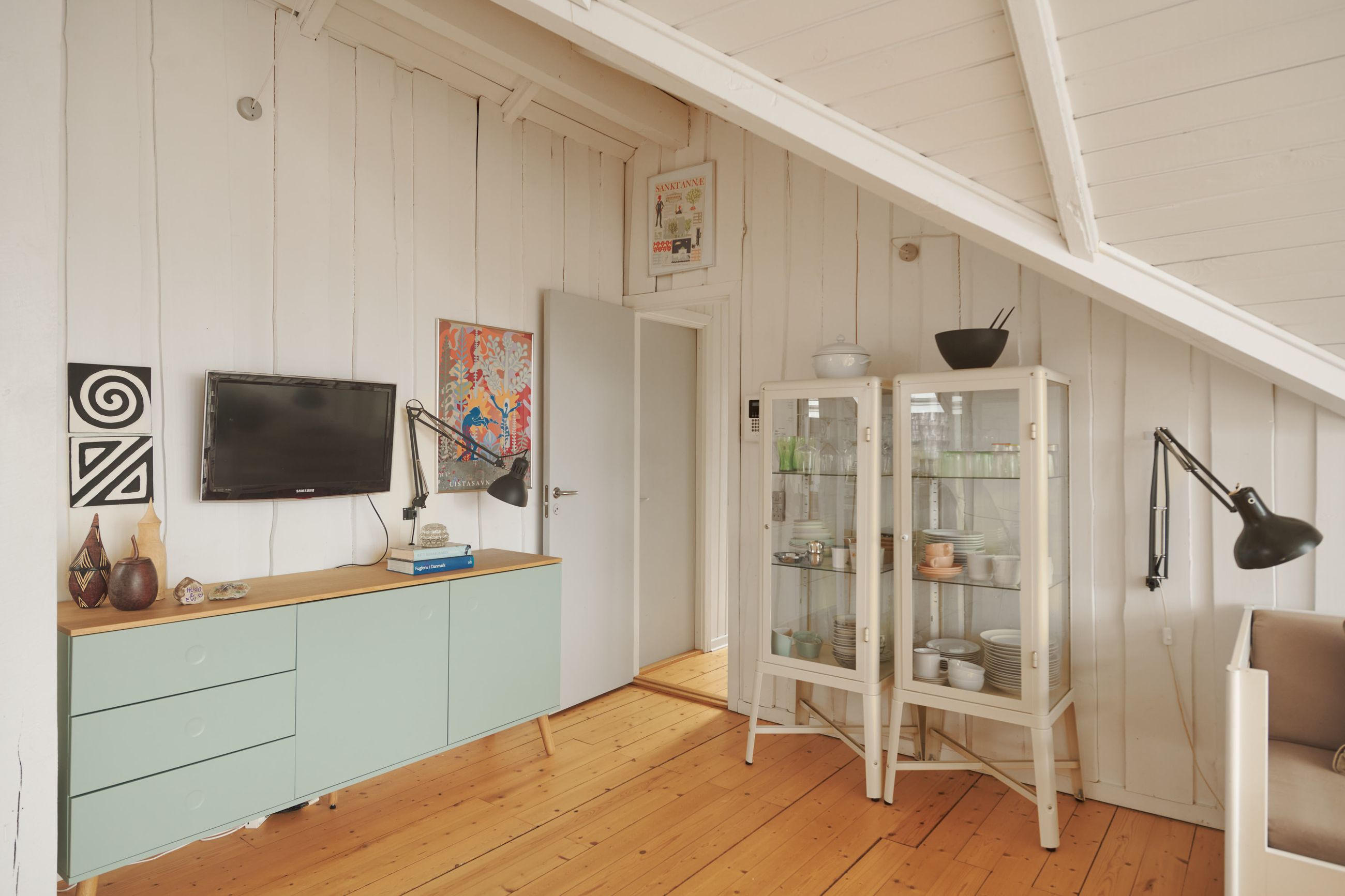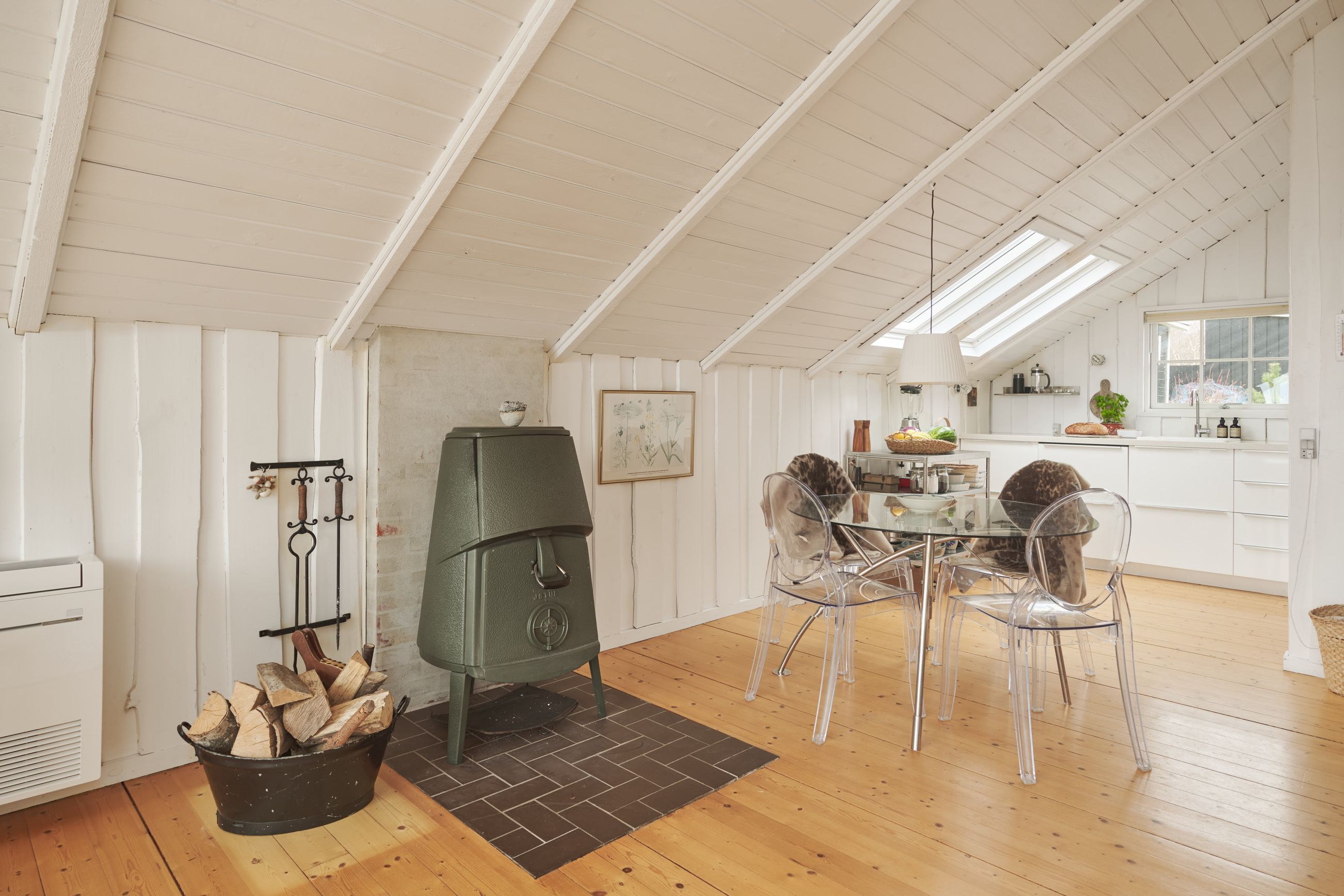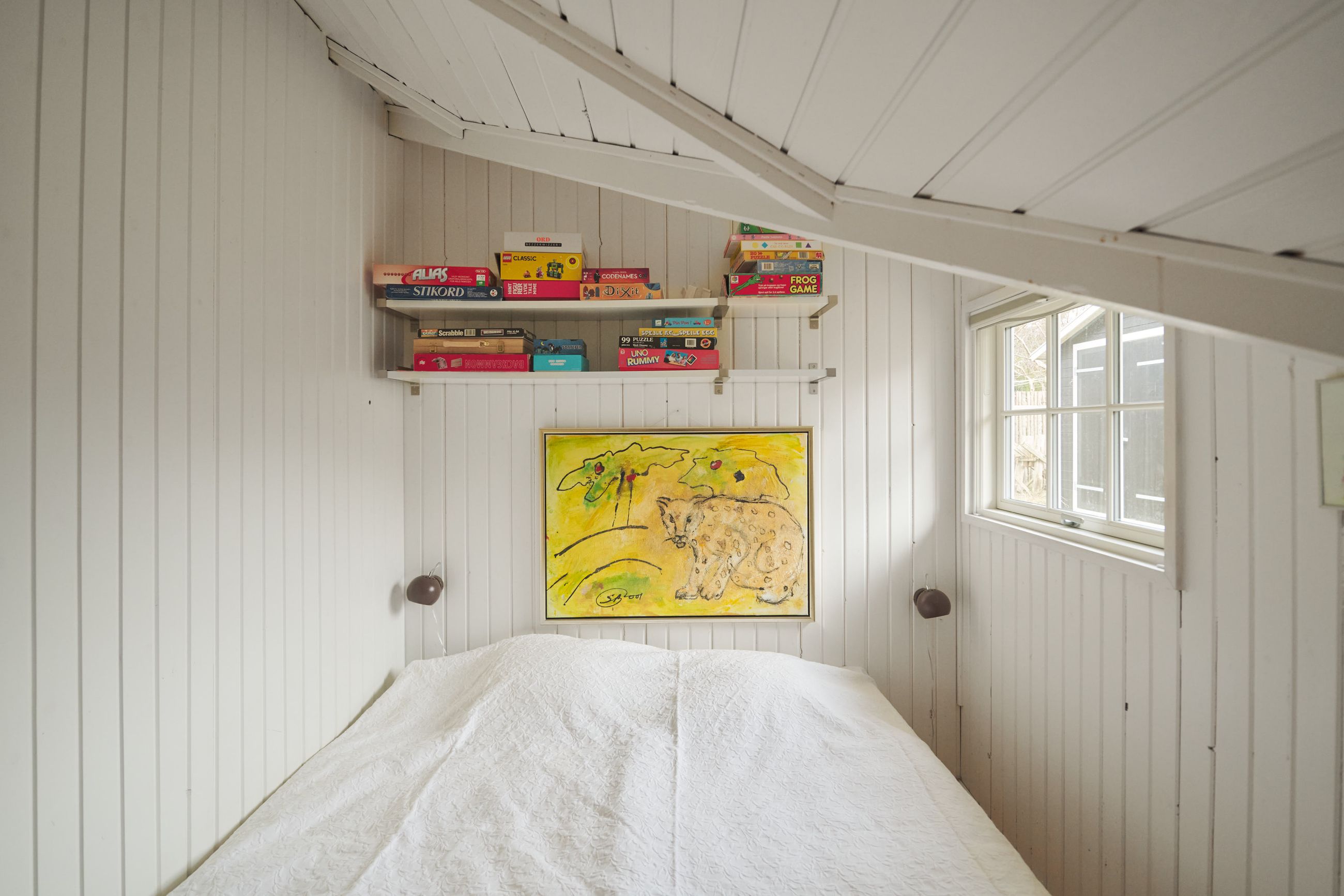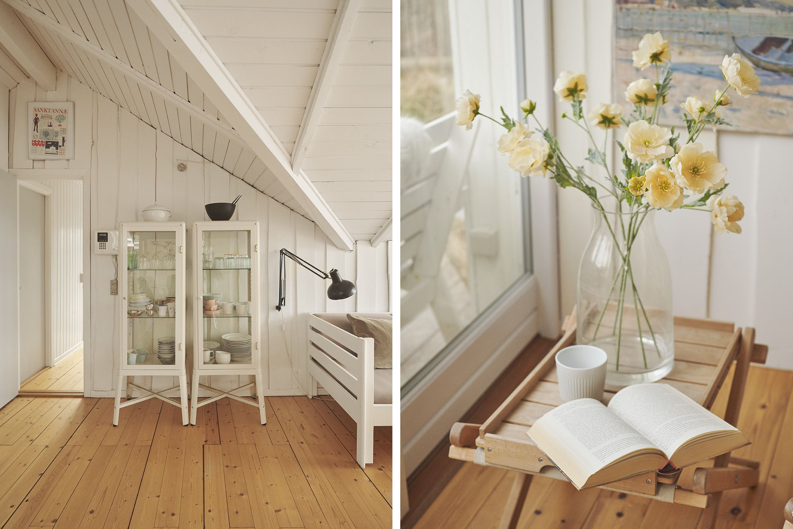 Huset er et Kalmarhus bygget i 1973 som et strandhus, et havudsigtshus, et diskret hus. Det ligger så naturligt på grunden, som var det vokset op af lyngen. Et Kalmarhus er et svensk træhus og opleves i dag som klassiske, modernistiske træhuse. Der er masser af charme masseret ind i de 60 m2. Og de er eftertragtede, Kalmarhusene, for arkitekturen passer godt ind i tidens appetit for lys, træ og enkle linjer. Og så ligger Kalmarhuse lavt og vandret på deres matrikel. Her er store vinduer mod Kattegat, tak for det, sikken udsigt, sikken glæde det må være at opleve havets evige bevægelse og himlens spejlinger i vandet. Huset står ugeneret og helt rigtigt på den 788 m2 store grund.