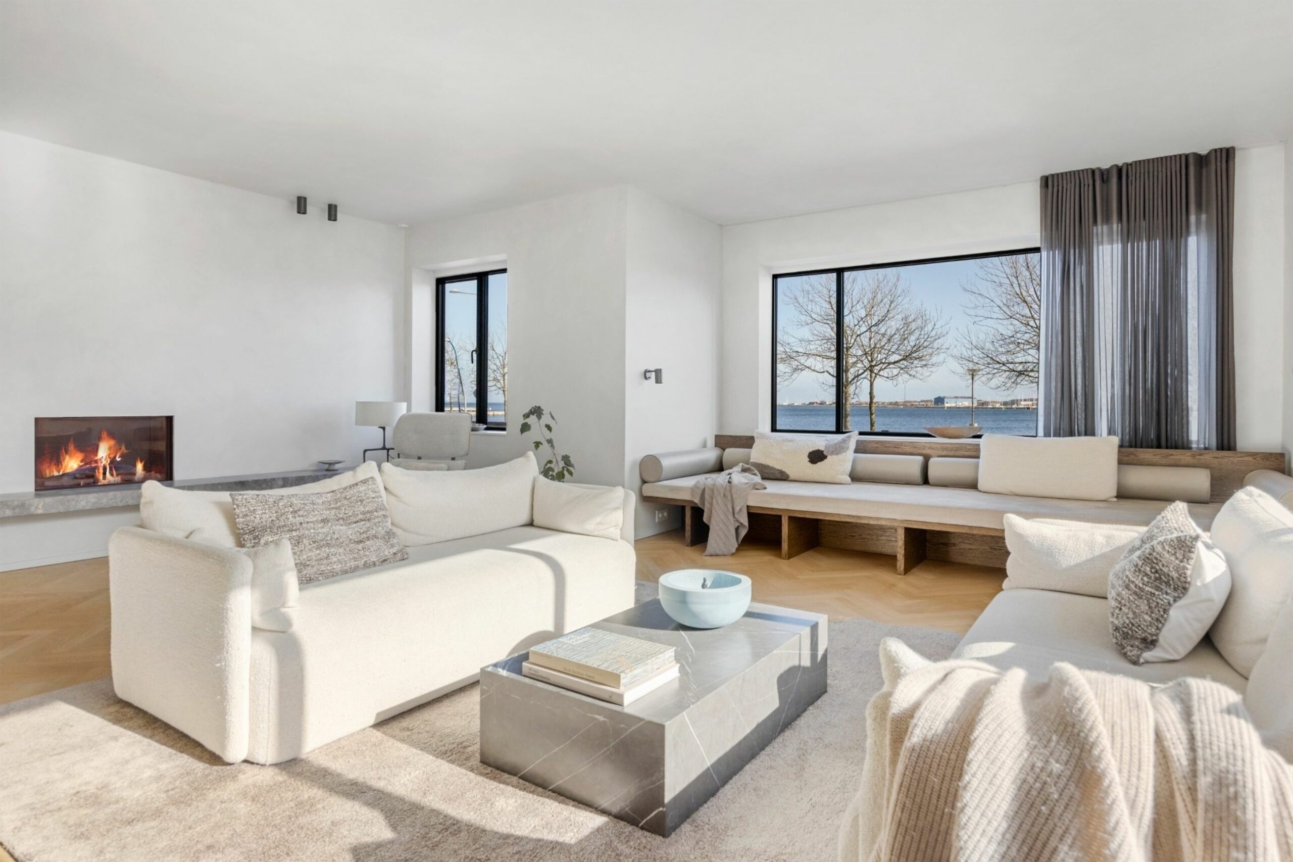 2 år tog det at renovere alt til den uforskammede lækre bolig, det er i dag. Alle 330 etagemeter, hvor de 108 m2 ligger i underetagen, er renoveret med ambitiøse, kærlige hænder og arkitekter, som er fremsynede nok til at bringe fortiden med langt ind i fremtiden. 1930ernes rene funkislinjer er bevaret. Her er ingen staffage eller pyntesyge, bare enkle løsninger, smukke, røde mursten, kilovis af marmor og fokus på husets hjerterum: køkkenet. Udsigten over vandet er fantastisk, fra tanke til at hoppe i er der kun få skridt.