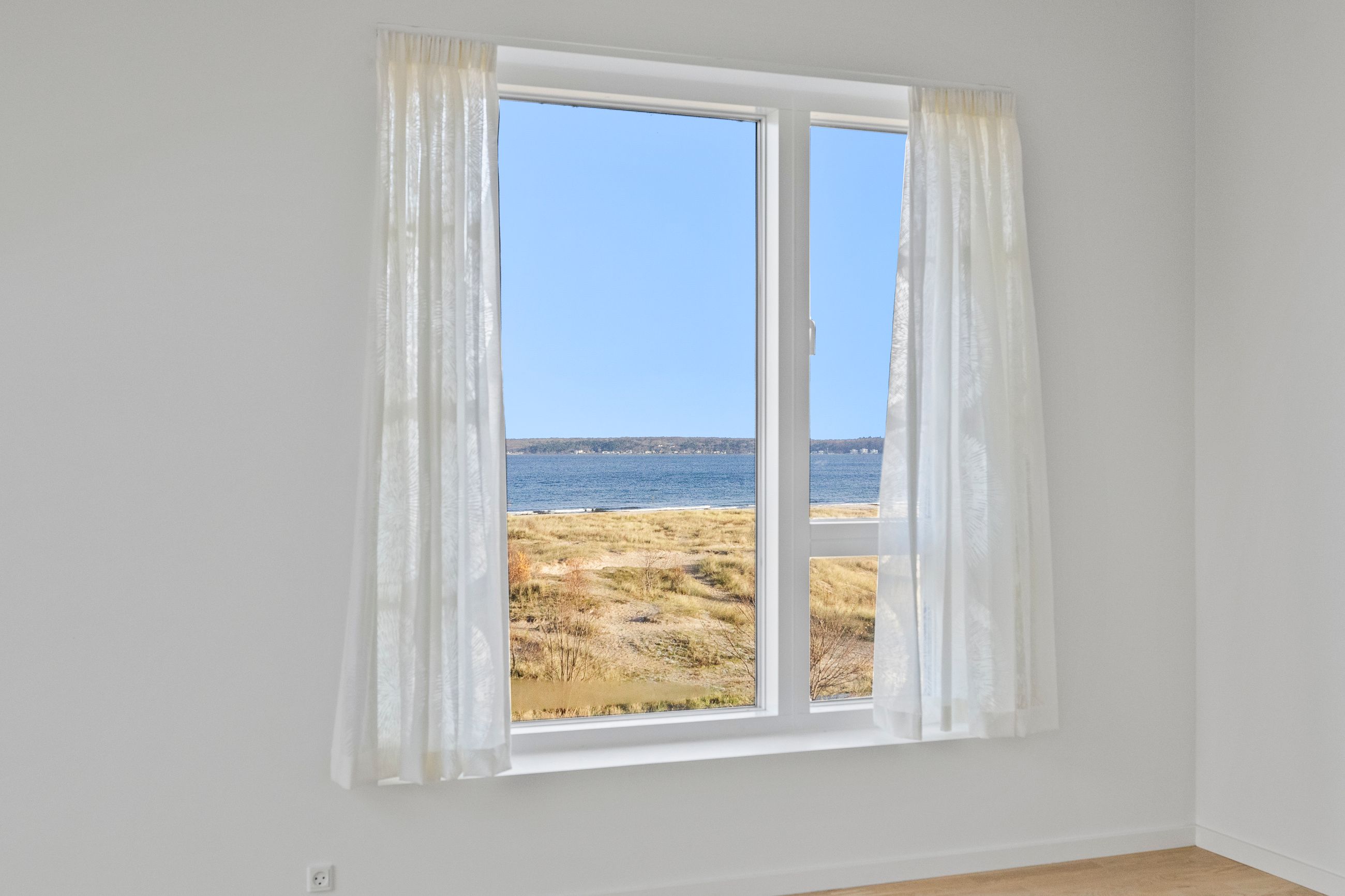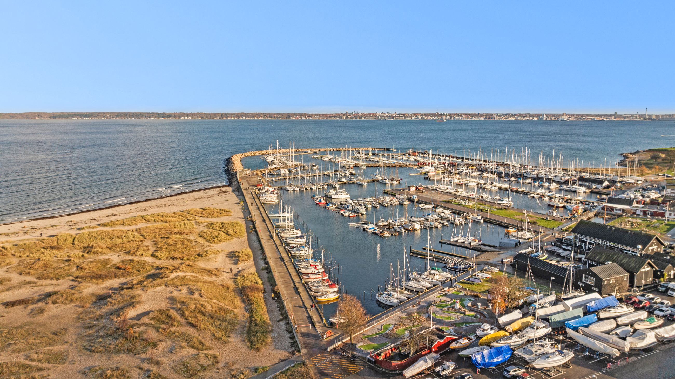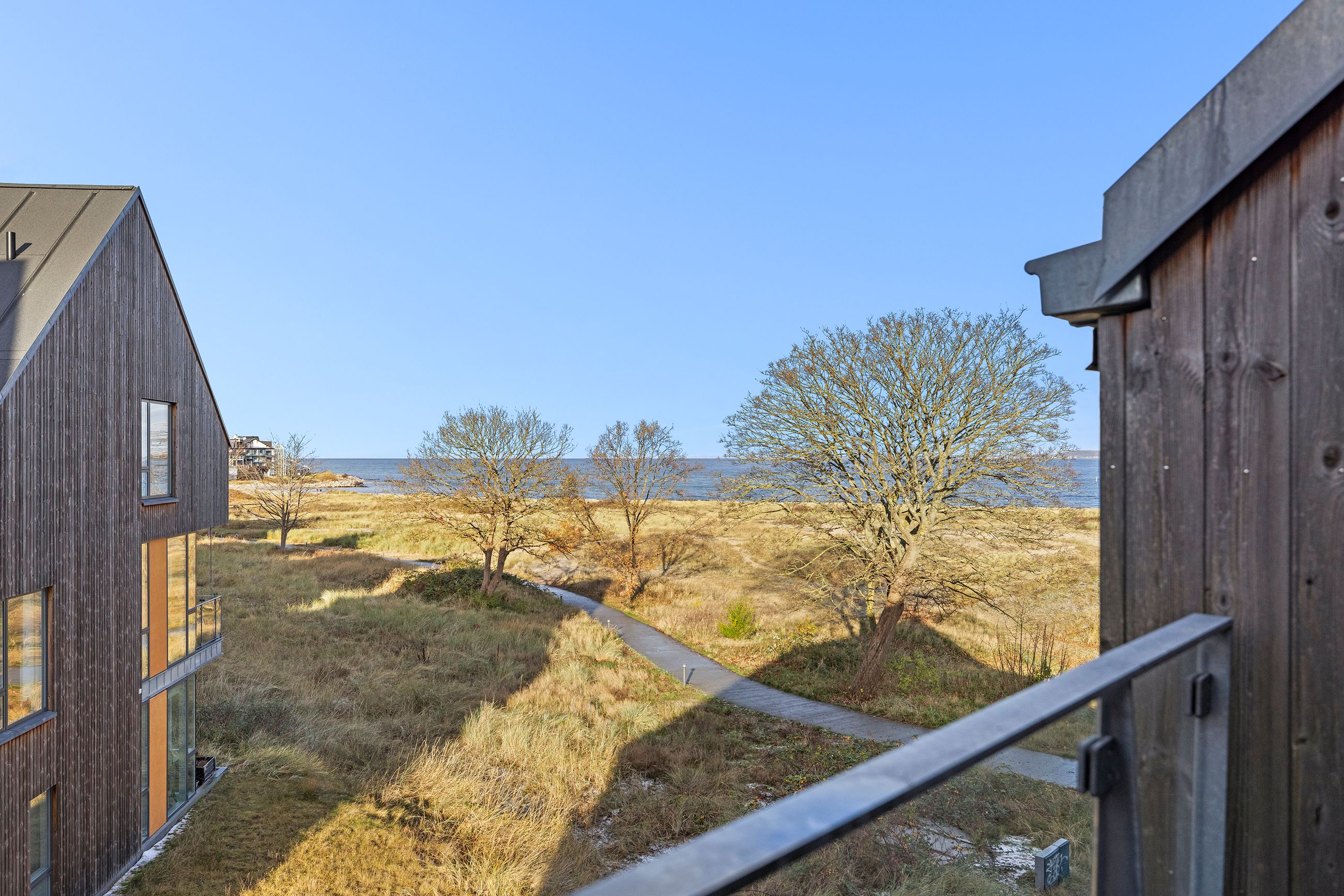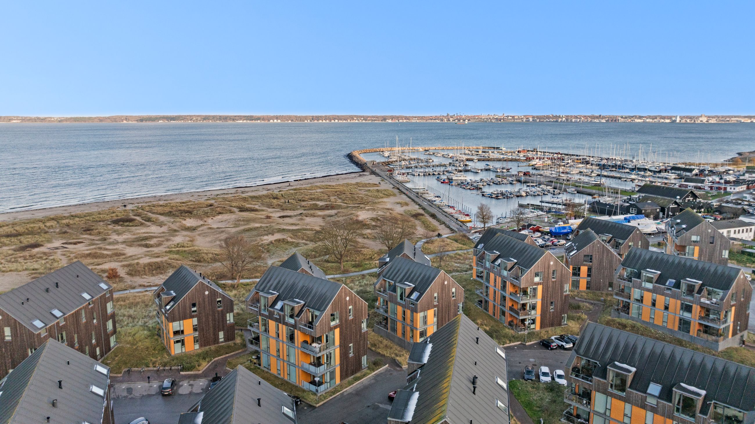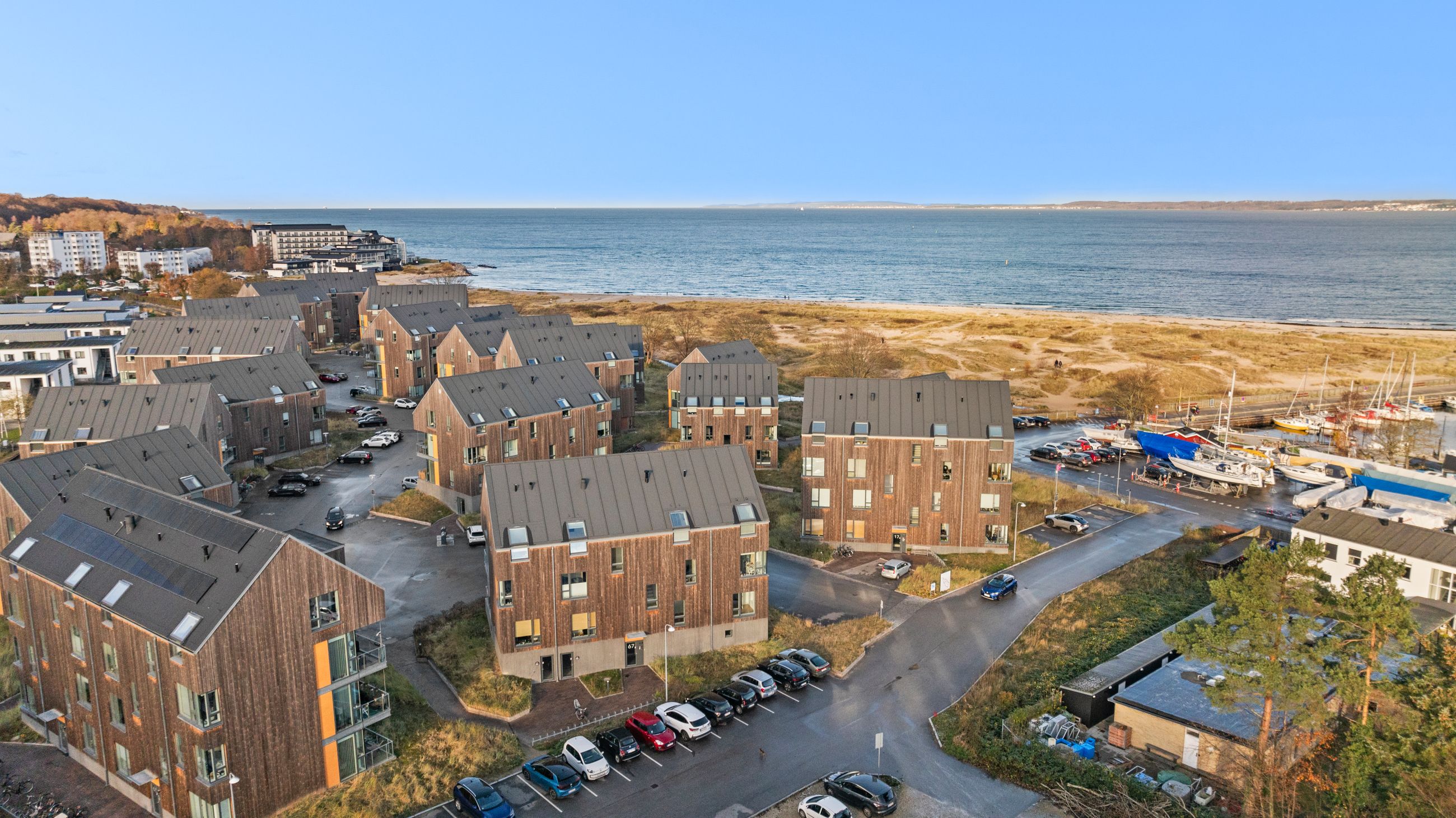 At bo på en strand med sand, marehalm og klitroser under fødderne, ja, hvad er nu det for noget. Det er såmænd bare Punkthusene, de attraktive og smukke træbeklædte ejendomme bygget i 2019 lige overfor lystbådehavnen i Helsingør Nordhavn. De står på strandmatriklen, som var de sat tilfældigt uden omtanke. Men næh, de er betænksomt placeret, så alle lejlighederne i de 24 ejendomme får den optimale glæde af udsigten over Øresund. At bo her er som at bo på kanten af verden, hvor salt og vand banker på ruden hver morgen for at spørge, om man vil med. Det vil man selvfølgelig gerne. Mange begynder dagen med en svømmetur, nogle går en tur med hunden langs vandkanten, andre fylder sindet med de indtryk, som kun en udsigt over havet kan give.