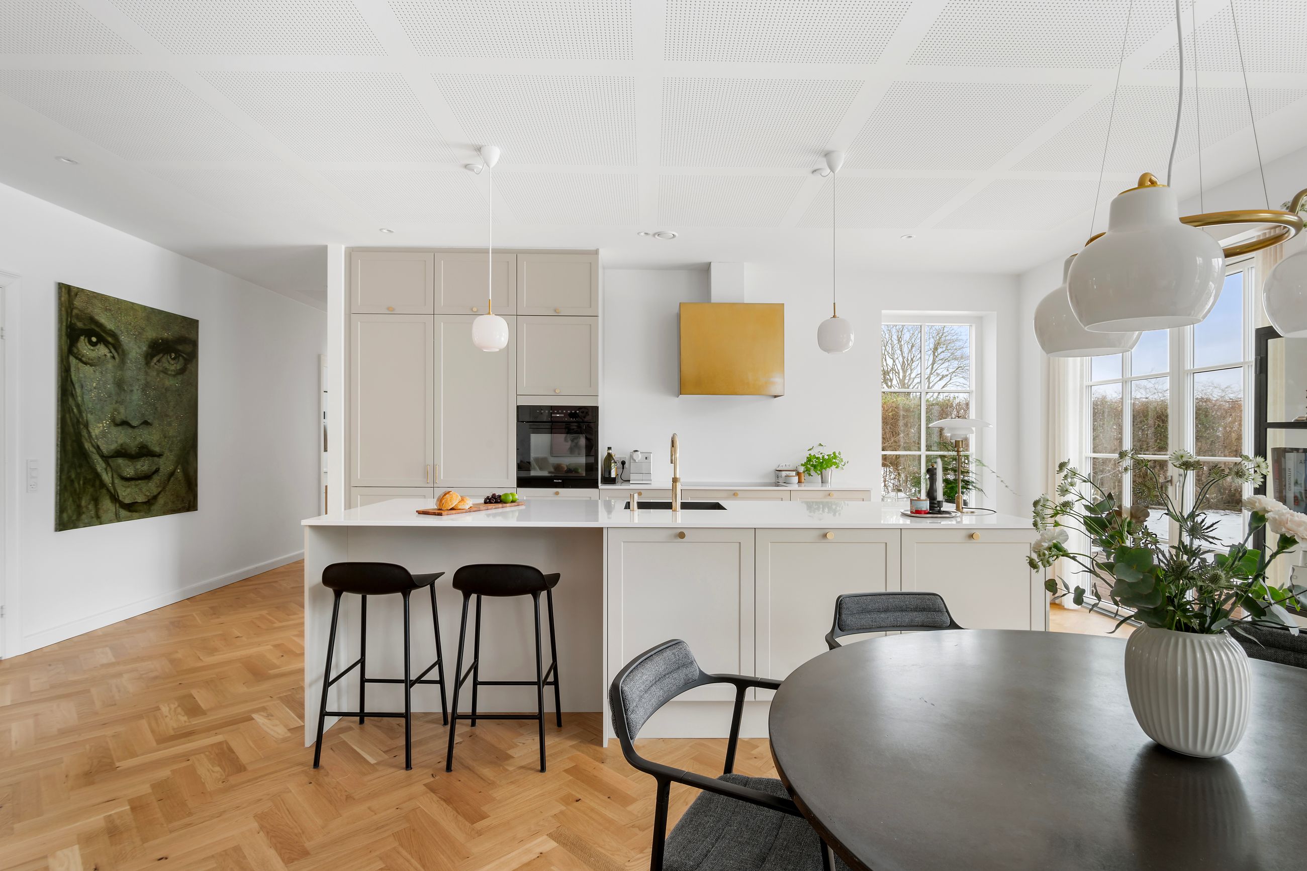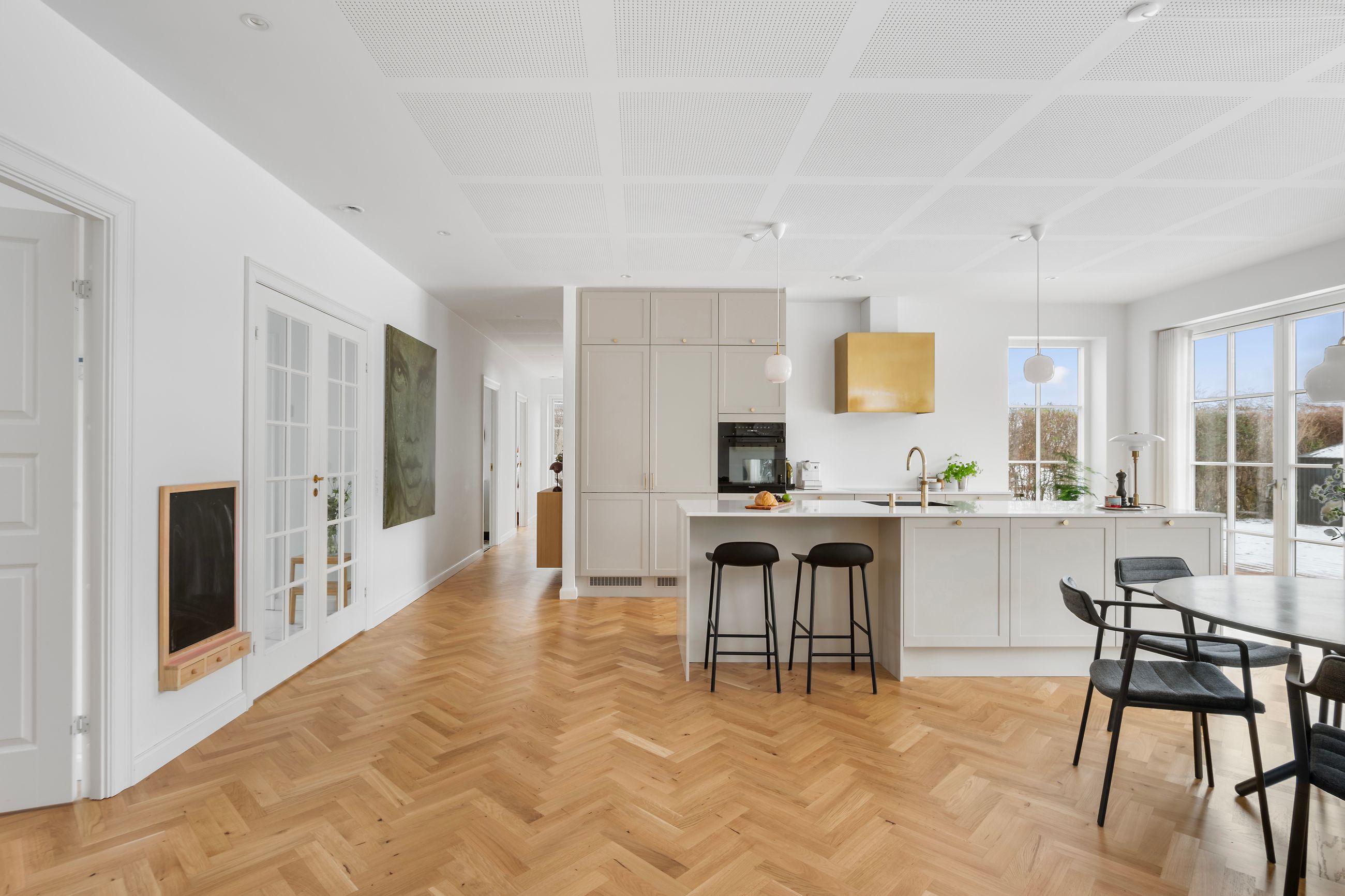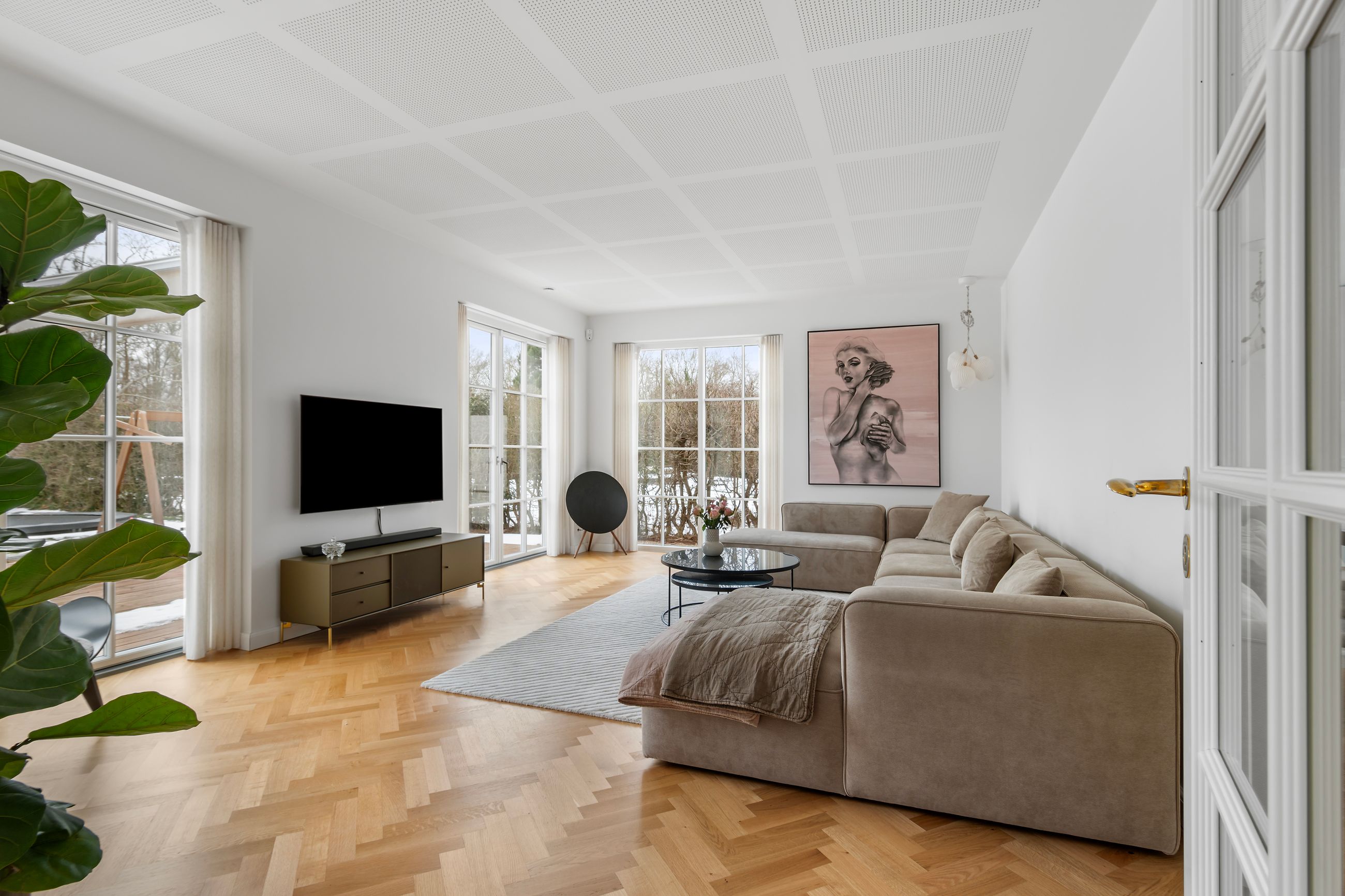 Svaleøvej ligger få hundrede meter fra havnen og badebroen. Det er et nyt hus fra 2023, ikke meget vedligeholdelse her de næste mange, mange år. Det ligger så natursmukt ud til grønne marker og hundeskov, og det er naturen, man skal ville for at flytte ind her. Men huset er altså også værd at tale om, for det er et uforskammet lækkert hus med højt til loftet, masser af lys fra gulv-til-loft-vinduer, masser af plads til dine, mine og vores børn. Alle 192 m2 er i ét plan, farvel trapper, farvel niveauforskelle, farvel til den lille tøven i knæene. Alle er i øjenhøjde.