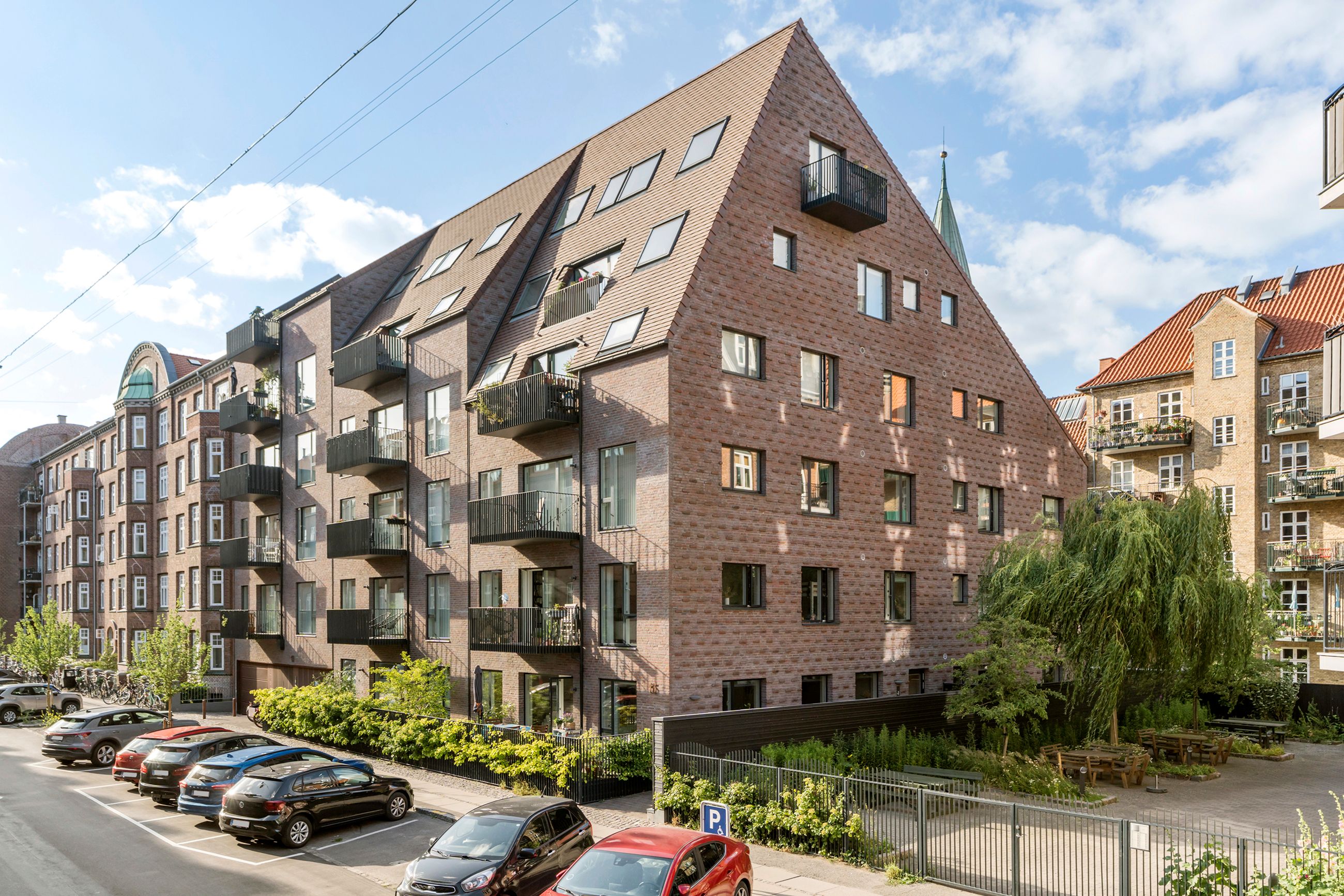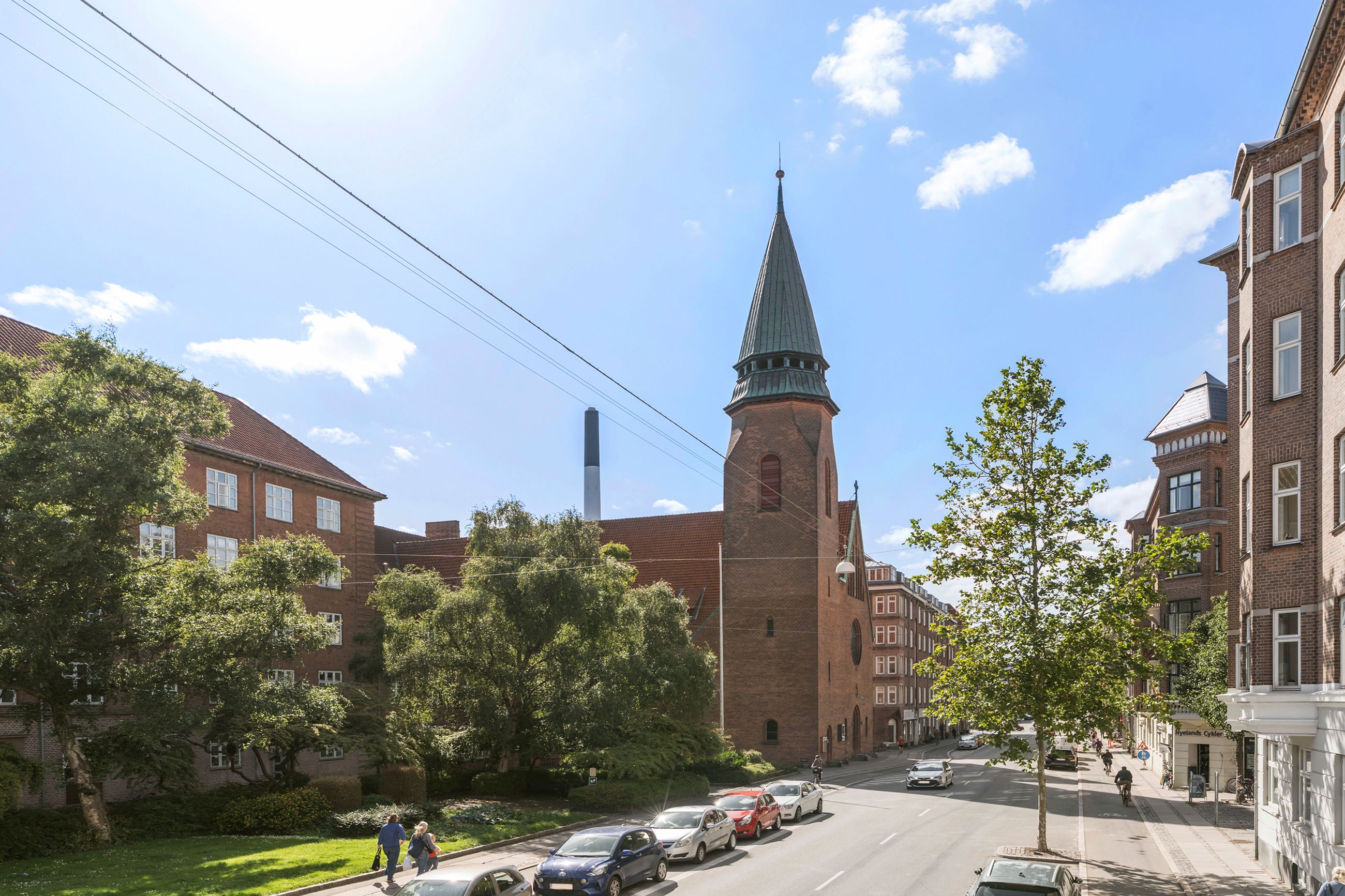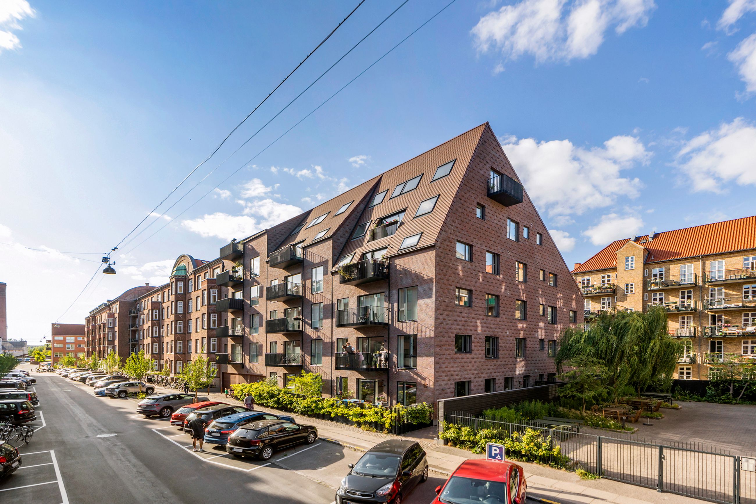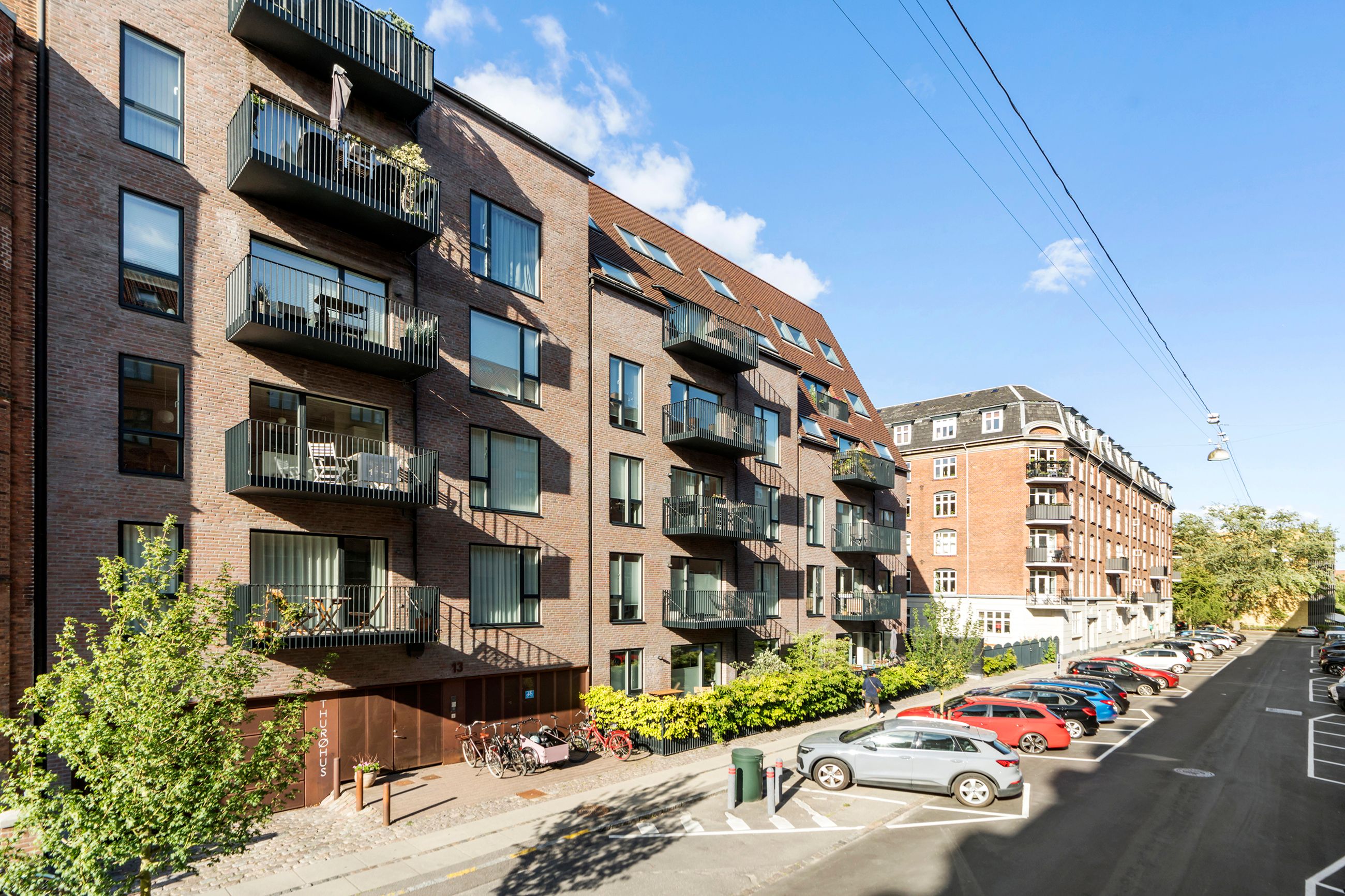 Thurøvej er vejen med ejendomme i den klassiske, røde mursten. Og det gælder også ejendommen Thurøvej 15 fra 2016 med de 18 lejligheder. Respektfuld over for arkitekturen på vejen er den også bygget op af røde mursten. Den glider lige ind, som man siger. Ja, den kunne også være bygget af en arkitekt, som bare havde lyst til at markere sit navn og stikke helt af med beton og glas. Men ikke her. Ejendommen har trods sin unge alder allerede vundet en pris for sine kvaliteter. Mange tak for det. Lejligheden på 1. sal er på 100 m2 med vestvendt altan og sol fra eftermiddag til den går ned. Her er privat parkering i kælderen og elevator til lejligheden. Det er en stor 3-værelses lejlighed og ideel til den enlige eller den lille familie, men den er bestemt også til kæresteriet eller det modne par. Alt er lige til at flytte ind i med indkøb og 2 metrostationer lige om hjørnet. Det er en lejlighed med masser af lys og udsigt til grønne træer.