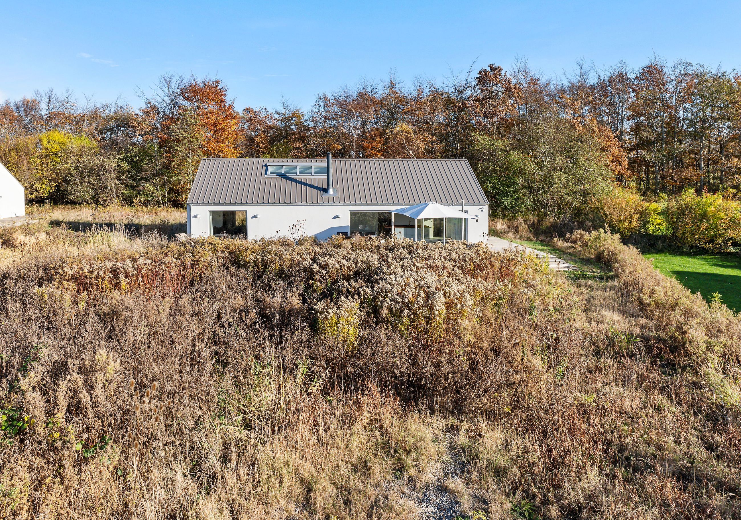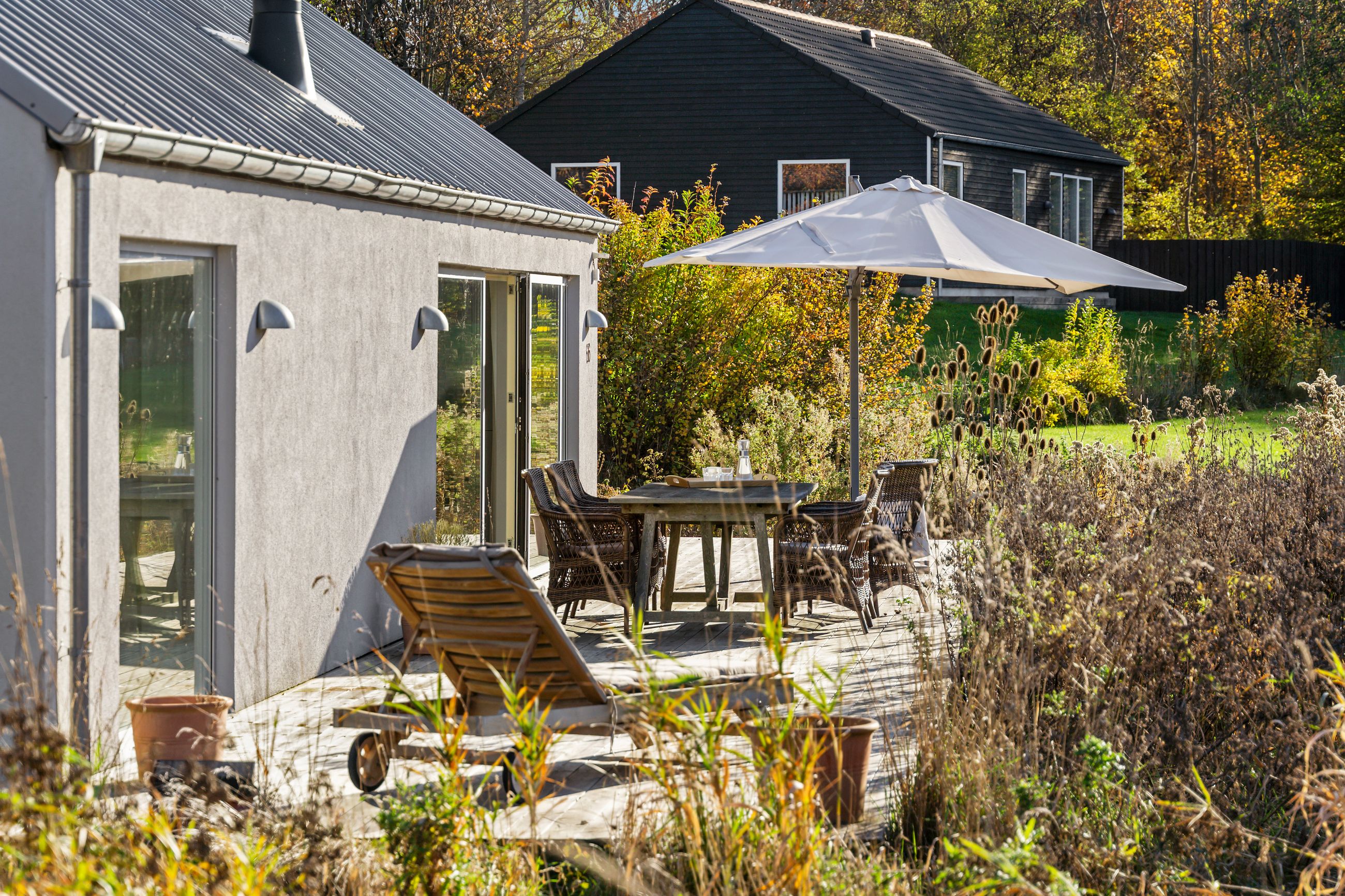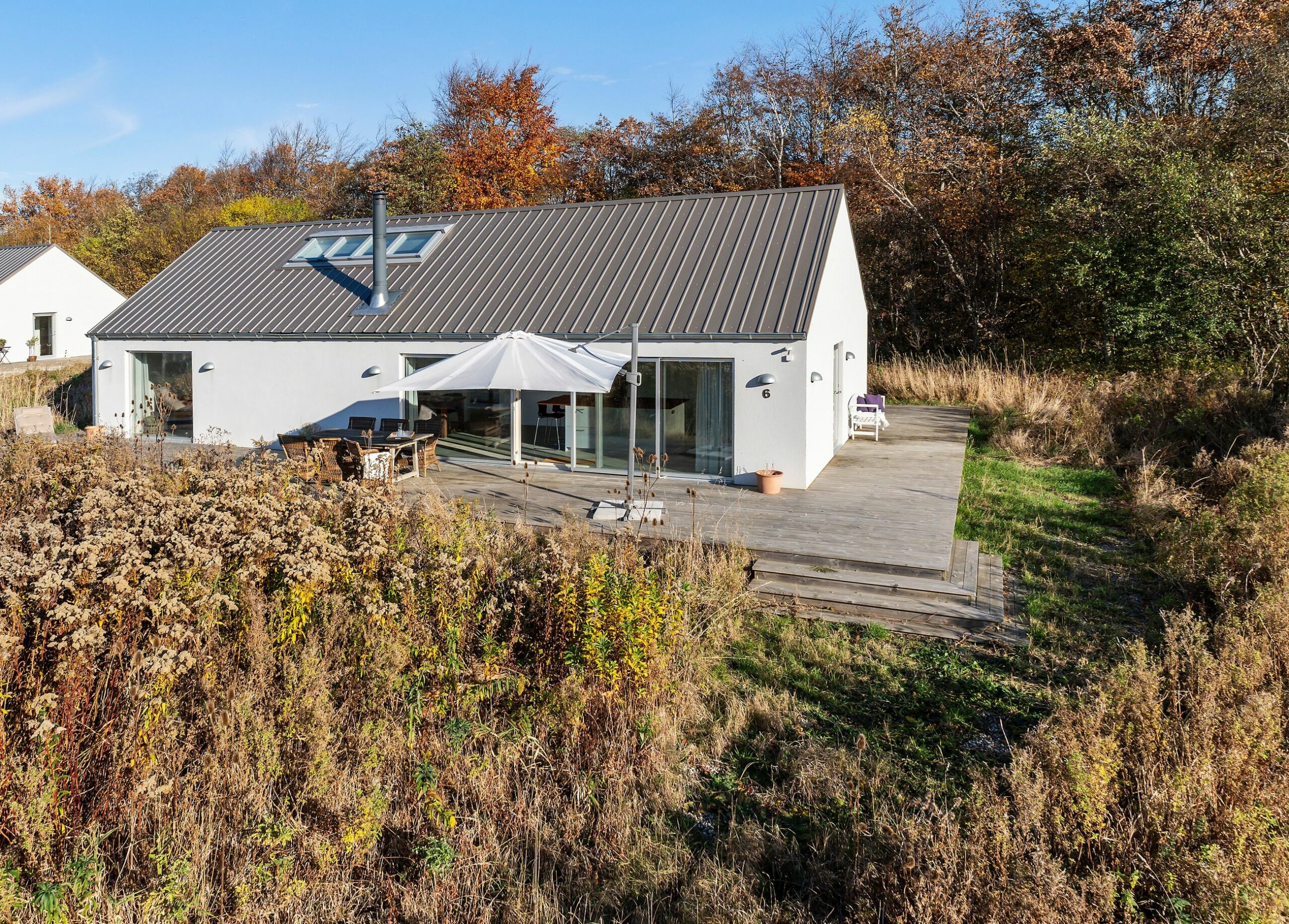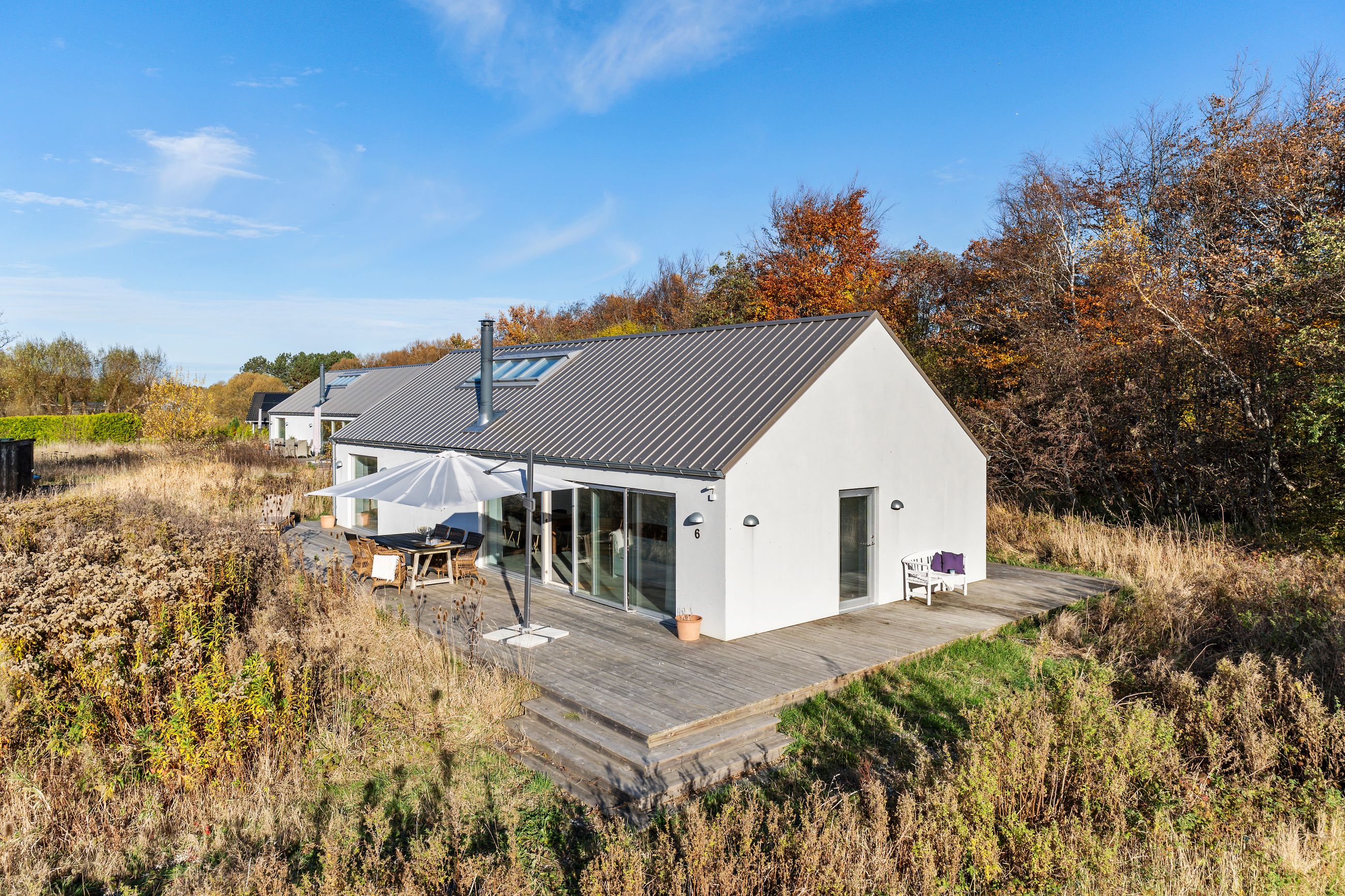 Sommerhuset på Trekroner Sidevej 6 ligger ikke langt fra Gudmindrup Strand. Huset er så nyt som fra 2022 og står på sin egen terrasseø, altså ikke meget vedligeholdelse her de næste mange år. Næh, bare hygge, sol på terrasser og maver og afslapning uden for mange dikkedarer som havearbejde. Haven er nemlig vild med vilje med dådyrøjne i græsset, sådan skal det være. Grunden er på 1.200 m2 med biodiversitet, som man siger, når insekterne summer som små motorer i naturens store maskineri. Med 105 m2 er her plads til familien med børn og venner på besøg.