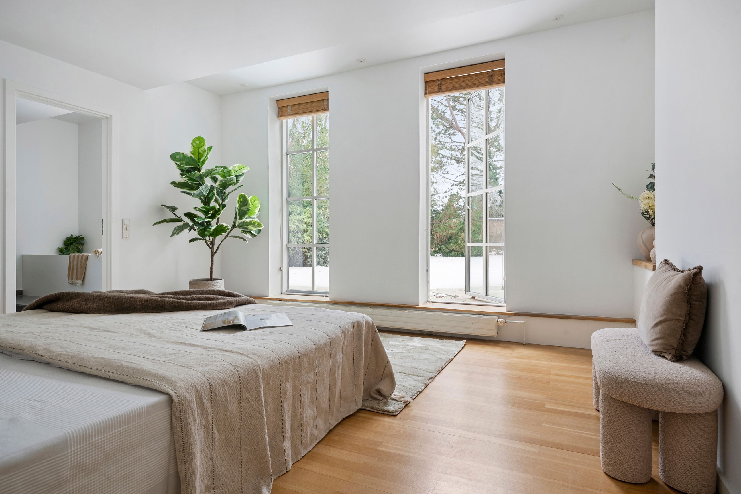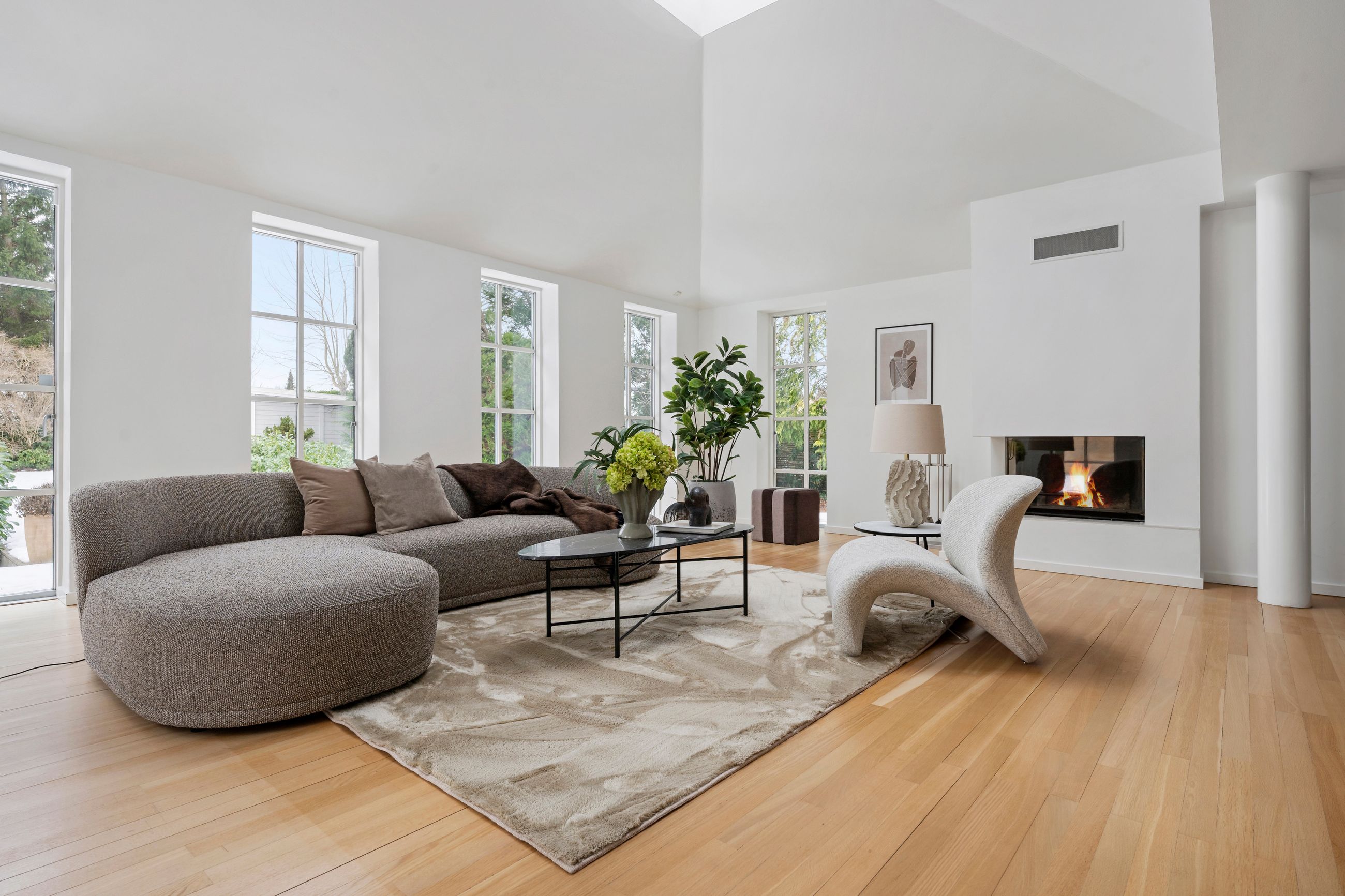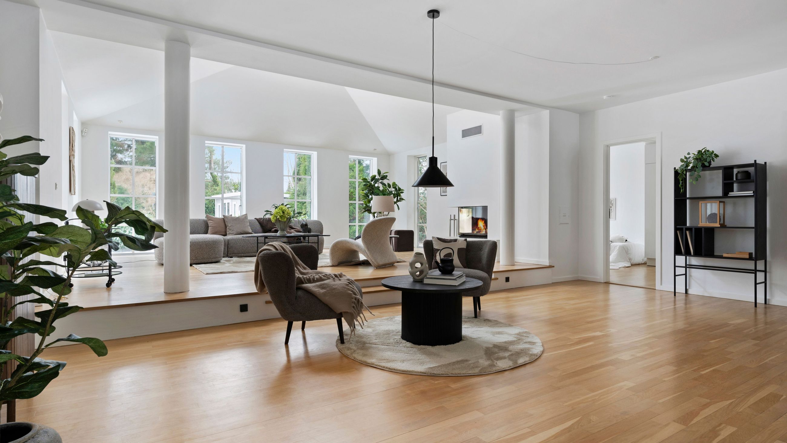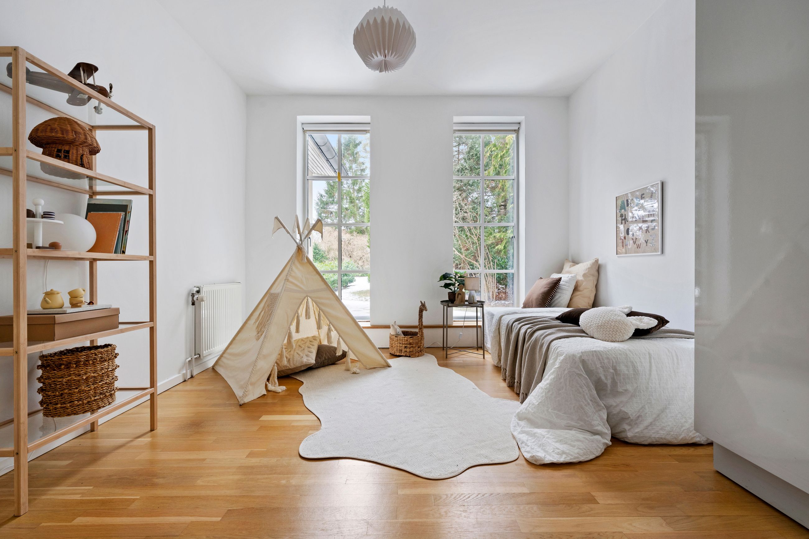 Man får næsten lyst til at sige, at huset på Vedbæk Strandvej er en skulptur med tagrender. Det er godt nok bygget i 1958 som et klassisk étplans hus, men her hører fortiden også op. Det fik sin renaissance, sin genfødsel en gang i 0’erne, og tænk, her fik huset 18 havedøre med sprossevinduer, en pyramide og et anneks til umulige teenagere eller au pair. Så her er der masser af lys, masser af plads, masser af charme med loft til kip under pyramiden. Ja, den korte og hurtige version er, at det er et toplækkert hus på 213 m2 med store rum lige til at flytte ind i.