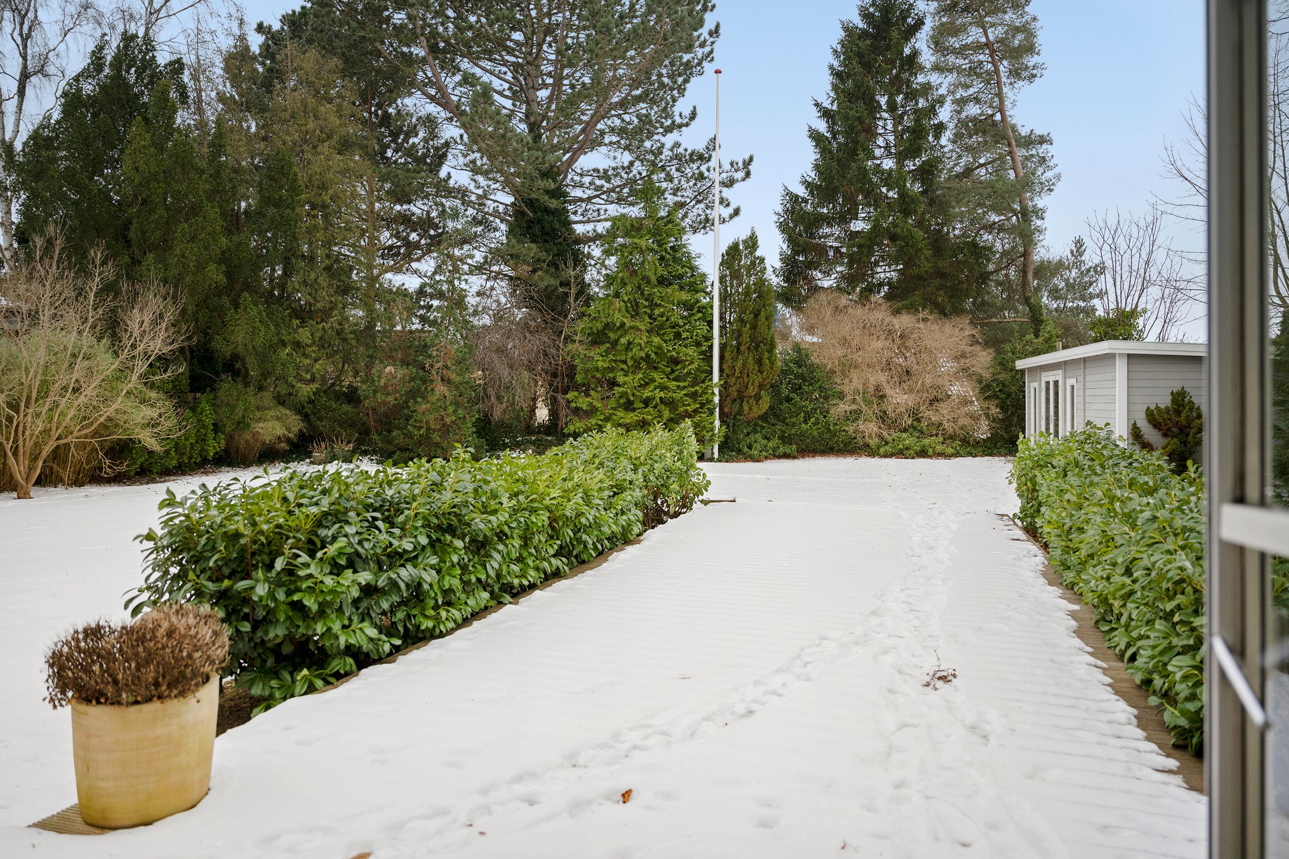 Grunden er på 1500 m2 med høje træer og en gårdsplads med plads til en fest af biler. Huset står tilbagetrukket fra Vedbæk Strandvej med lyddæmpende mur og elektrisk port. På den store vestvendte terrasse i baghaven kan man have lige så meget tøj på, man har lyst til, ingen kan kigge ind. Måske kan havnens måger finde på at pifte, når de flyver forbi.