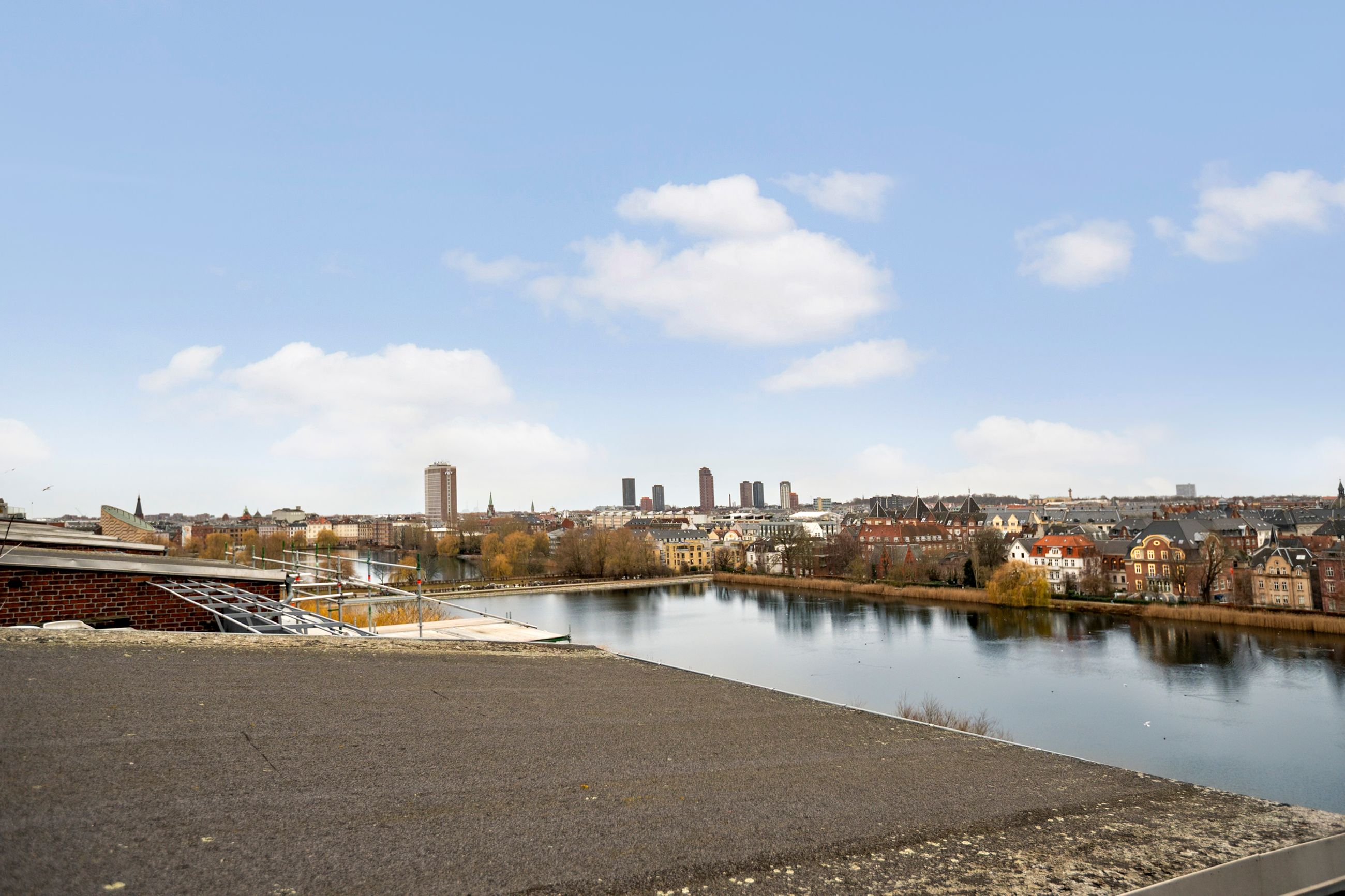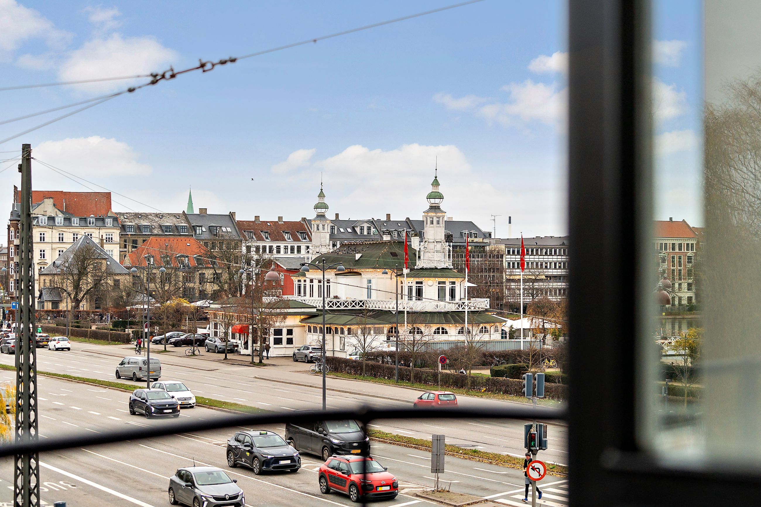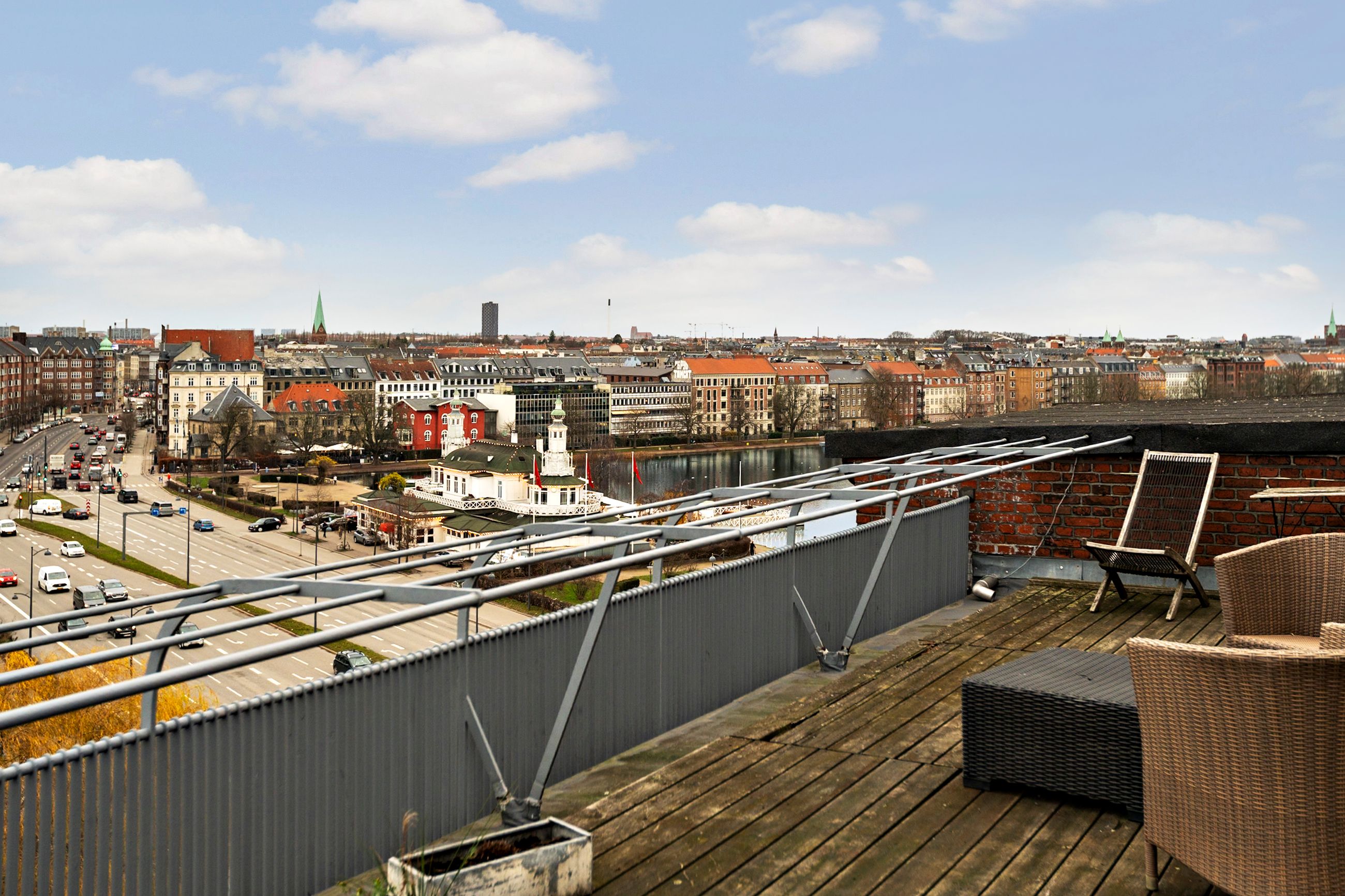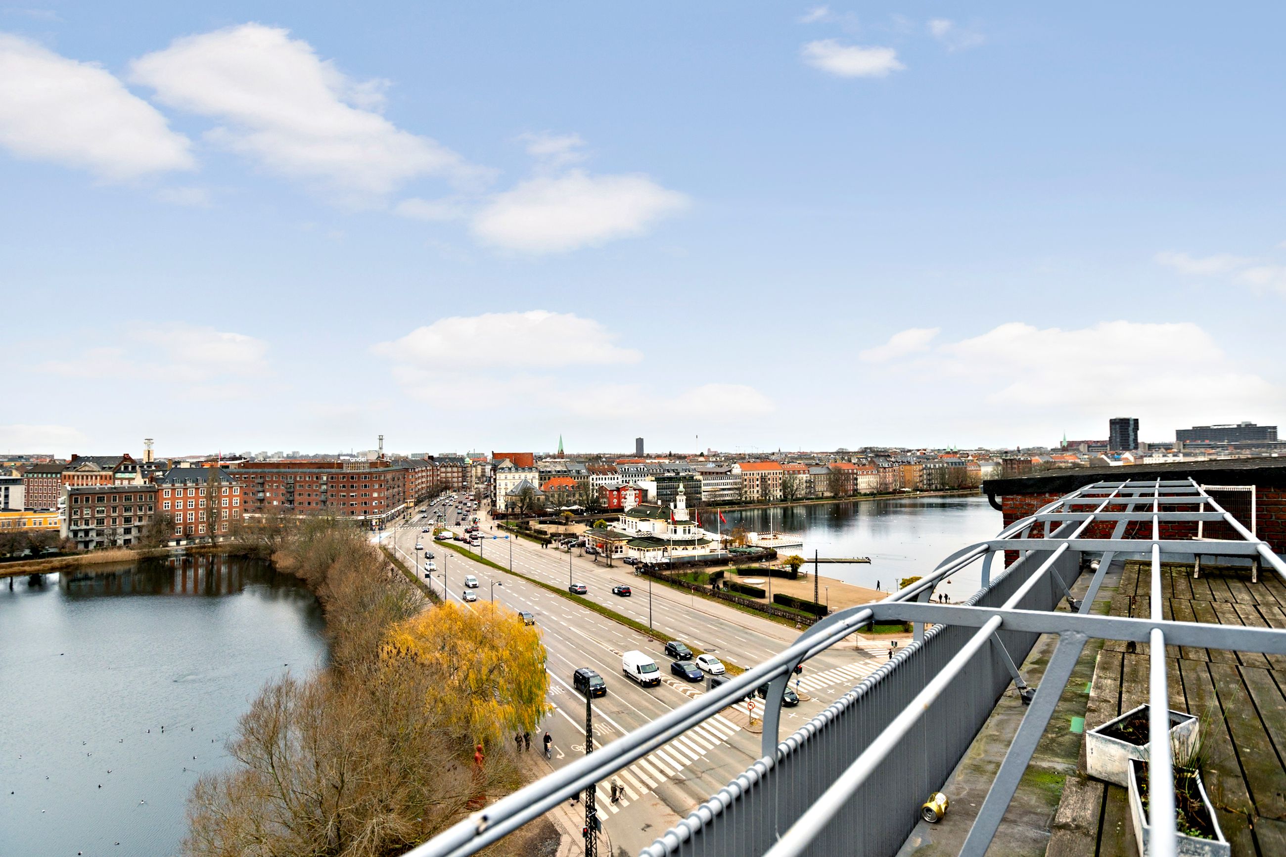Ejendommen er Vester Søhus med adressen Vester Søgade 78. Den er tegnet af Kay Fisker og bygget i 1938. Typisk for sin tid er ejendommen inspireret af funkis, altså uden dekoration eller lagkagepynt som stuk, rosetter, træudskæringer og høje paneler. Lejligheden på 2. sal er på 130 m2 med en forskydning fordelt til 2 niveauer, hvor nederste niveau er gæsteafdeling. Som gavllejlighed er her åbne vidder overalt, altså masser af lys og masser af udsigt med grønne piletræer i øjnene og Sankt Jørgens Sø, Peblinge Sø, Grevinde Danner og Søpavillonen lige uden for vinduerne. Sikken udsigt. Fisker selv boede i samme opgang på øverste etage. Elevator til fælles tagterrasse med sol hele dagen og de smukkeste solnedgange ned over Frederiksberg. Alt i byen er 5 cykelminutter væk. Ejendommen er fredet. Tak for det.