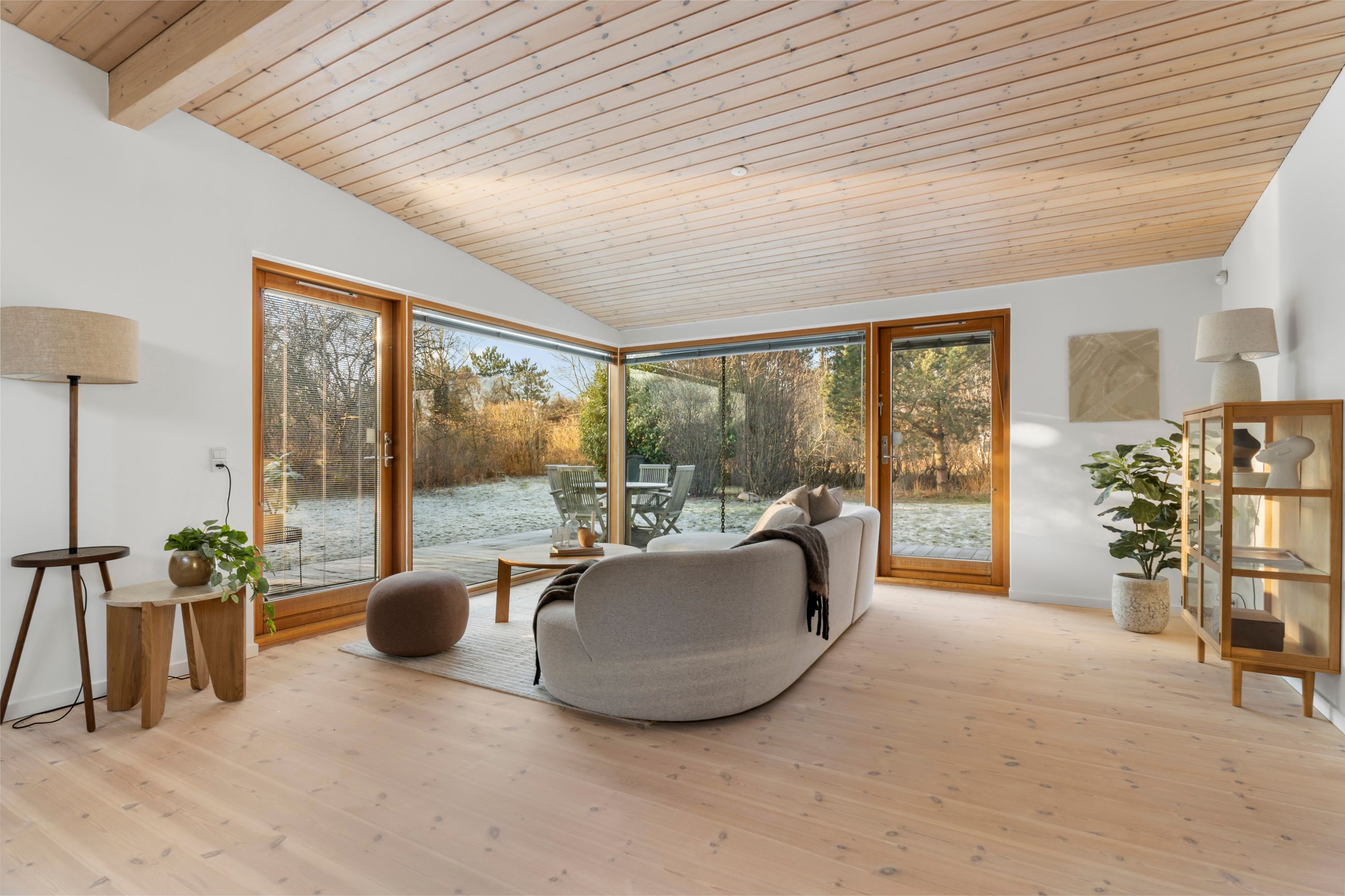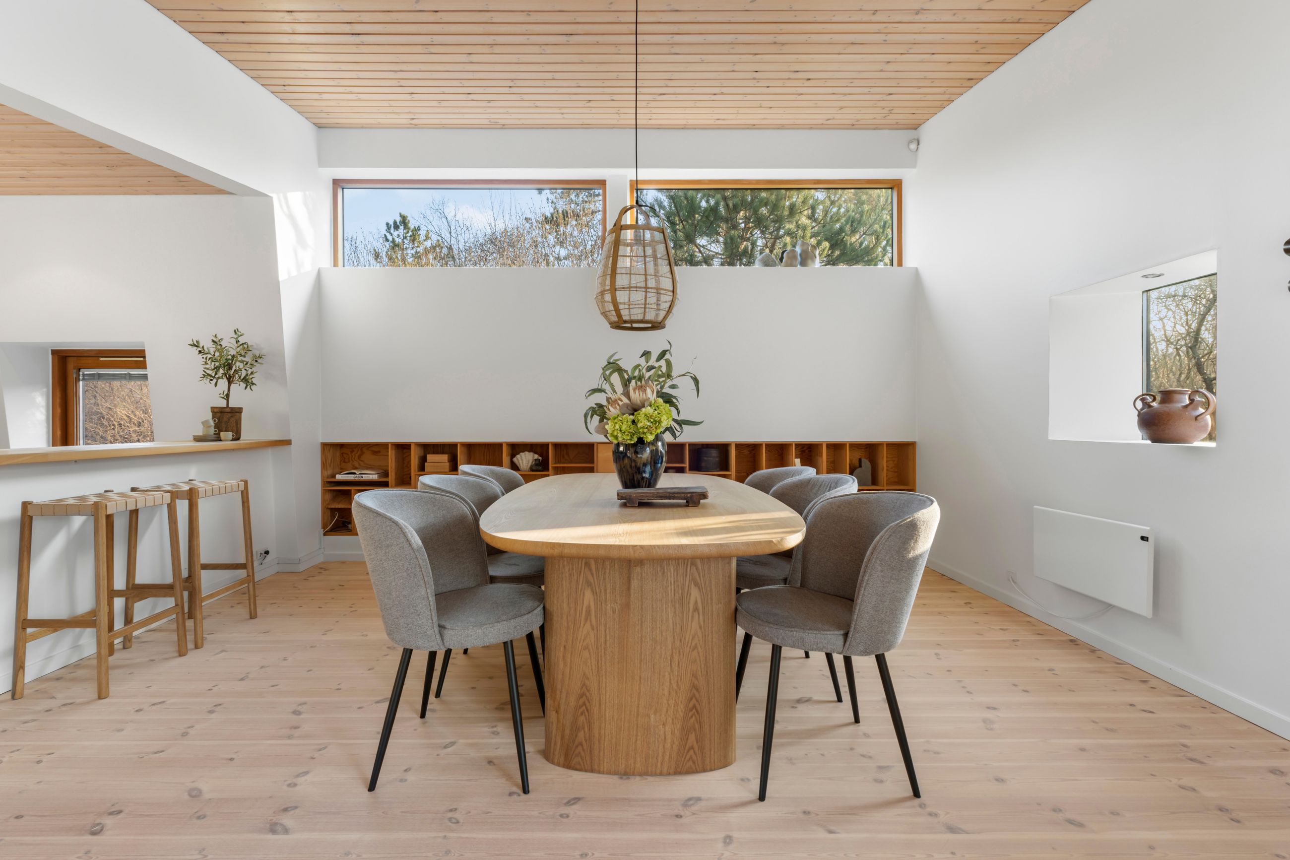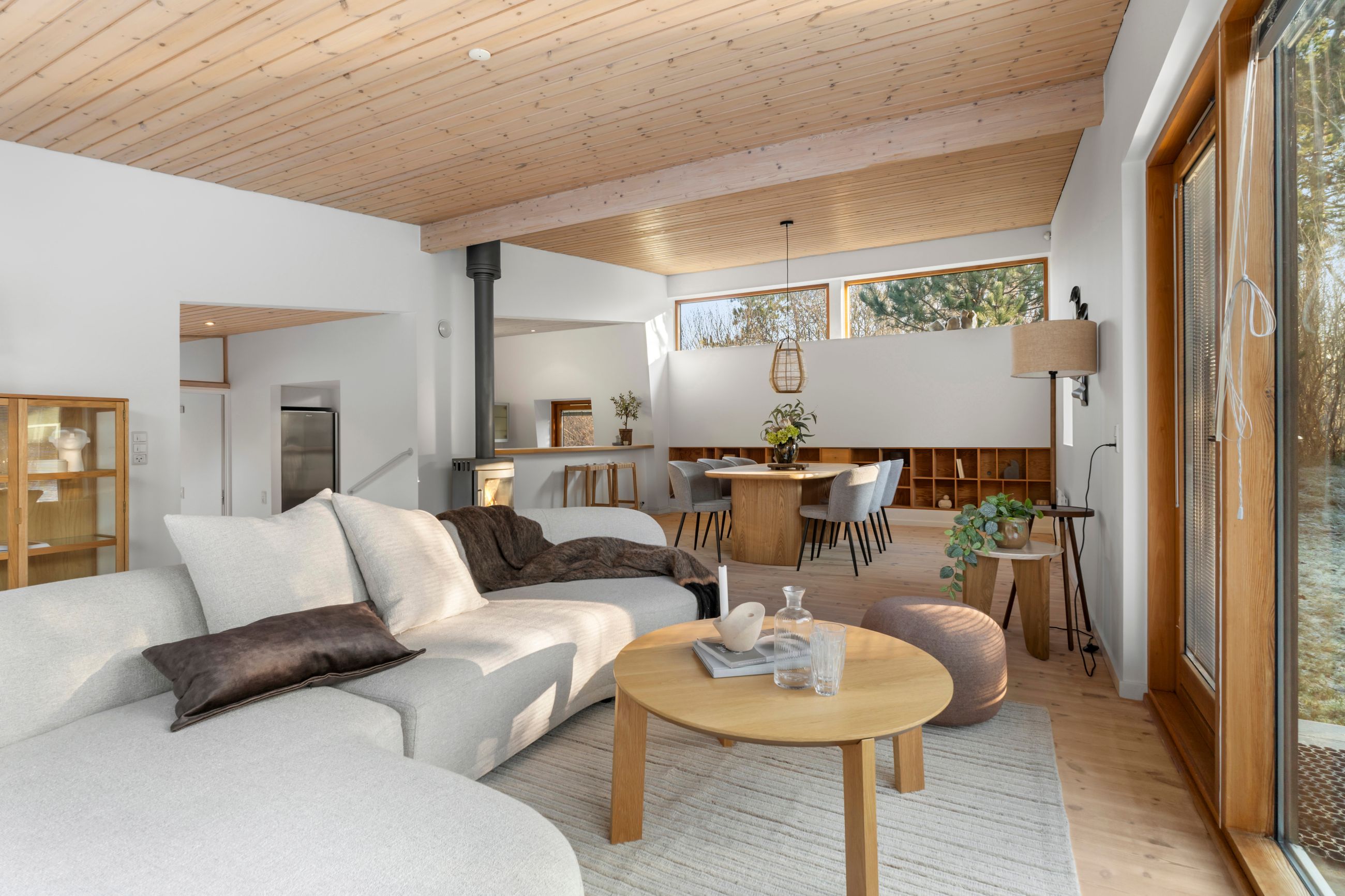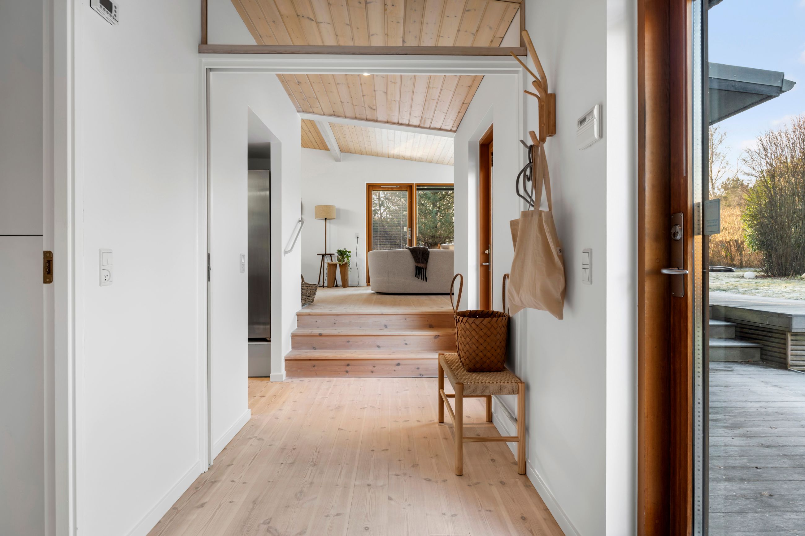 Skæve vinkler, interessante skygger, trappetrin mellem niveauerne fordi terrænet skal respekteres, højt til loftet, masser af lys, varme, glæde, ærlige materialer og fine detaljer. Ja, så ved man, at der har været en arkitekt med kærlighed til sit fag på spil. Som i sommerhuset på Vestvænget 6. Det er et hus, der ikke vil imponere, men omfavne, så stilheden aldrig bliver tom. Det er bygget i 2004 og stadig så ungt, at der ikke er meget vedligeholdelse her de næste mange år. Med 120 m2 er det et stort sommerhus, som med et par soveværelser er ideelt til det modne par, som overvejer at bo her hele året. Huset er bygget til det, det er nemt at varme op, alt er lige til at flytte ind i. Grunden er på 1.207 m2 med en have, der er nem at passe. Pas på når plænen skal klippes, der er pindsvin og dådyrøjne i græsset. Terrassen er syd- og vestvendt, her kan man ligge ugeneret og sole sig med lige så meget tøj på, som man har lyst til. Kun fuglene pifter i flok og blinker med det ene øje, hvis de er mange nok, når de flyver forbi.