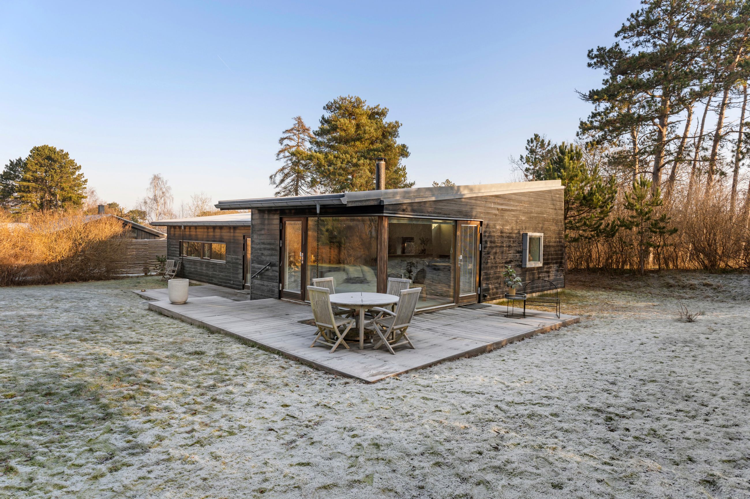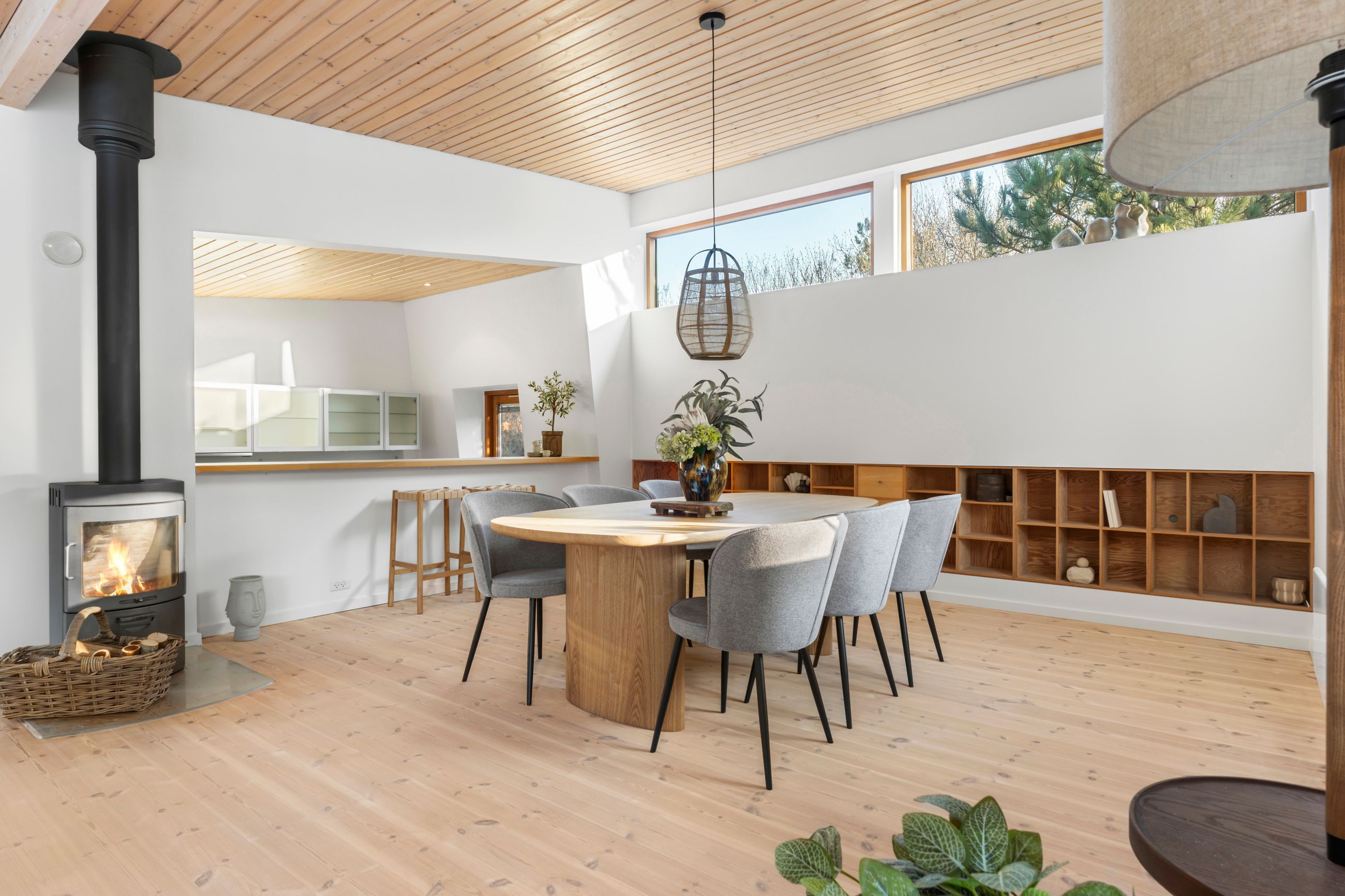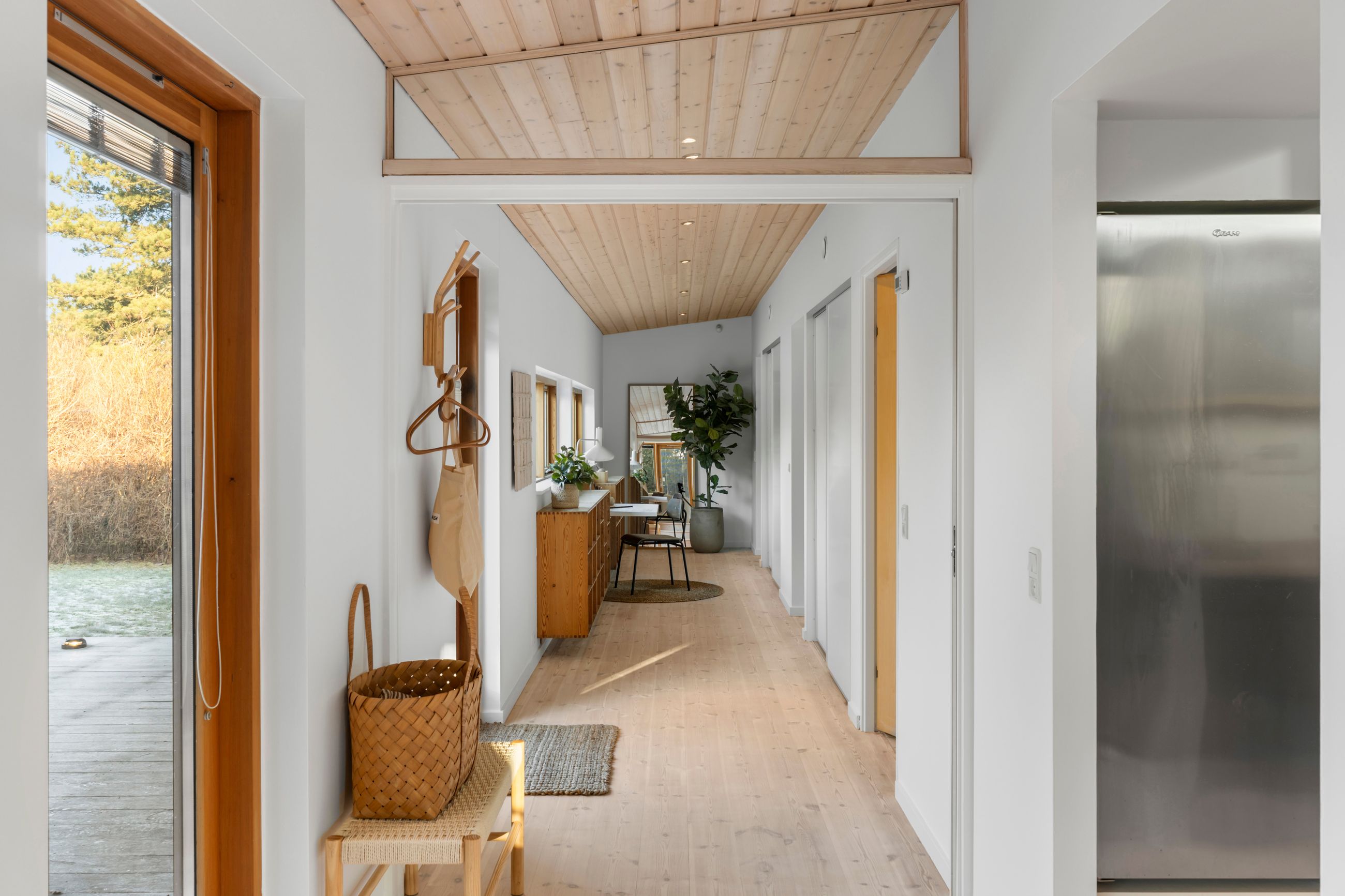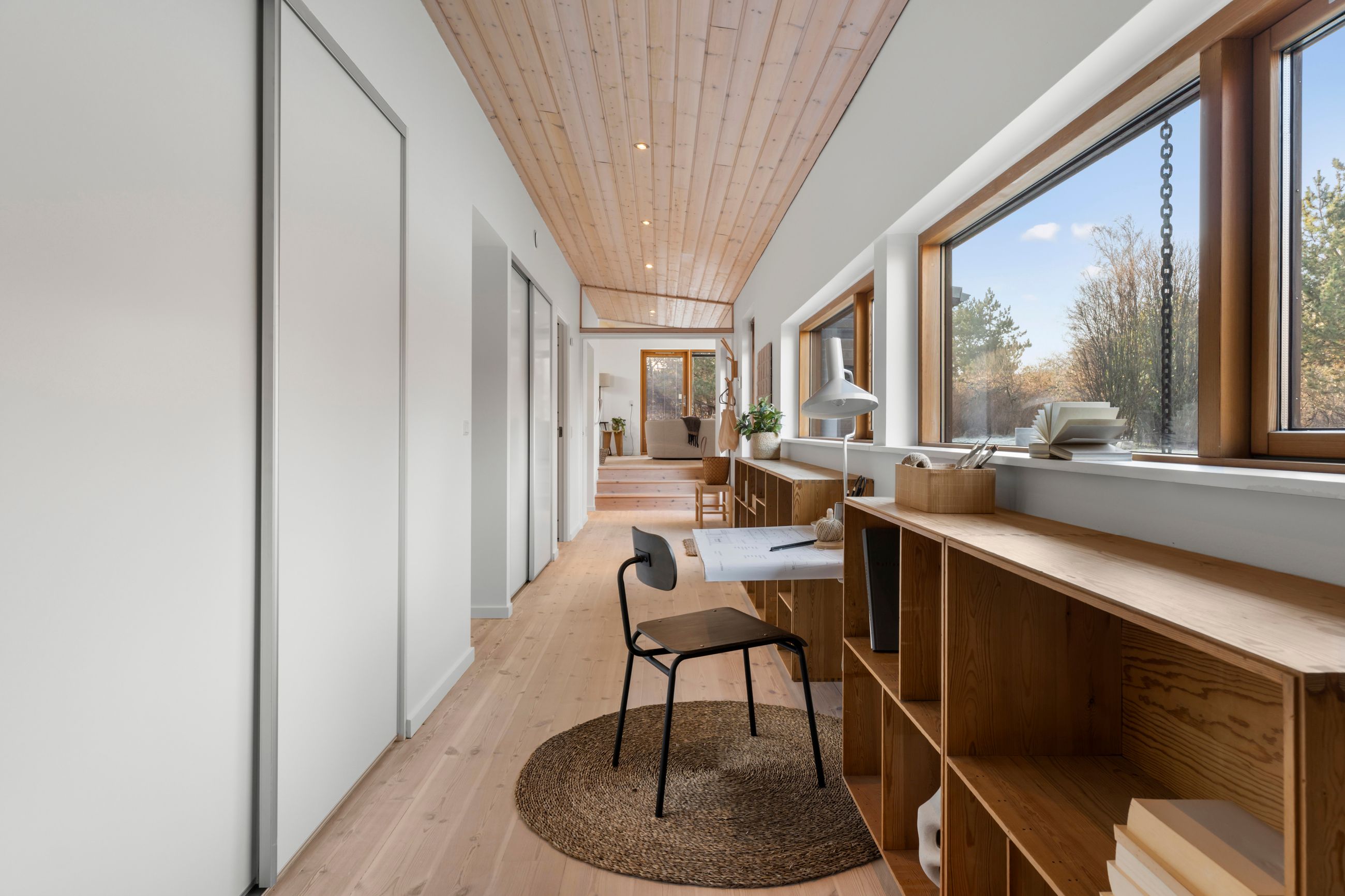 Skæve vinkler, interessante skygger, trappetrin mellem niveauerne fordi terrænet skal respekteres, højt til loftet, masser af lys, varme, glæde, ærlige materialer og fine detaljer. Ja, så ved man, at der har været en arkitekt med kærlighed til sit fag på spil. Som i sommerhuset på Vestvænget 6. Det er et hus, der ikke vil imponere, men omfavne, så stilheden aldrig bliver tom. Det er bygget i 2004 og stadig så ungt, at der ikke er meget vedligeholdelse her de næste mange år. Med 120 m2 er det et stort sommerhus, som med et par soveværelser er ideelt til det modne par, som overvejer at bo her hele året. Huset er bygget til det, det er nemt at varme op, alt er lige til at flytte ind i. Grunden er på 1.207 m2 med en have, der er nem at passe. Pas på når plænen skal klippes, der er pindsvin og dådyrøjne i græsset. Terrassen er syd- og vestvendt, her kan man ligge ugeneret og sole sig med lige så meget tøj på, som man har lyst til. Kun fuglene pifter i flok og blinker med det ene øje, hvis de er mange nok, når de flyver forbi.