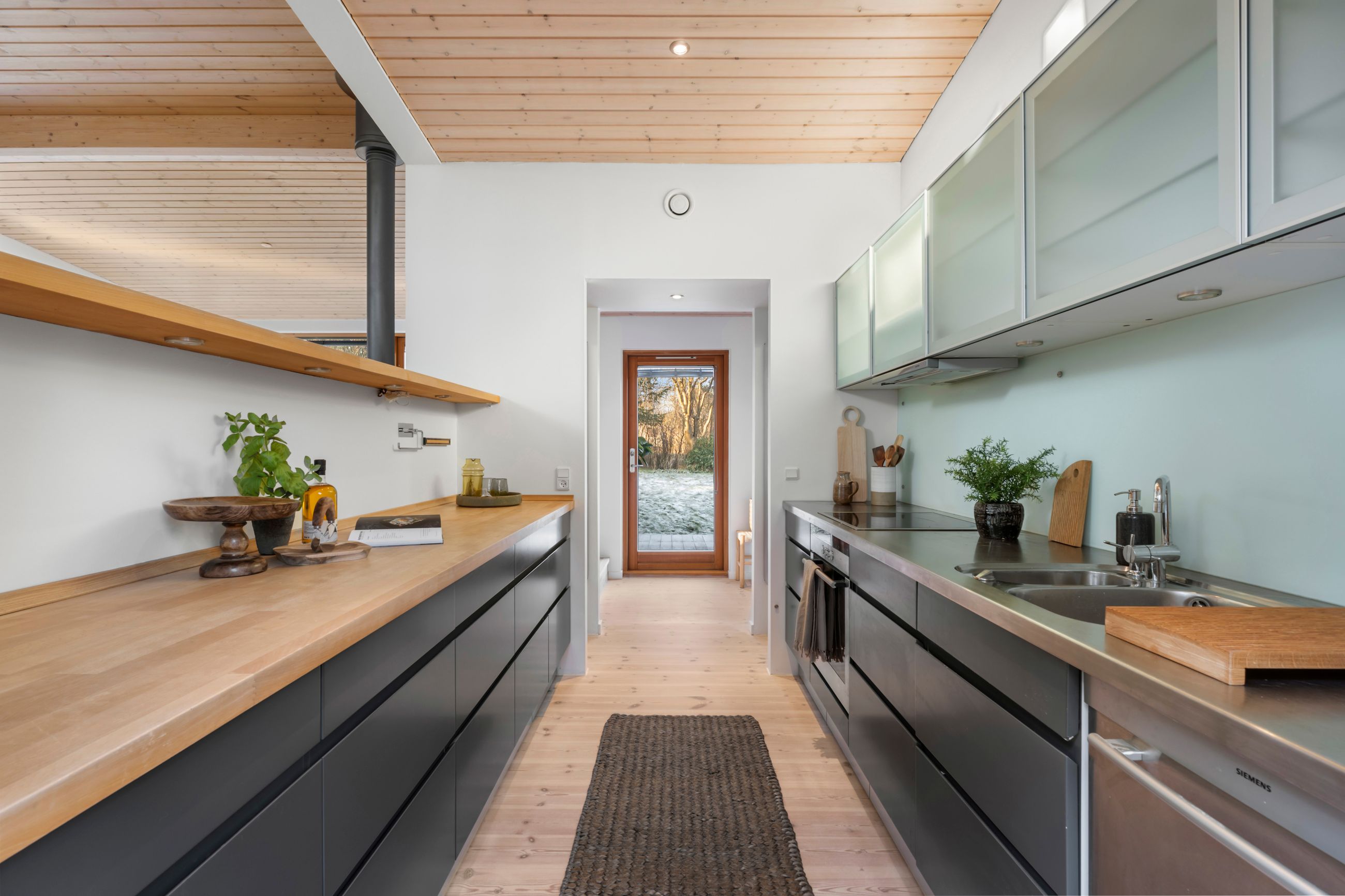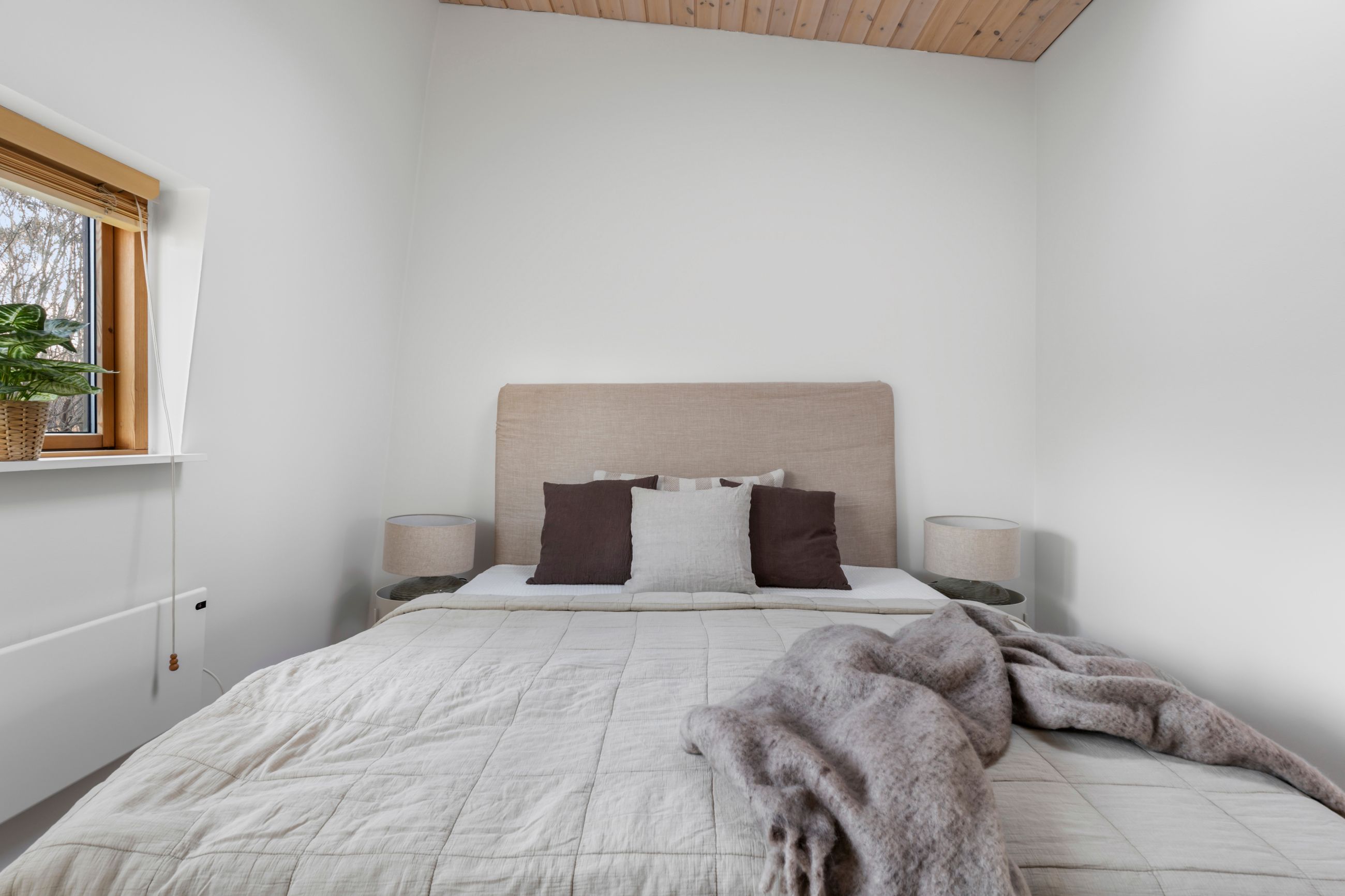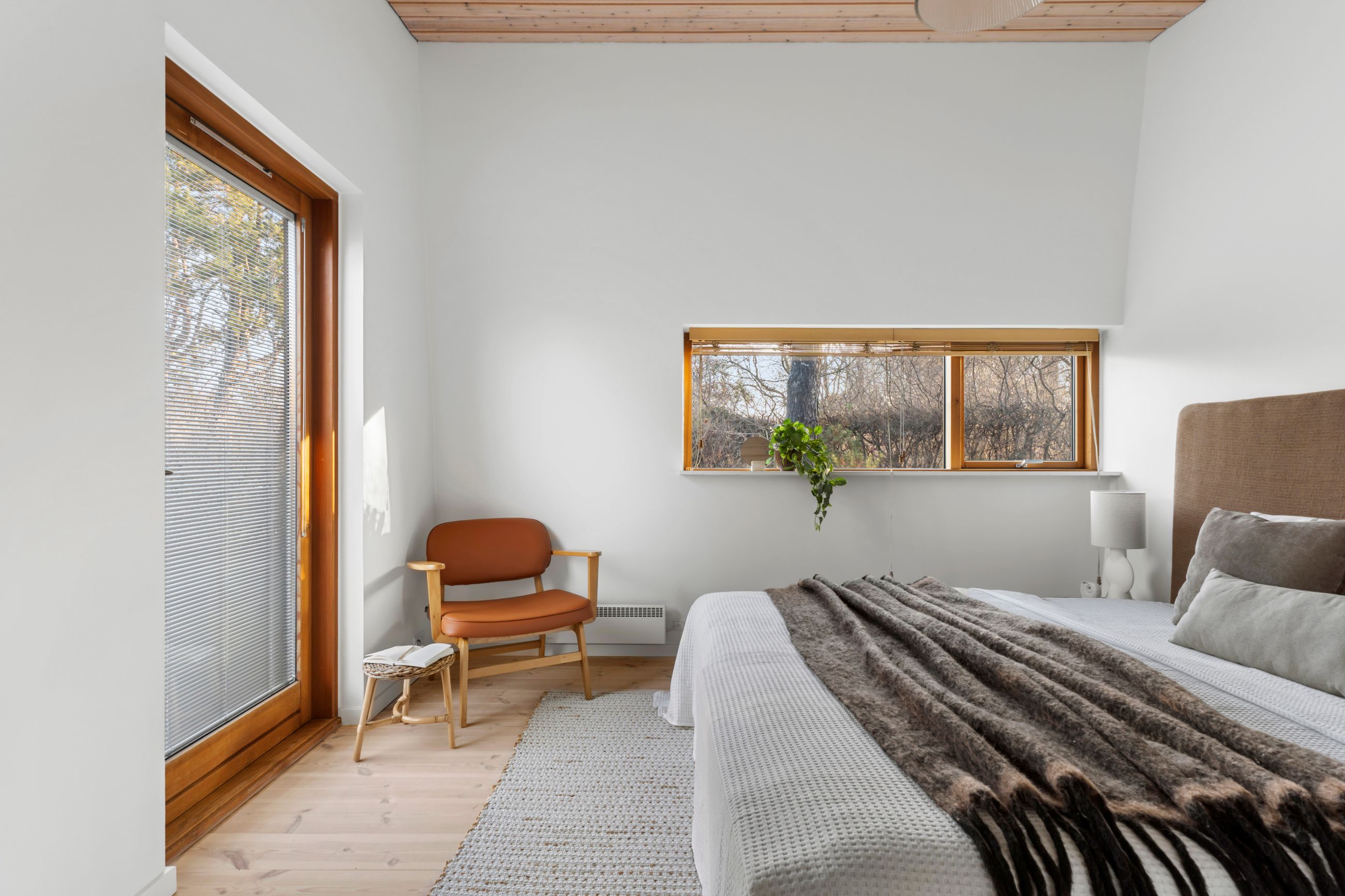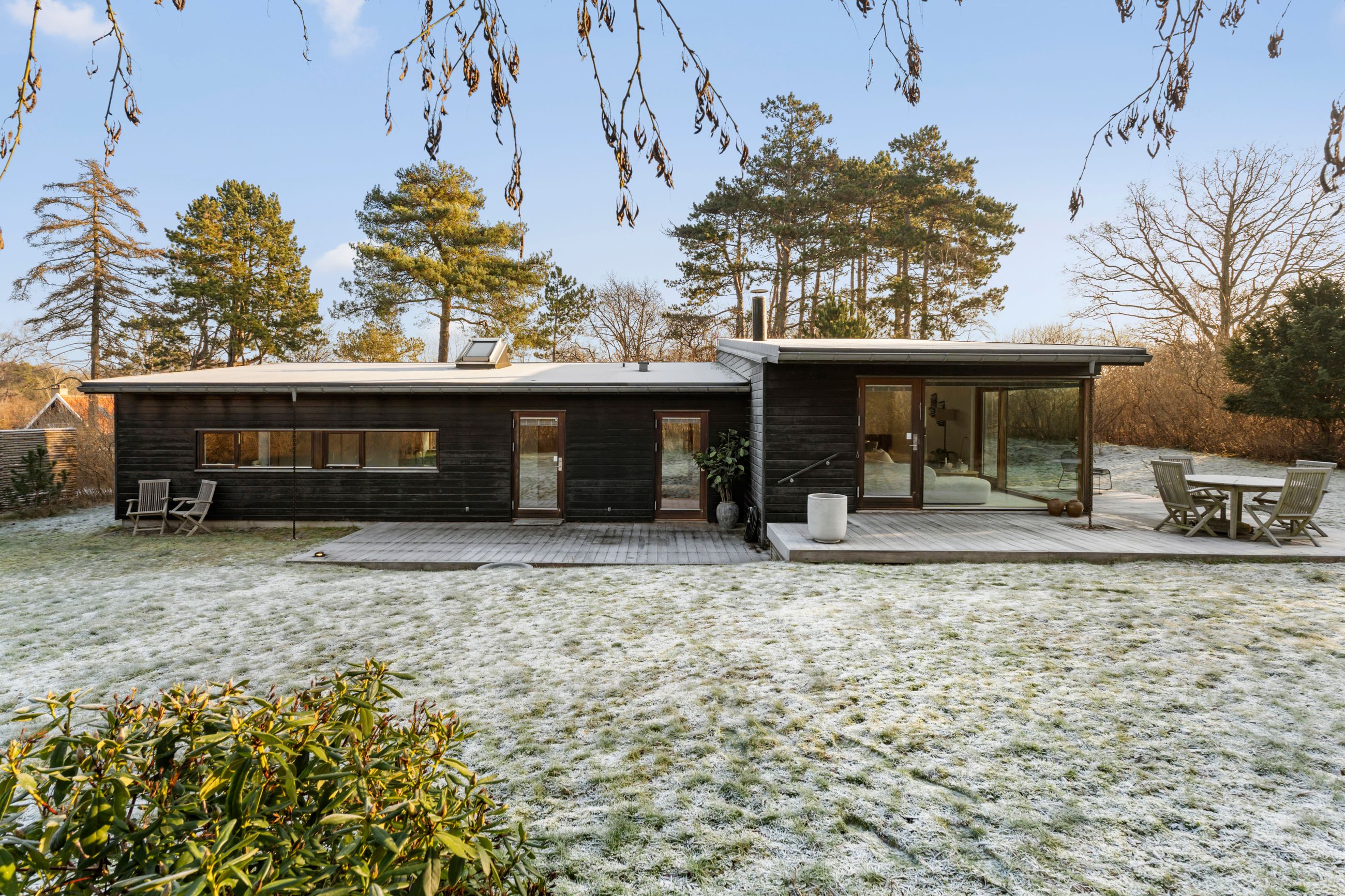 Skæve vinkler, interessante skygger, trappetrin mellem niveauerne fordi terrænet skal respekteres, højt til loftet, masser af lys, varme, glæde, ærlige materialer og fine detaljer. Ja, så ved man, at der har været en arkitekt med kærlighed til sit fag på spil. Som i sommerhuset på Vestvænget 6. Det er et hus, der ikke vil imponere, men omfavne, så stilheden aldrig bliver tom. Det er bygget i 2004 og stadig så ungt, at der ikke er meget vedligeholdelse her de næste mange år. Med 120 m2 er det et stort sommerhus, som med et par soveværelser er ideelt til det modne par, som overvejer at bo her hele året. Huset er bygget til det, det er nemt at varme op, alt er lige til at flytte ind i. Grunden er på 1.207 m2 med en have, der er nem at passe. Pas på når plænen skal klippes, der er pindsvin og dådyrøjne i græsset. Terrassen er syd- og vestvendt, her kan man ligge ugeneret og sole sig med lige så meget tøj på, som man har lyst til. Kun fuglene pifter i flok og blinker med det ene øje, hvis de er mange nok, når de flyver forbi.