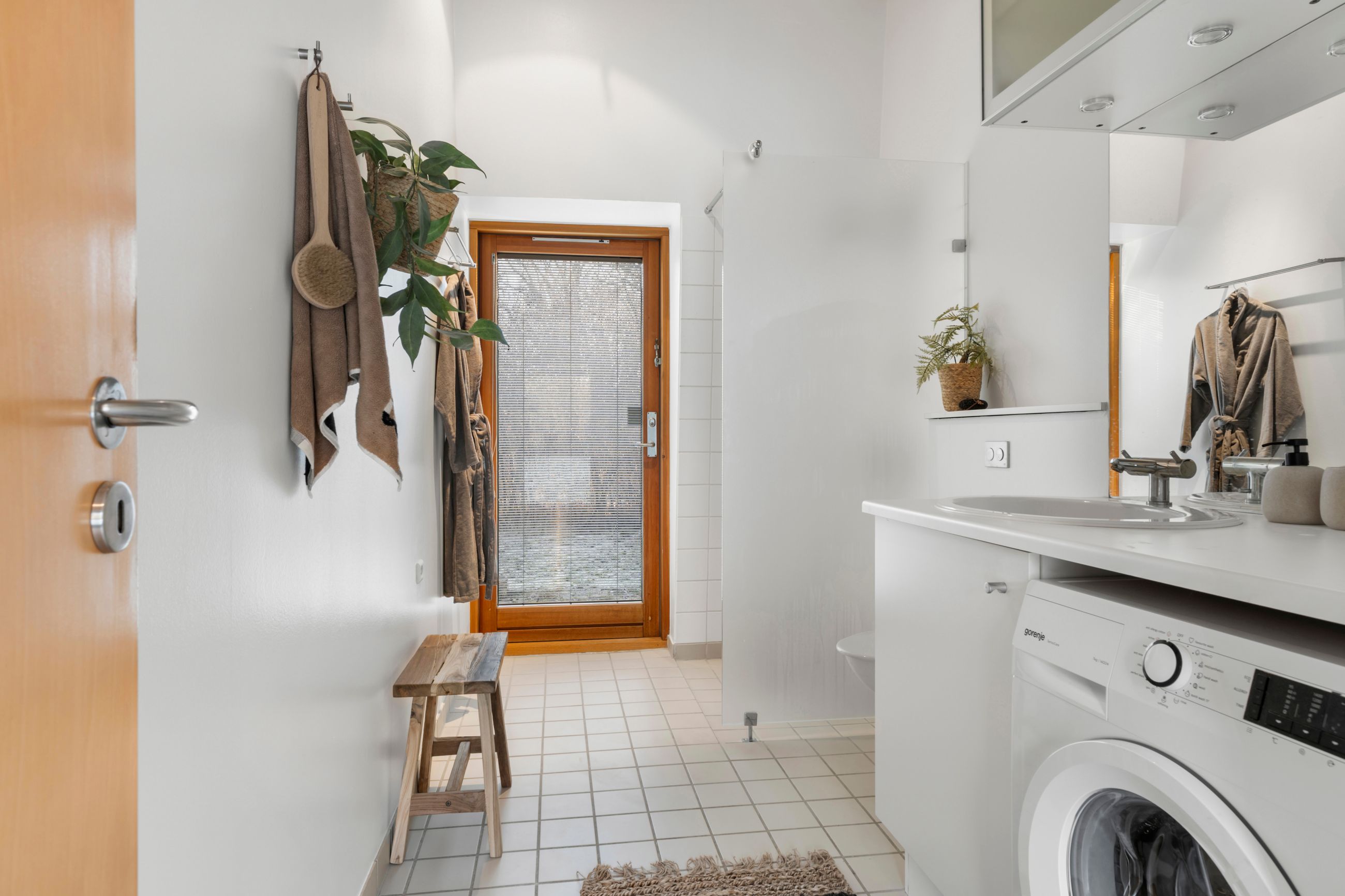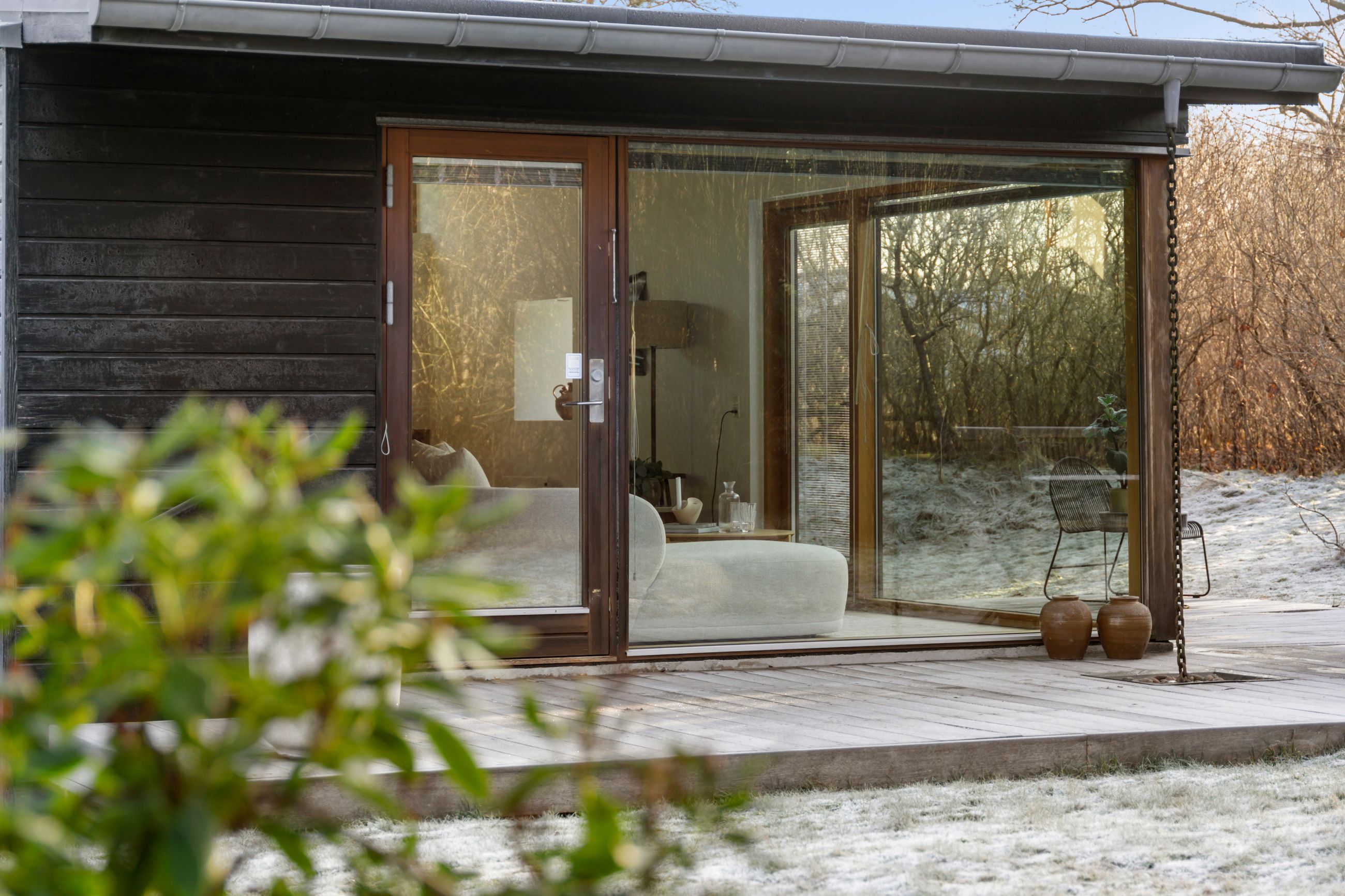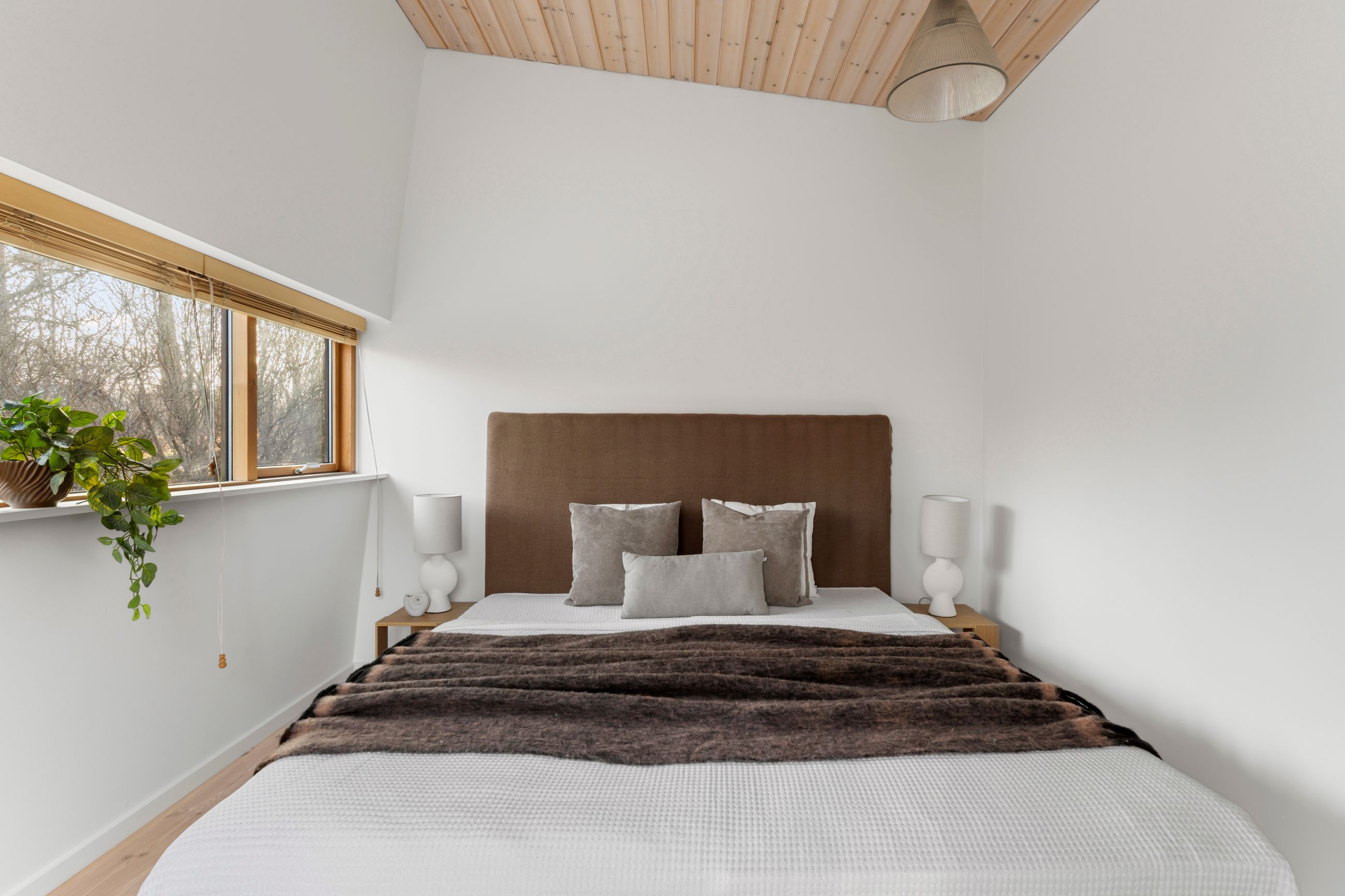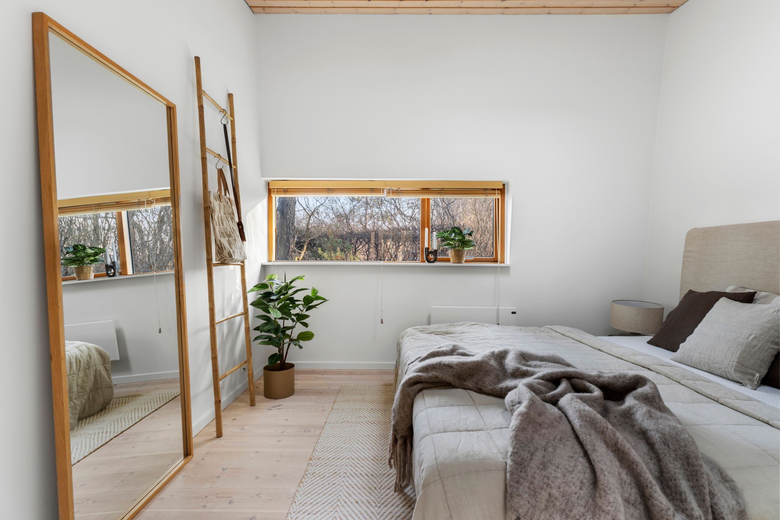 Skæve vinkler, interessante skygger, trappetrin mellem niveauerne fordi terrænet skal respekteres, højt til loftet, masser af lys, varme, glæde, ærlige materialer og fine detaljer. Ja, så ved man, at der har været en arkitekt med kærlighed til sit fag på spil. Som i sommerhuset på Vestvænget 6. Det er et hus, der ikke vil imponere, men omfavne, så stilheden aldrig bliver tom. Det er bygget i 2004 og stadig så ungt, at der ikke er meget vedligeholdelse her de næste mange år. Med 120 m2 er det et stort sommerhus, som med et par soveværelser er ideelt til det modne par, som overvejer at bo her hele året. Huset er bygget til det, det er nemt at varme op, alt er lige til at flytte ind i. Grunden er på 1.207 m2 med en have, der er nem at passe. Pas på når plænen skal klippes, der er pindsvin og dådyrøjne i græsset. Terrassen er syd- og vestvendt, her kan man ligge ugeneret og sole sig med lige så meget tøj på, som man har lyst til. Kun fuglene pifter i flok og blinker med det ene øje, hvis de er mange nok, når de flyver forbi.